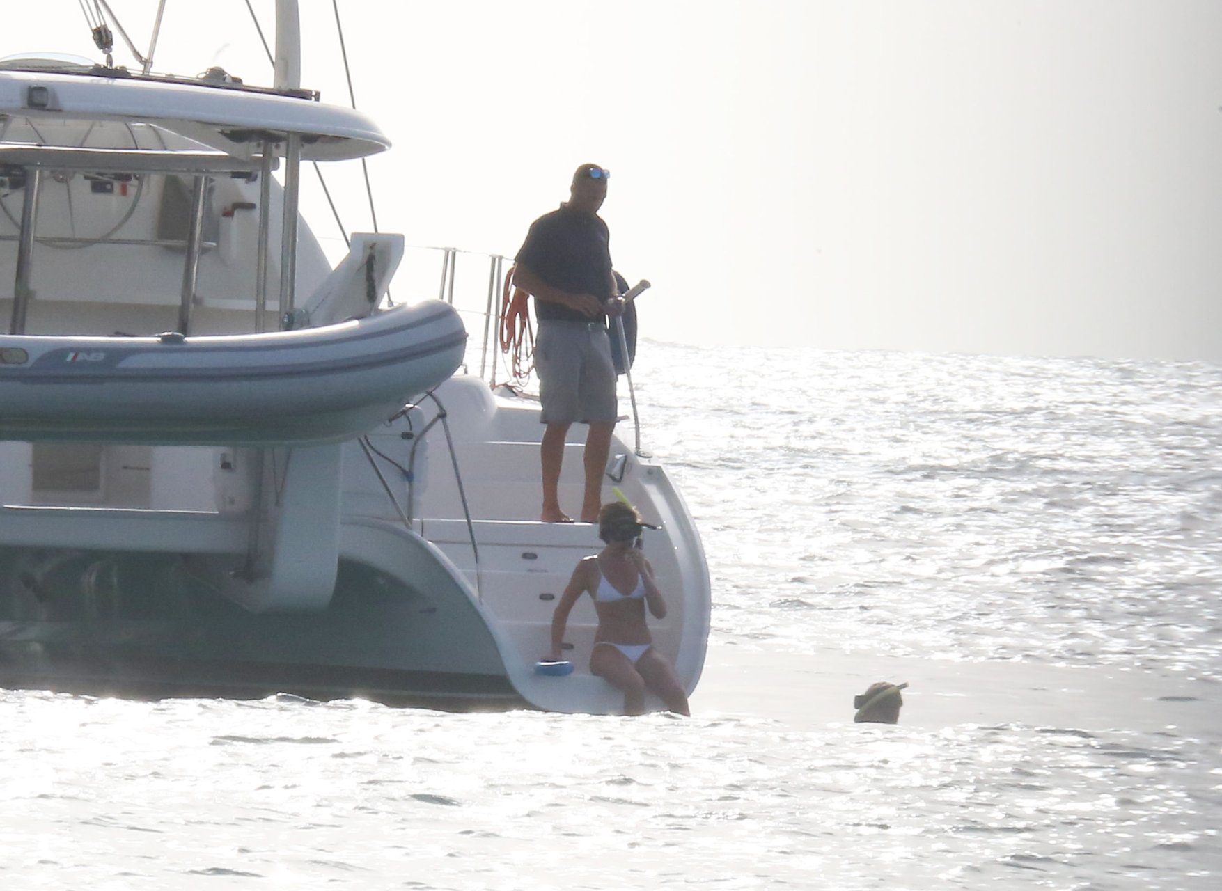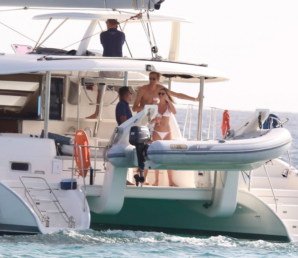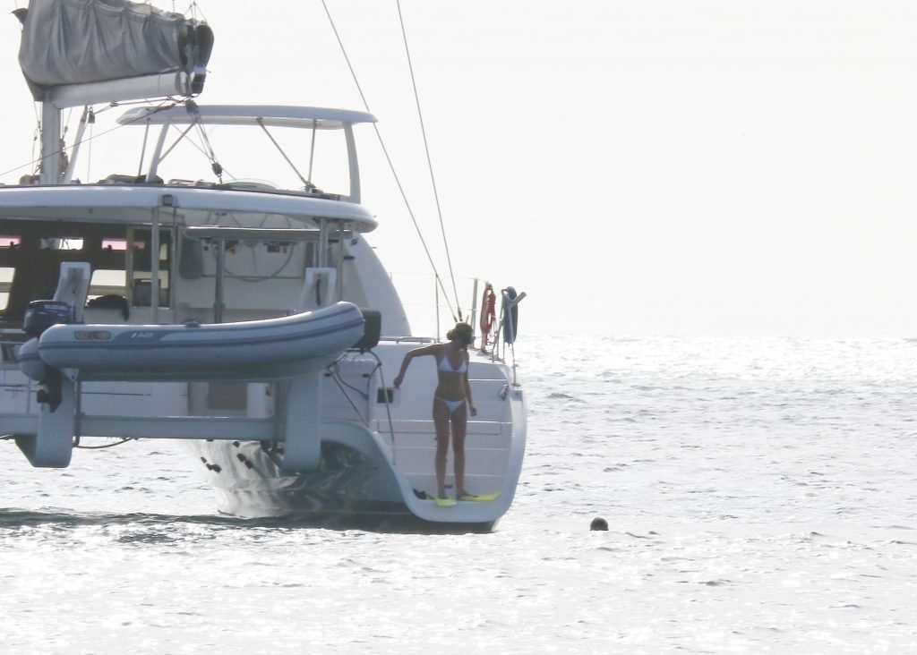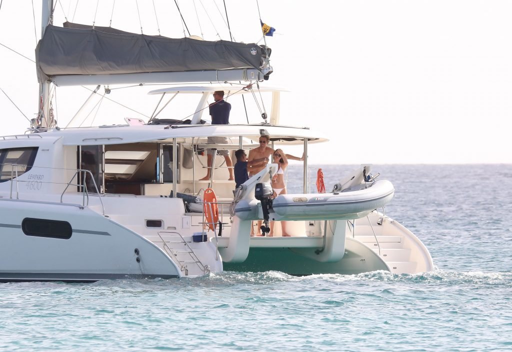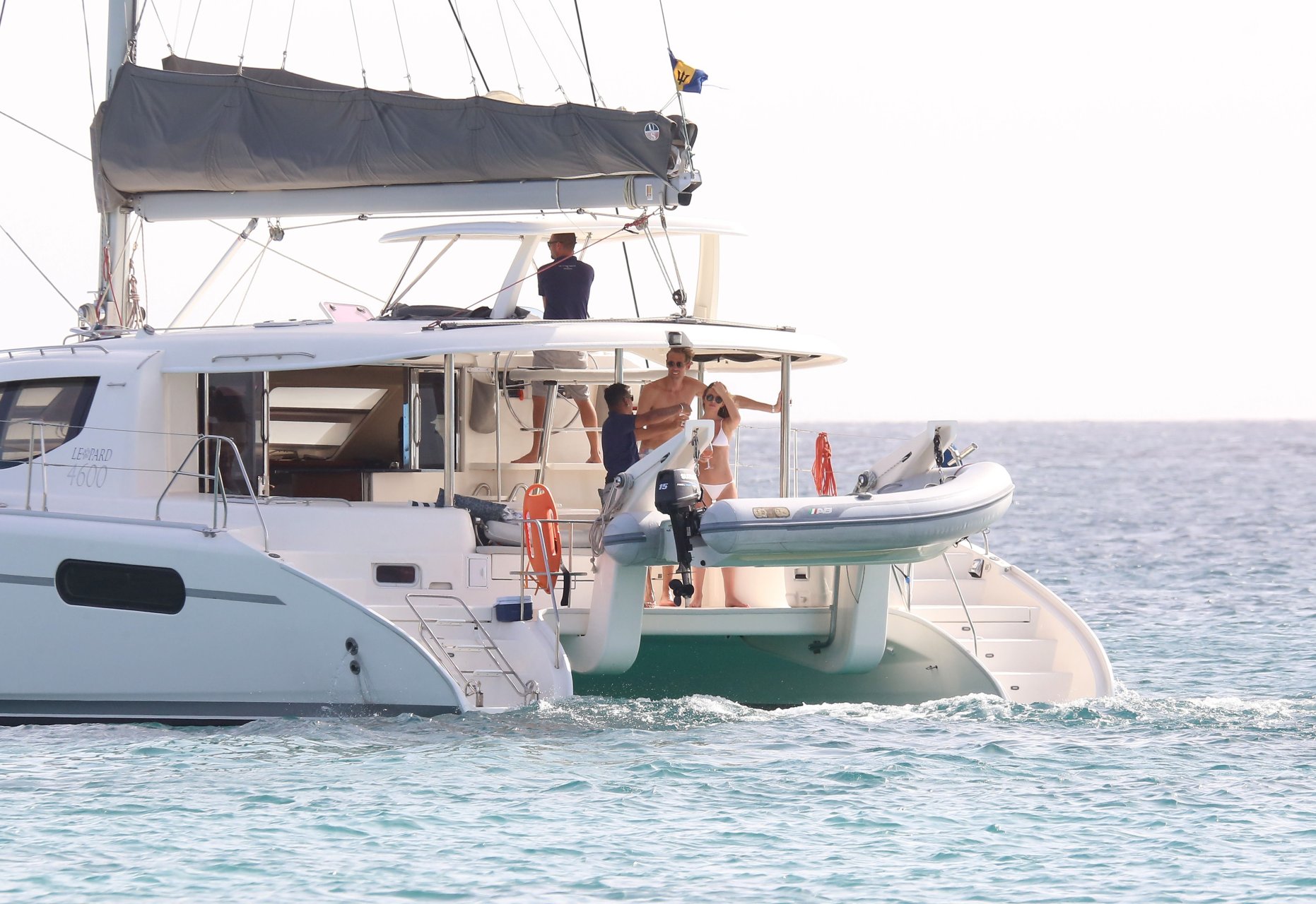 Modella Abbey Clancy (32) che indossa un bikini bianco e suo marito Peter Crouch sono ritratti mentre navigano sul catamarano Seaduced a Barbados, 13/06/2018.