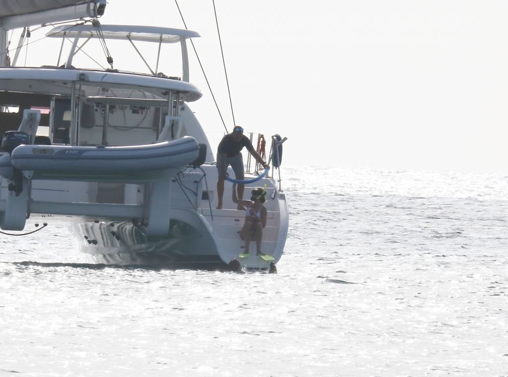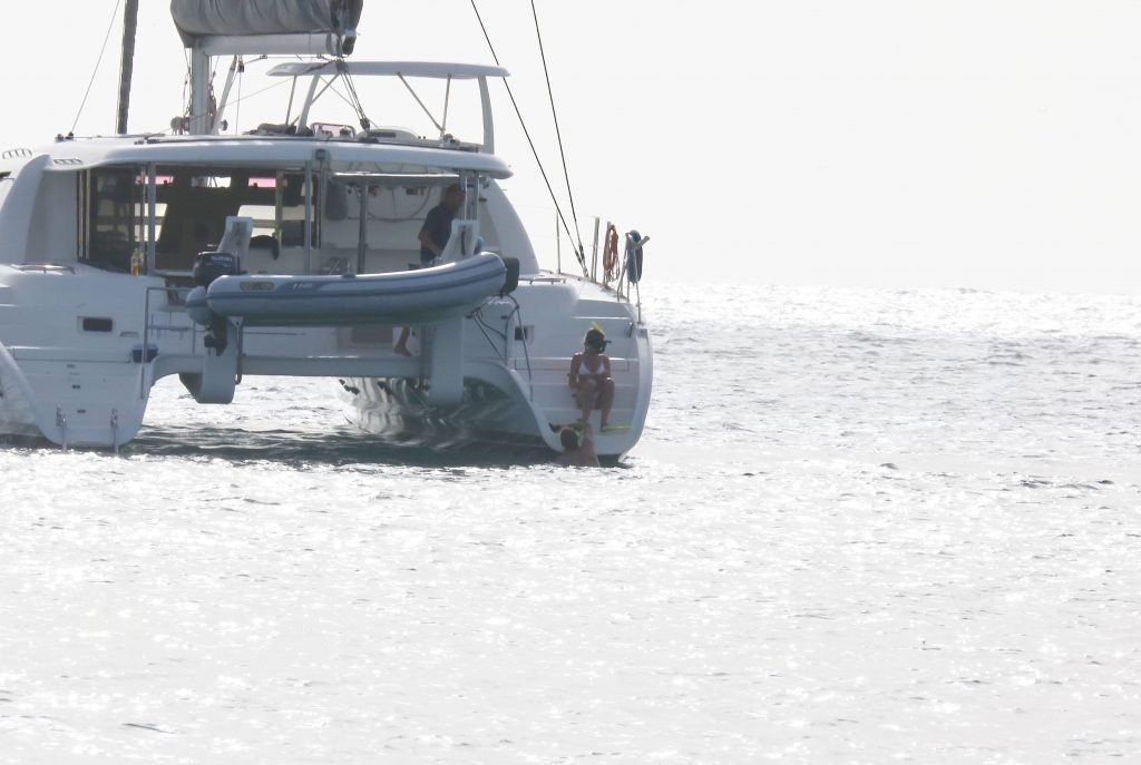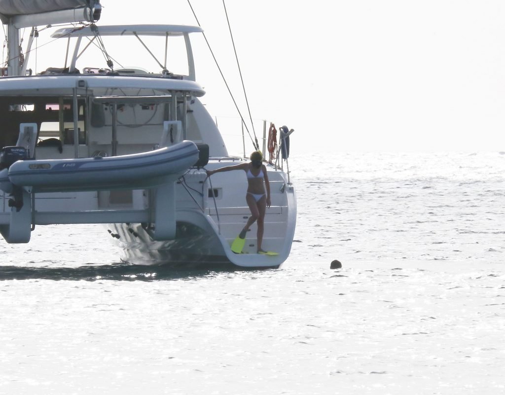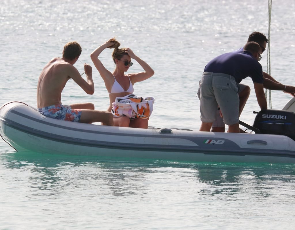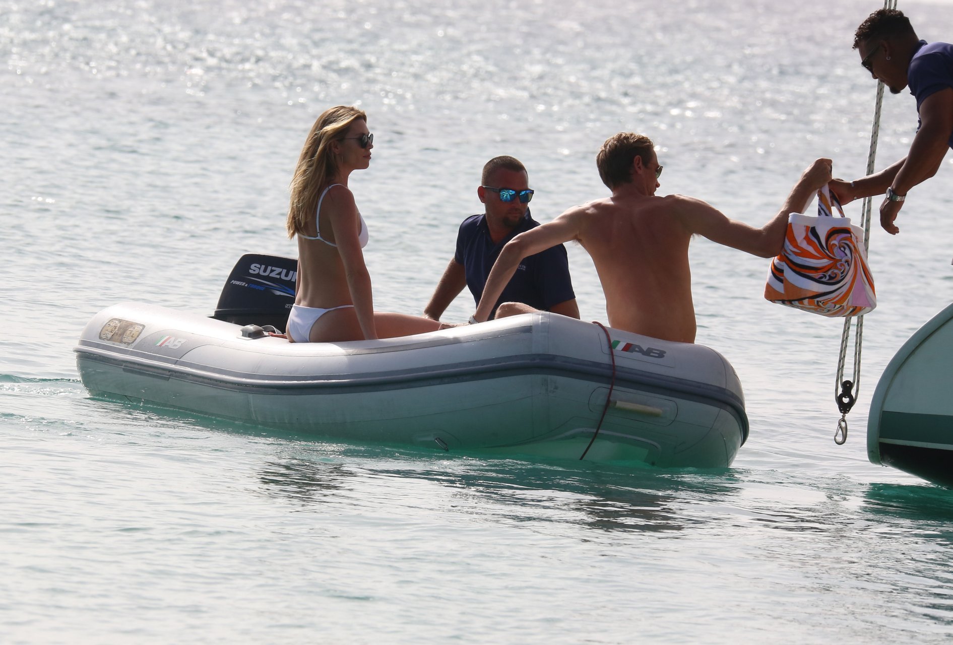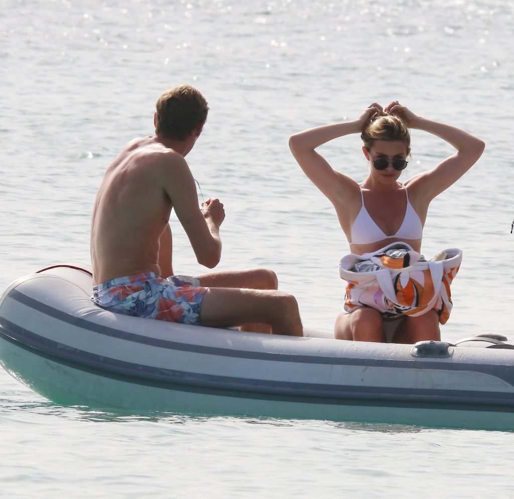 Modella Abbey Clancy (32) che indossa un bikini bianco e suo marito Peter Crouch sono ritratti mentre navigano sul catamarano Seaduced a Barbados, 13/06/2018.