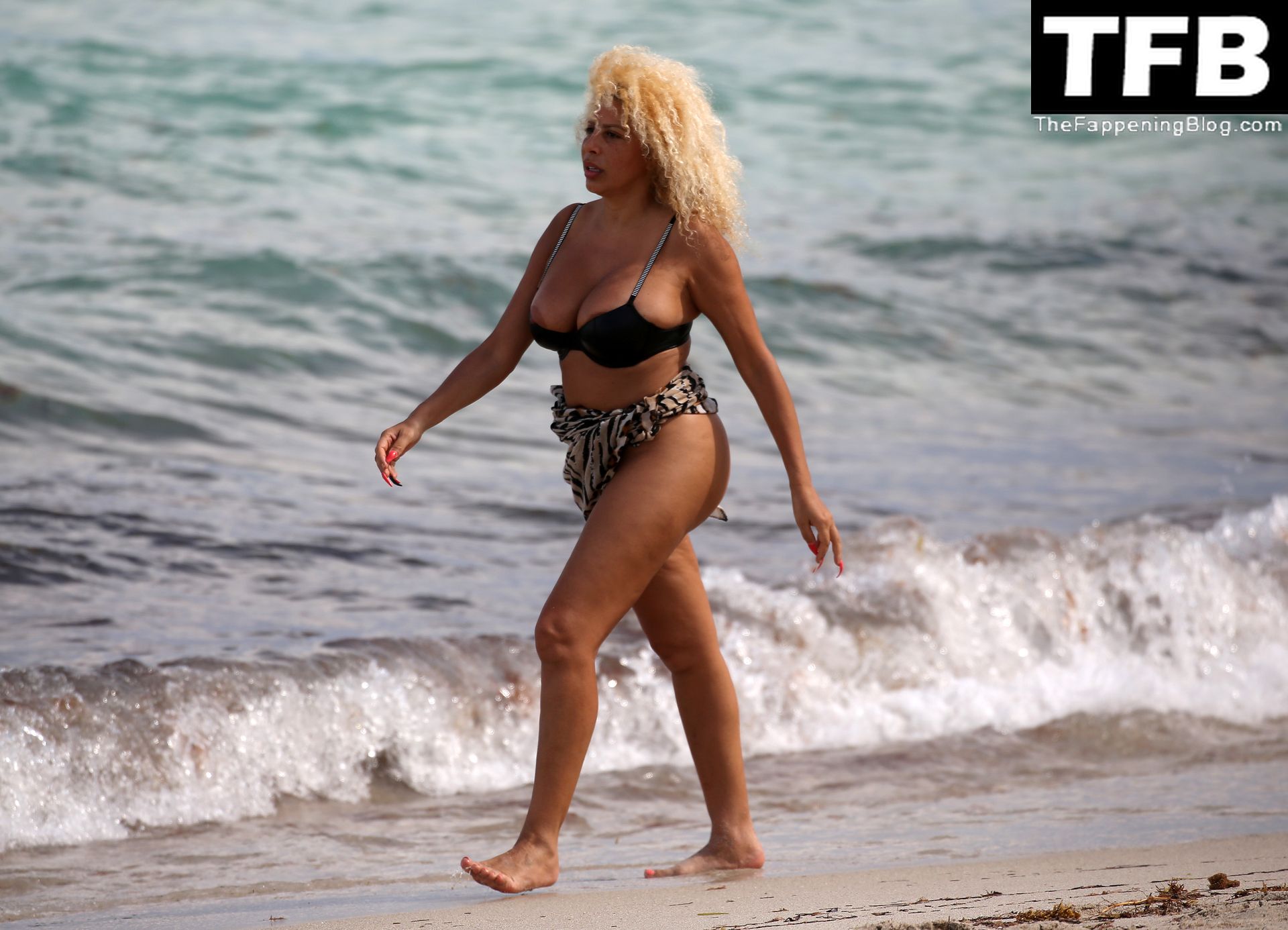 La cantante e attrice francese Afida Turner subisce un incidente di scivolamento del seno in bikini mentre cammina lungo la riva a Miami Beach, 07/04/2022.