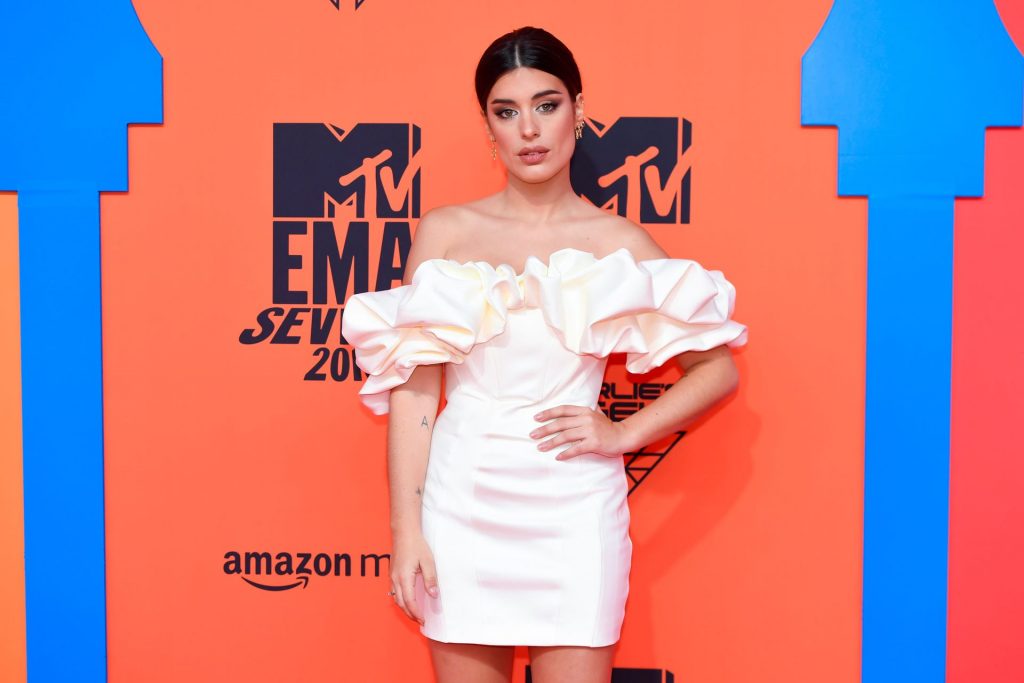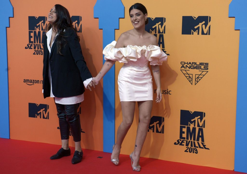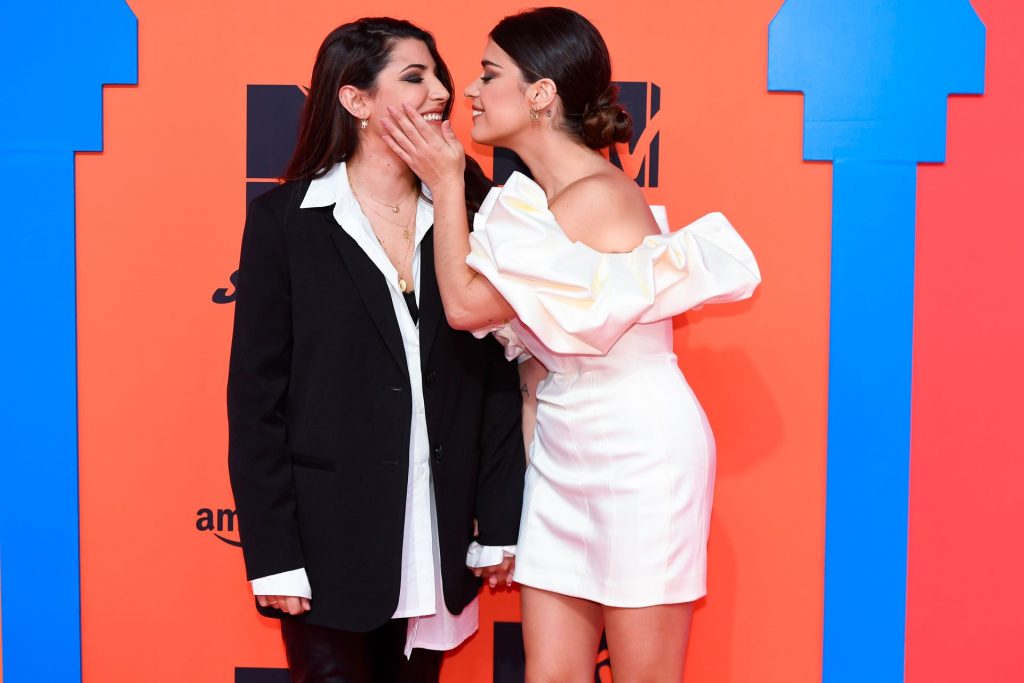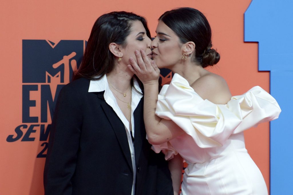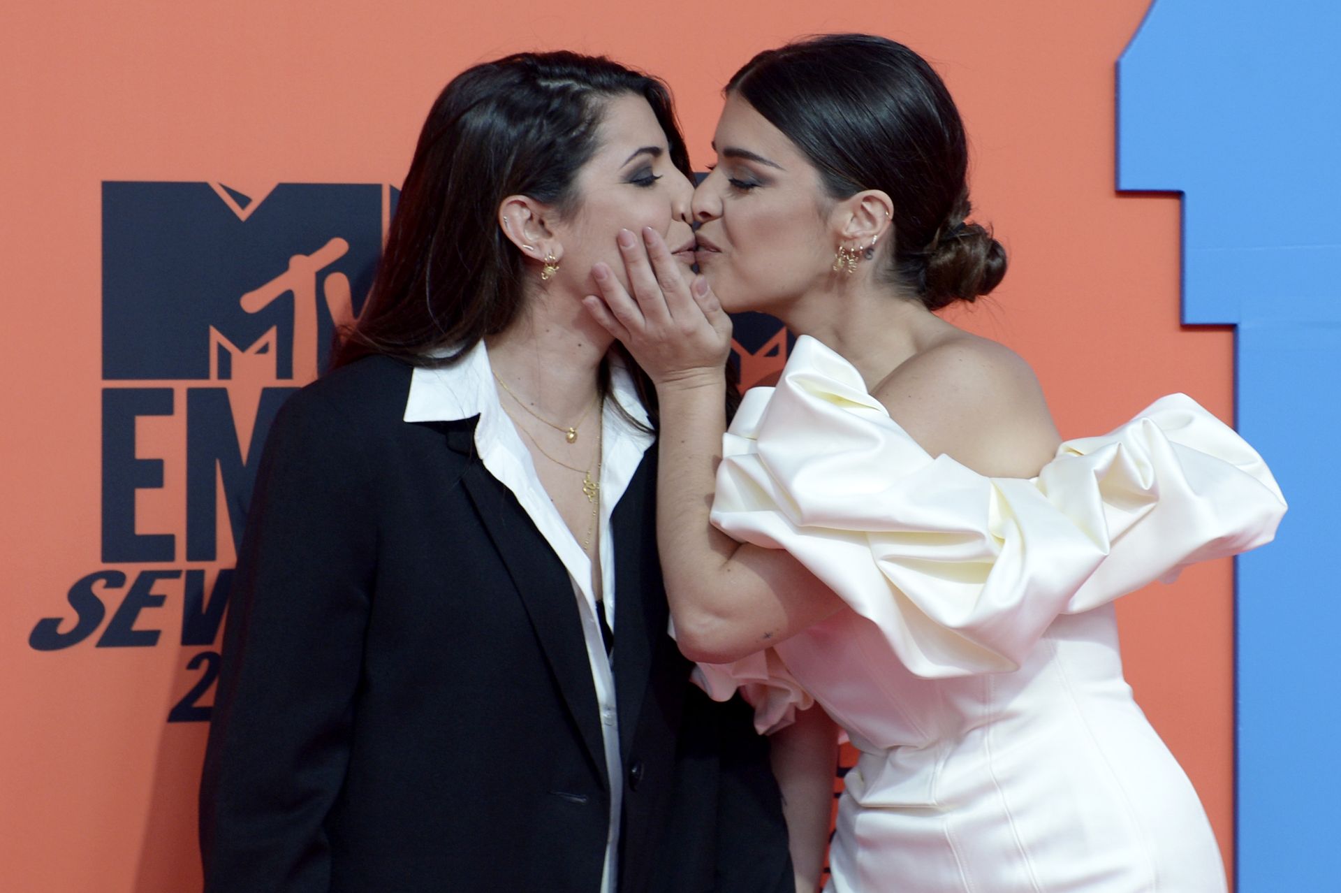 Influencer spagnole Aida Domenech alias Dulceida e la sua partner Alba Paul si baciano sul red carpet al loro arrivo agli MTV Europe Music Awards presso il FIBES Conference and Exhibition Centre di Siviglia, 11/03/2019.