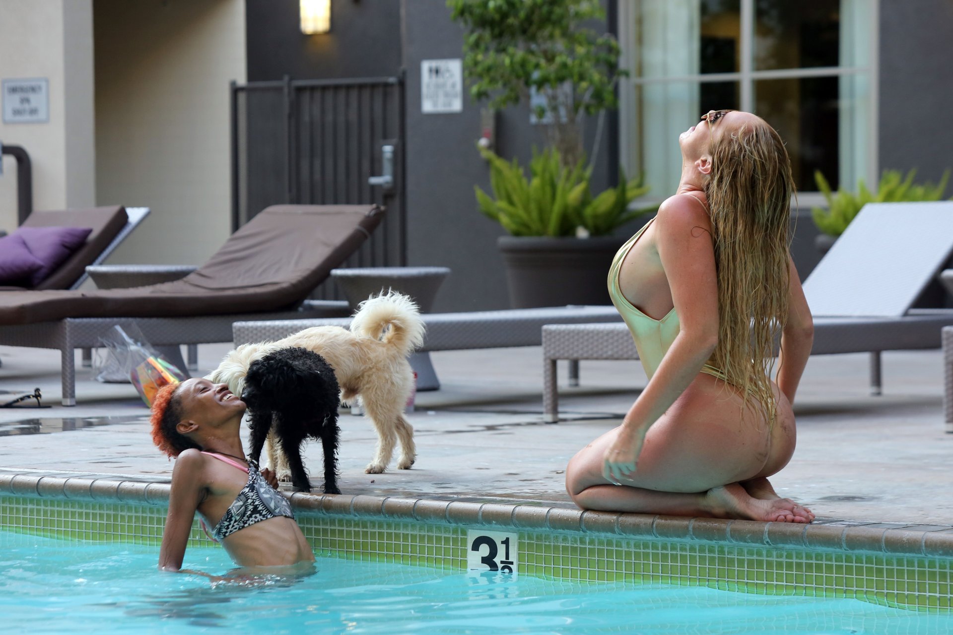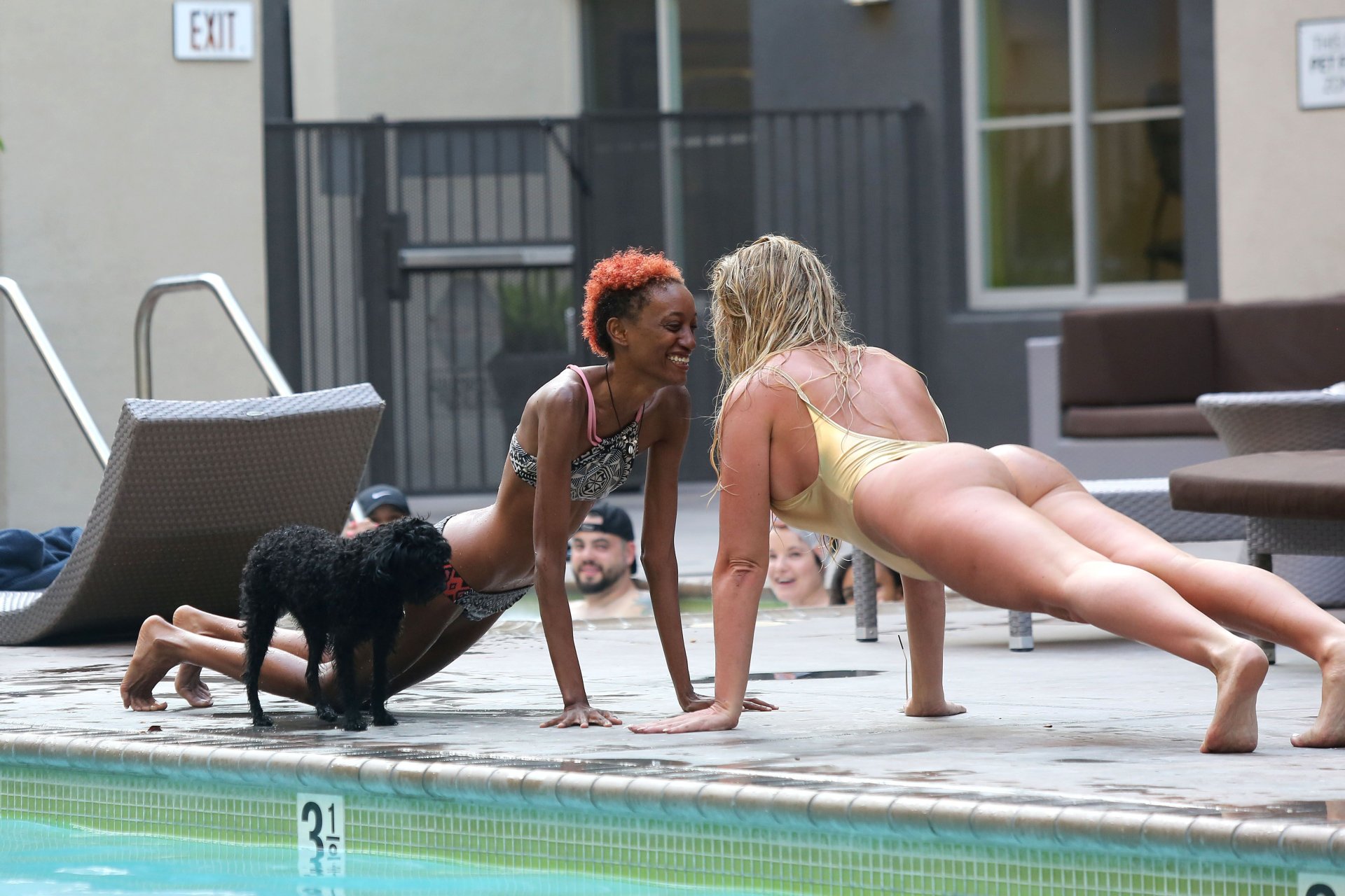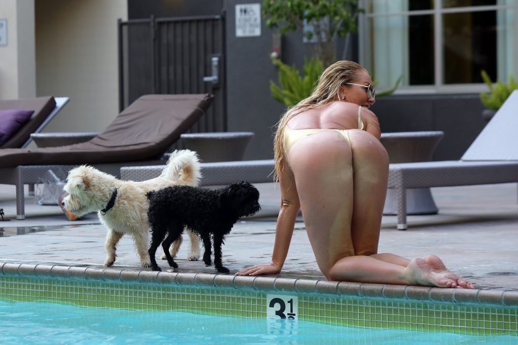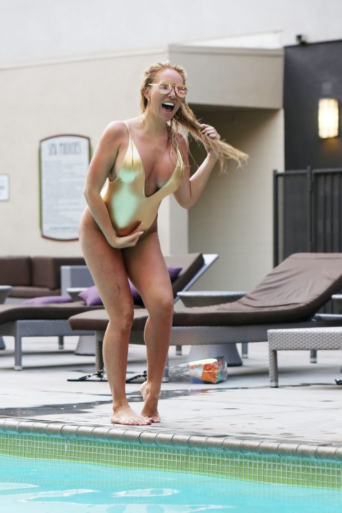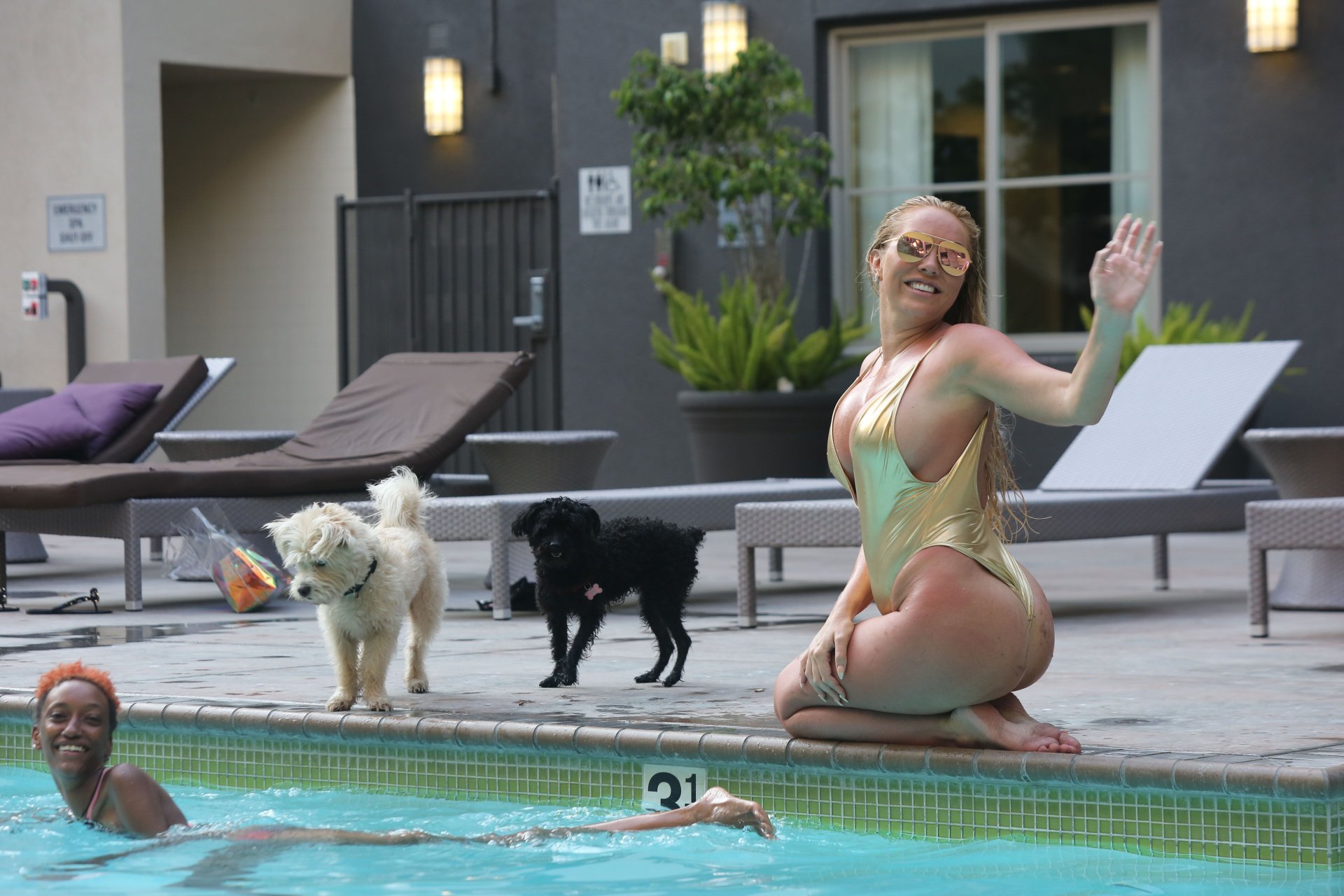 Aisleyne Horgan-Wallace sfrigola al sole a bordo piscina indossando un bikini dorato a Los Angeles, 30/06/2107. Aisleyne Horgan-Wallace è una modella, stilista, attrice, columnist di riviste, personaggio televisivo (Big Brother). Età – 38.