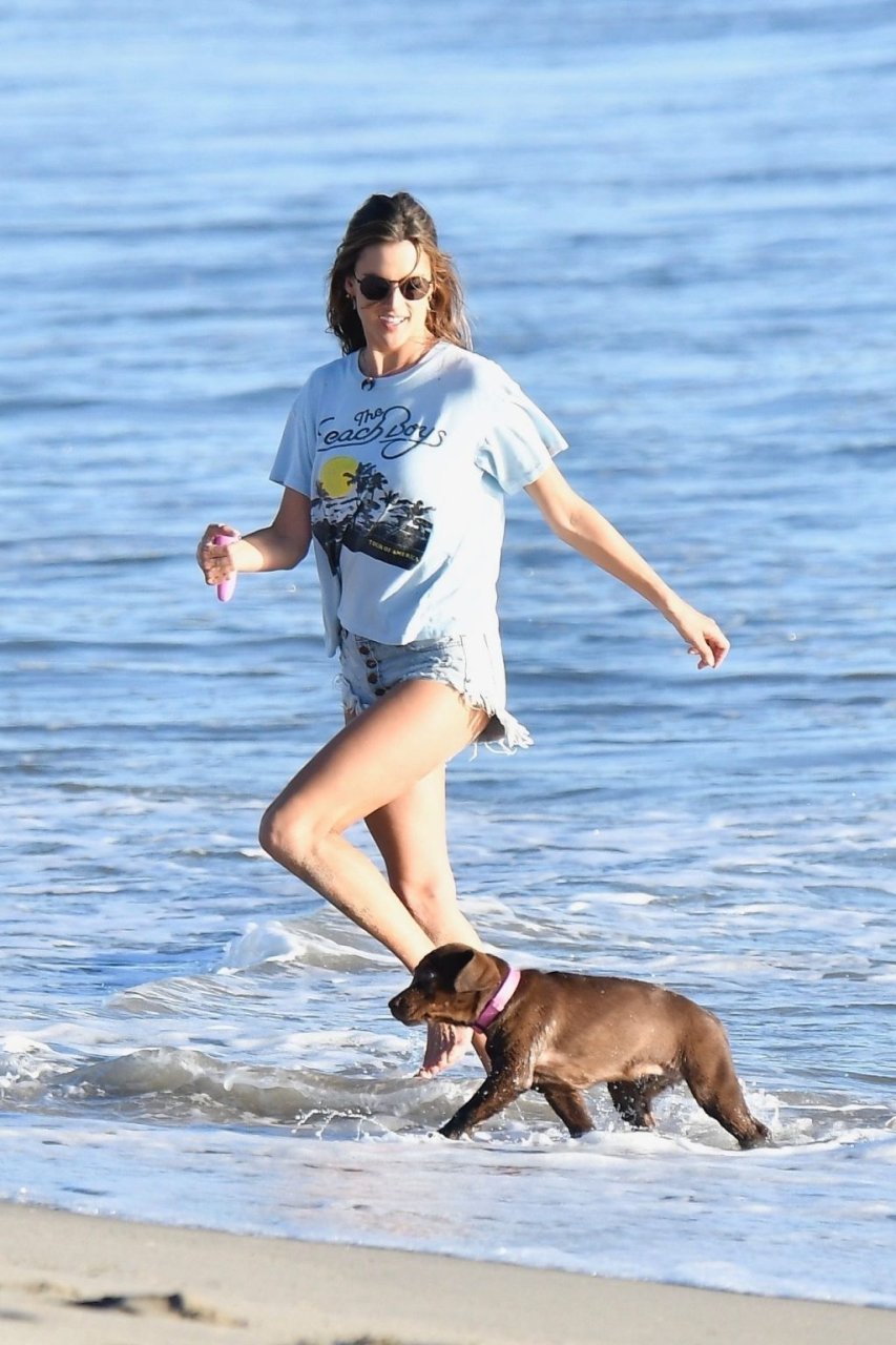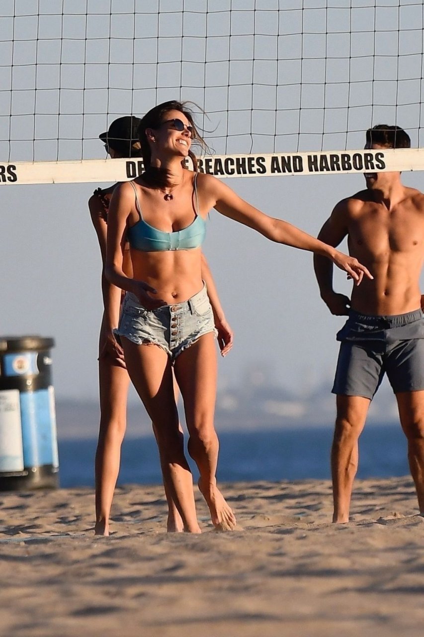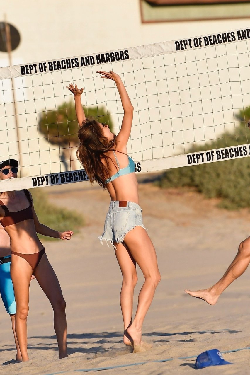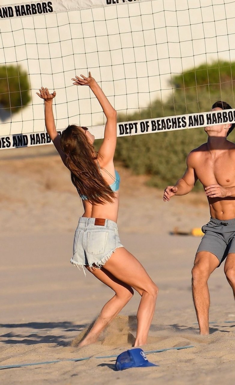 La modella brasiliana Alessandra Ambrosio trascorre la sua domenica godendosi la brezza fresca e mantenendosi attiva con la sua famiglia e i suoi amici giocando a pallavolo sulla spiaggia di Santa Monica, 20/10/2019.