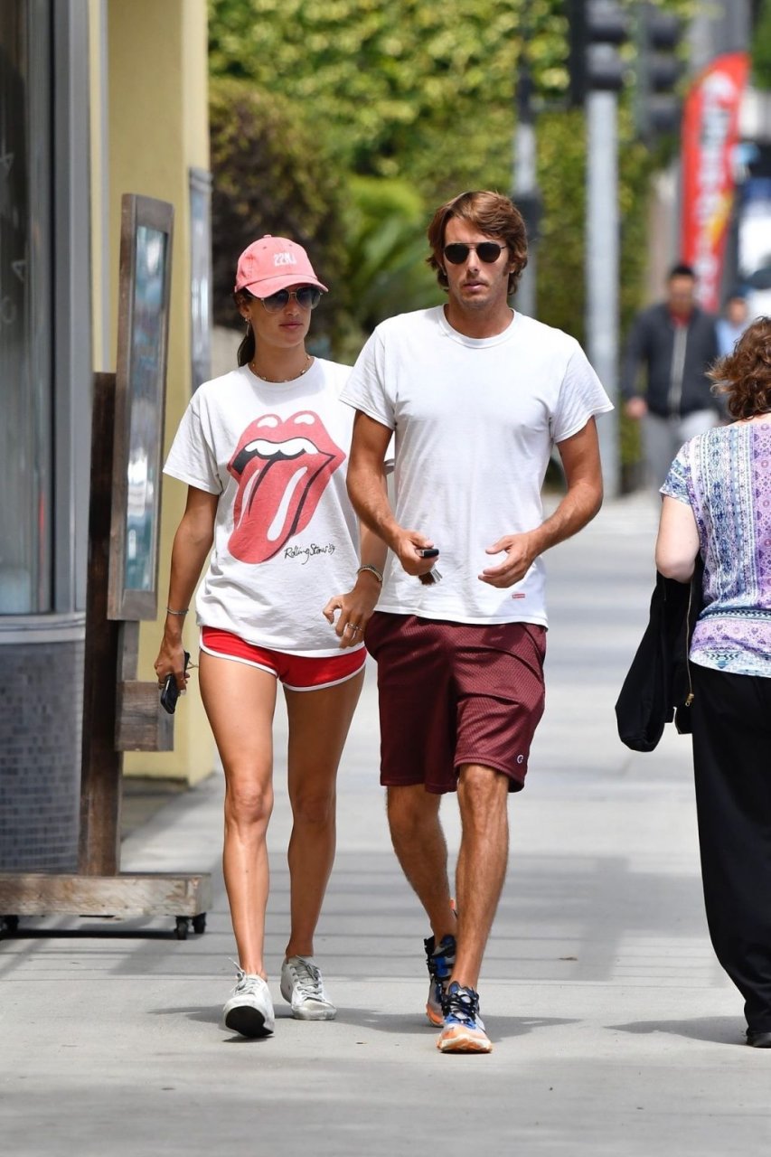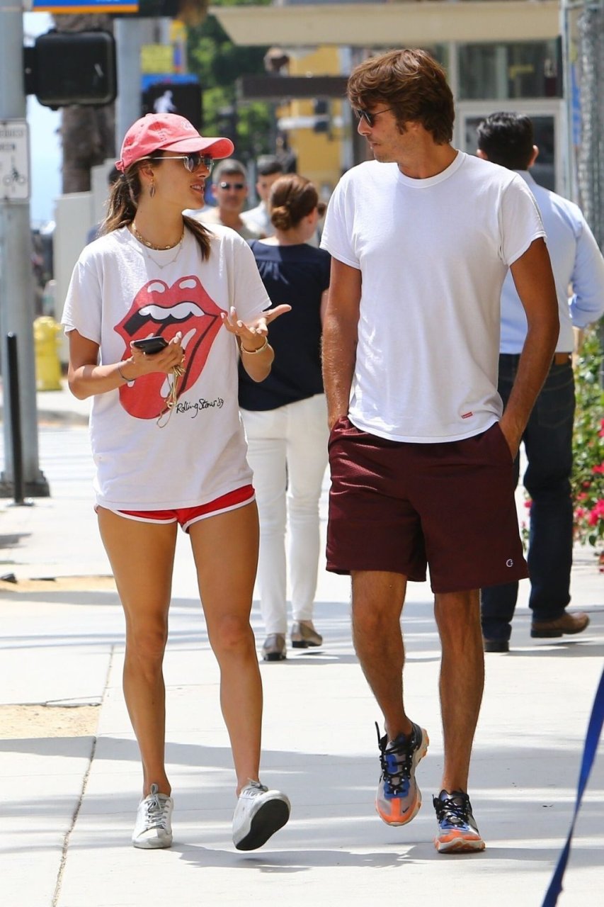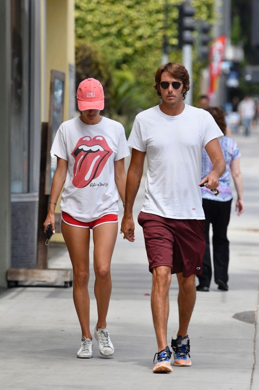 La supermodella brasiliana Alessandra Ambrosio e il suo compagno Nicolo Oddi si dirigono a pranzo a Santa Monica da Tocaya Organica, 22/08/2019. Alessandra indossa una maglietta dei Rolling Stones con pantaloncini corti rossi e un cappello rosso per il suo pranzo.