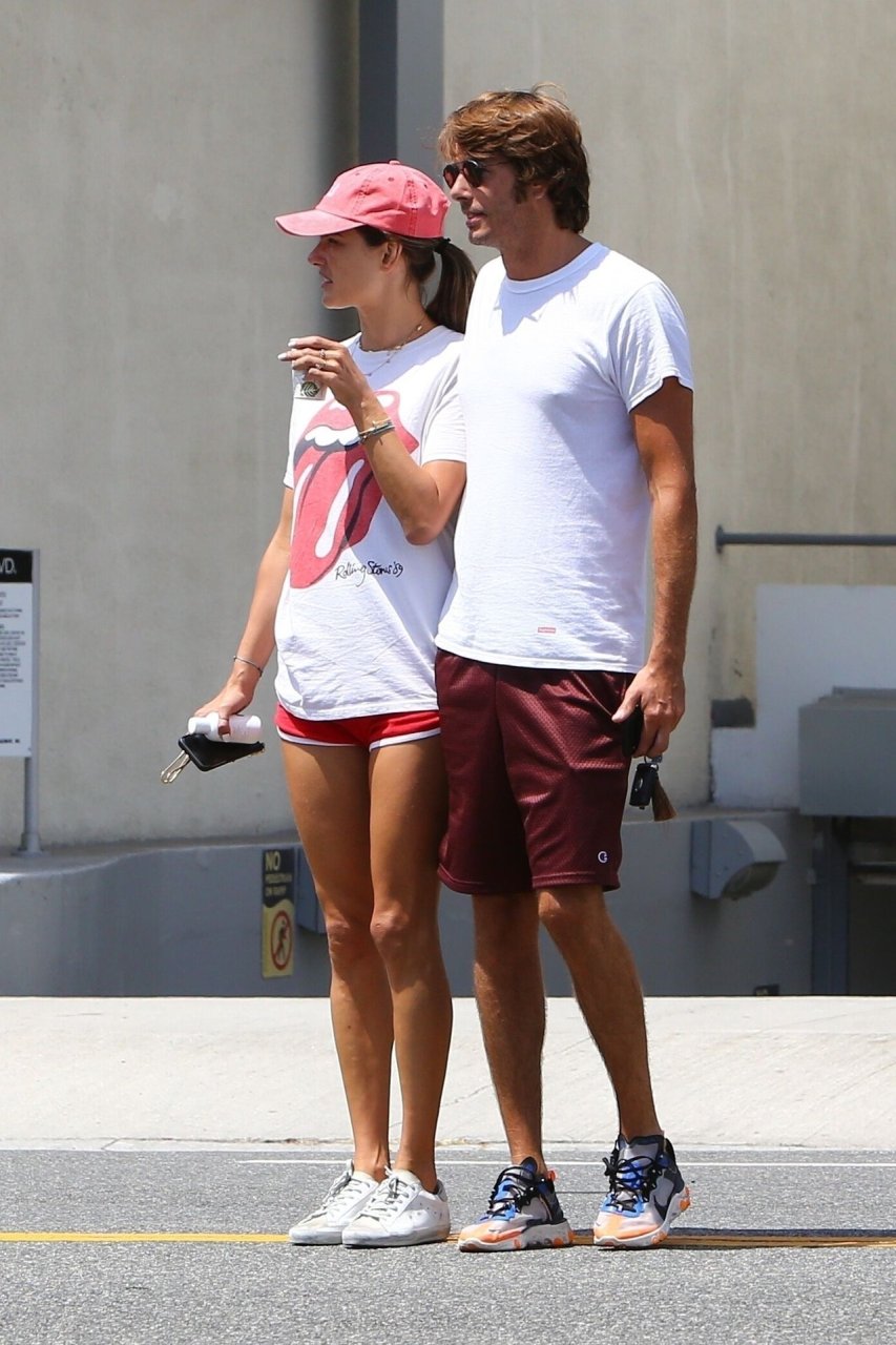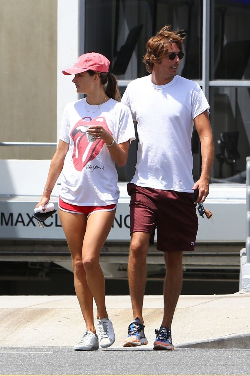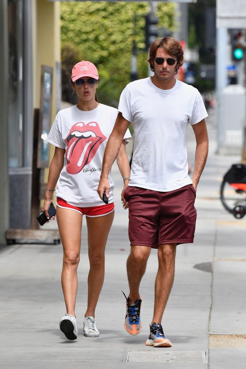 La supermodella brasiliana Alessandra Ambrosio e il suo compagno Nicolo Oddi si dirigono a pranzo a Santa Monica da Tocaya Organica, 22/08/2019. Alessandra indossa una maglietta dei Rolling Stones con pantaloncini corti rossi e un cappello rosso per il suo pranzo.