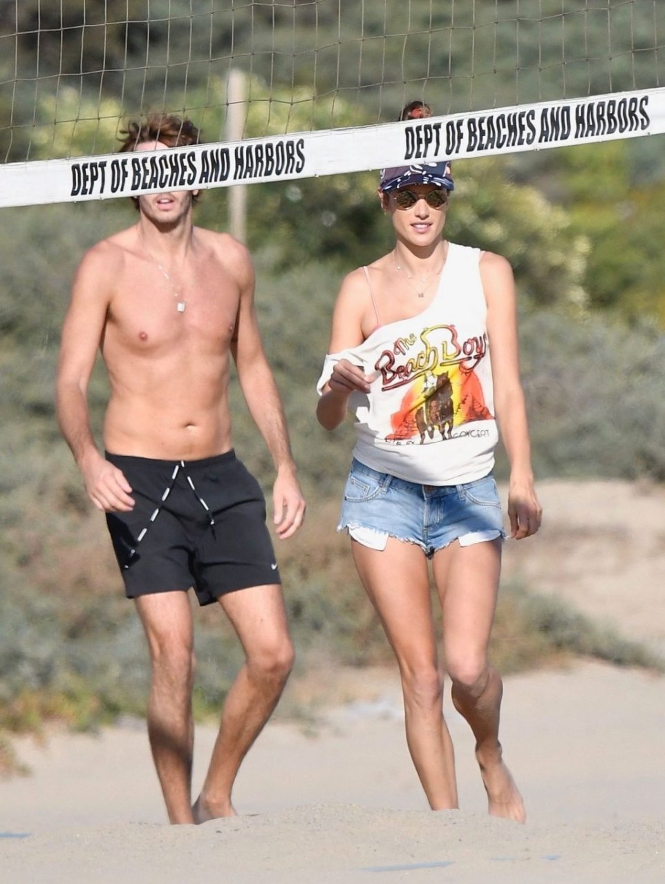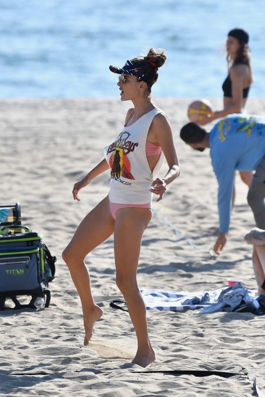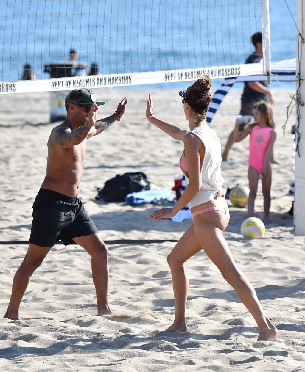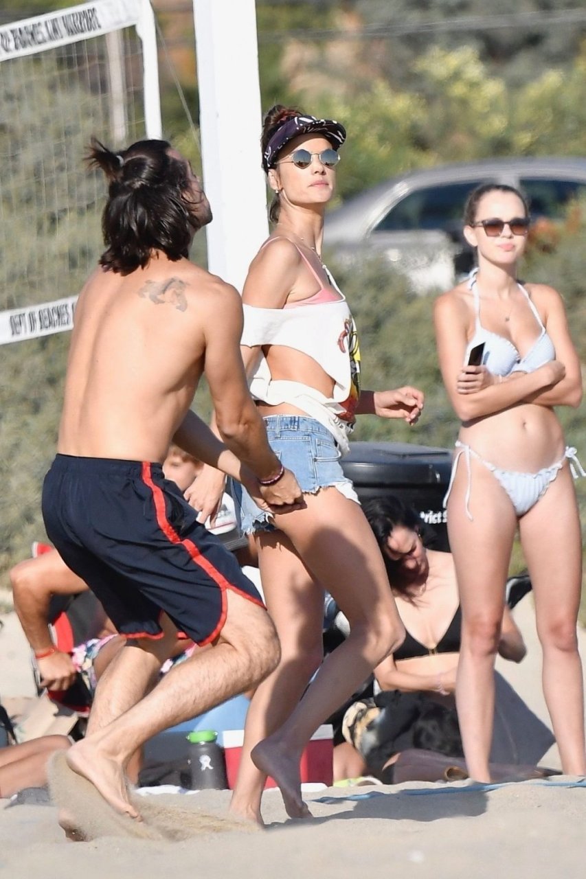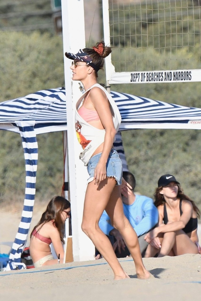 Alessandra Ambrosio si gode un bellissimo pomeriggio di sabato giocando a pallavolo sulla spiaggia di Santa Monica con i suoi figli, il fidanzato Nicolo Oddi e gli amici, 13/10/2019. La bomba brasiliana di 38 anni sembrava divertirsi molto con un enorme sorriso sul volto.