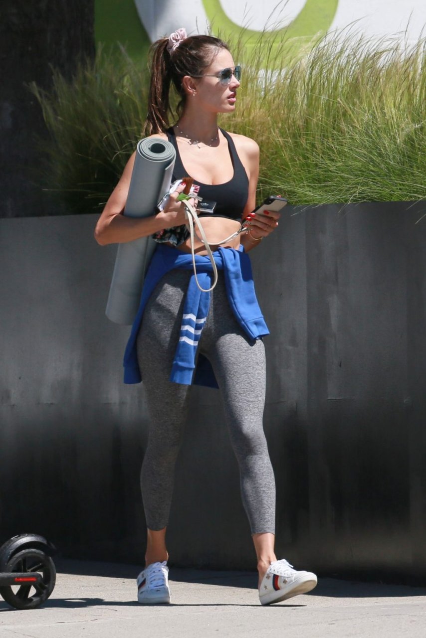 Alessandra Ambrosio mostra i suoi addominali tonici con un reggiseno sportivo nero mentre esce da una lezione di yoga a Los Angeles, 20/05/2019. La splendida modella appariva naturale senza trucco e con i capelli raccolti in uno scrunchie mentre aveva le mani occupate con il suo tappetino da yoga e il telefono mentre usciva dalla lezione. Indossando leggings grigi e un reggiseno sportivo nero, Alessandra chiacchierava al telefono mentre si dirigeva verso la sua auto.