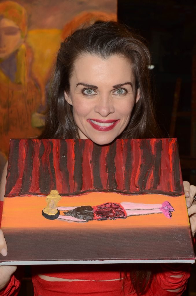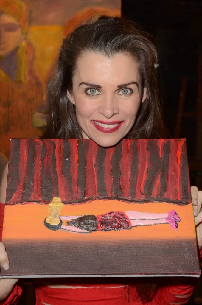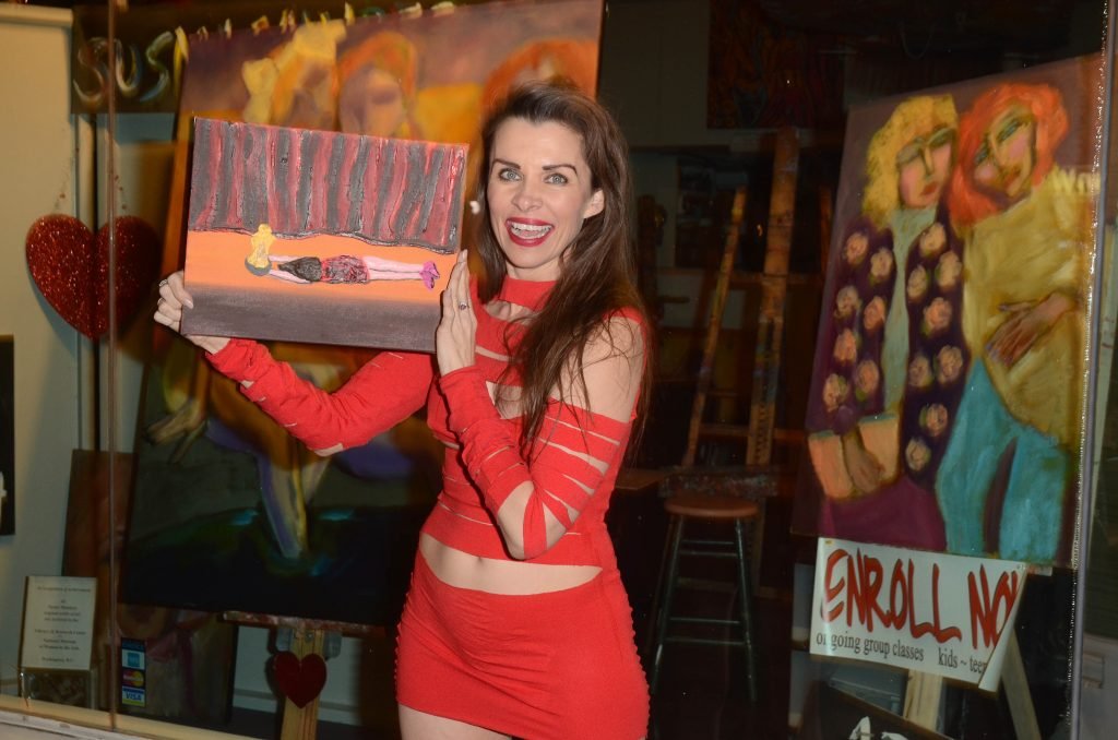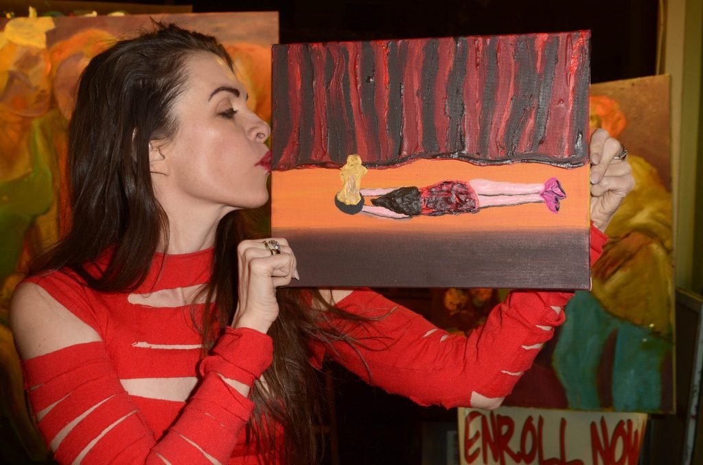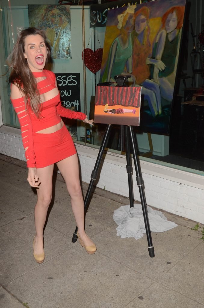 L’attrice di Baywatch Alicia Arden si cambia in un vestito succinto per svelare alla stampa il dipinto vincente, una rappresentazione di lei che muore sul palco mentre riceve un Oscar in un concorso sui social media – Los Angeles, 01/05/2018.