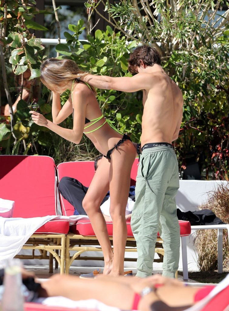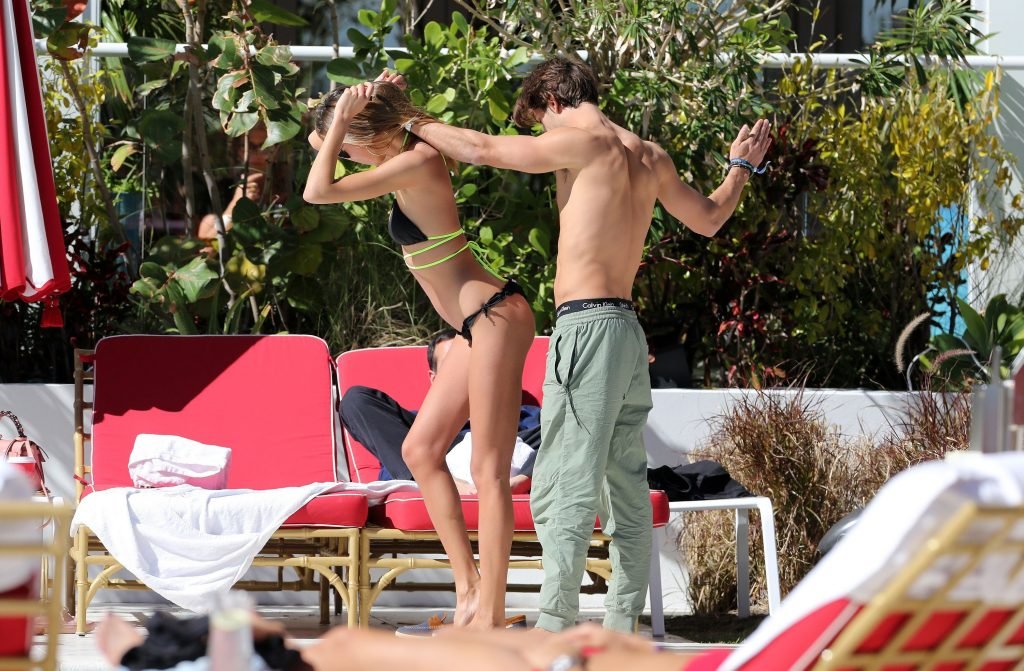 La modella Alina Baikova (28) prende il sole topless a bordo piscina a Miami Beach, 12/10/2017.