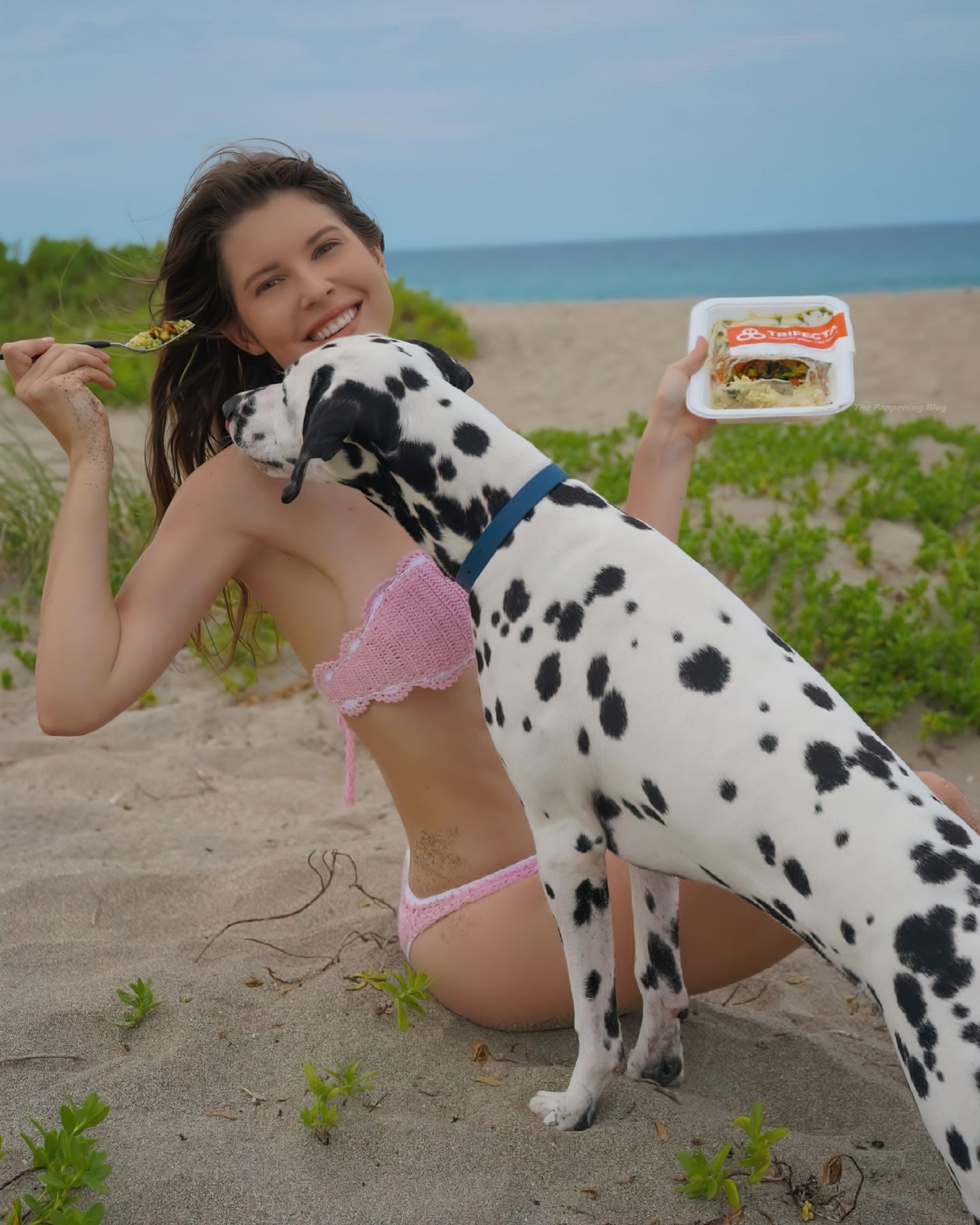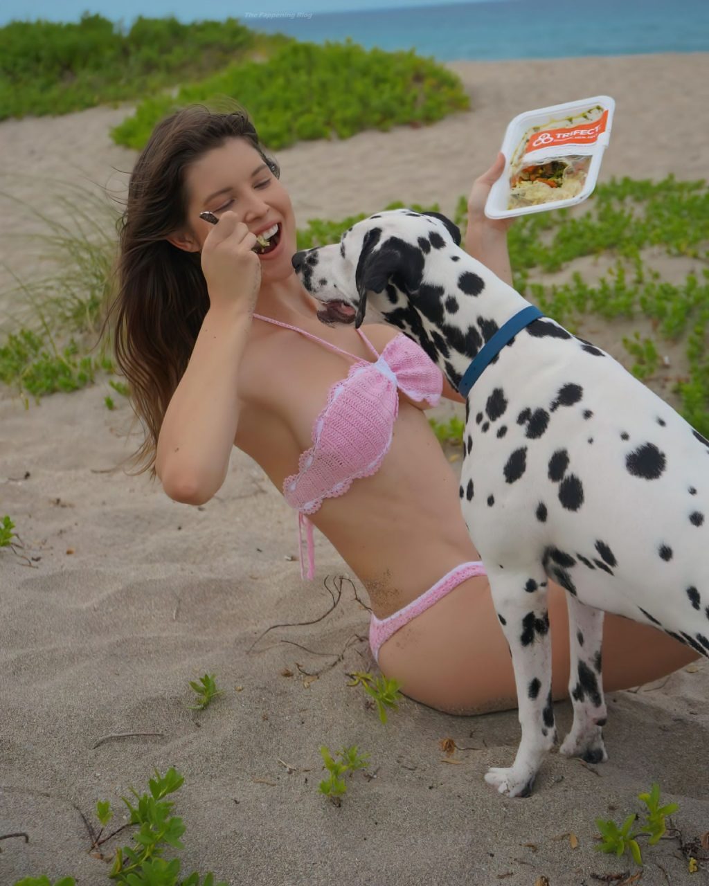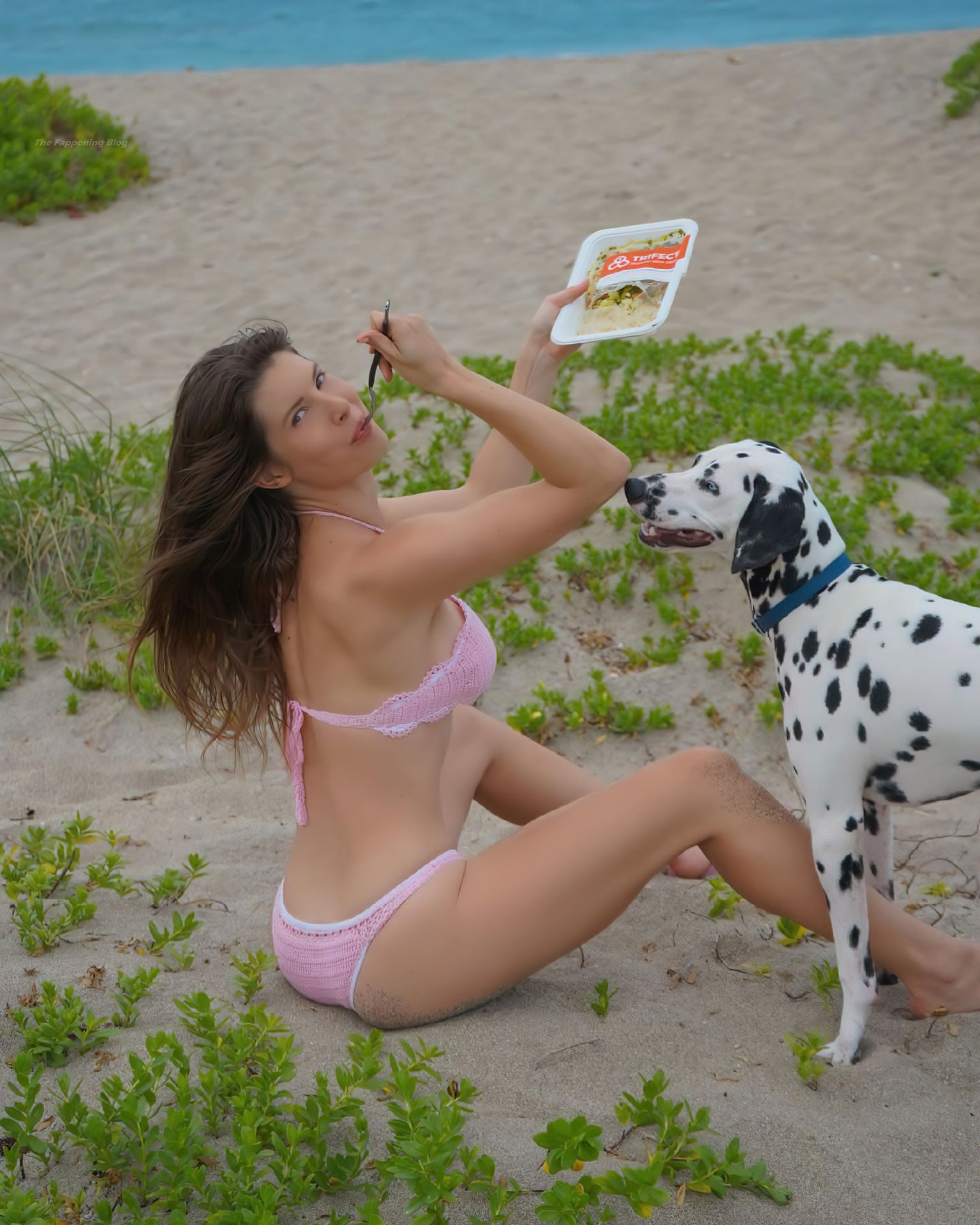 Amanda Cerny si gode una giornata con il suo cane sulla spiaggia. La modella mostra il suo bel sedere e la vita sottile, posando in un bikini rosa per una nuova foto sui social media (maggio 2021).