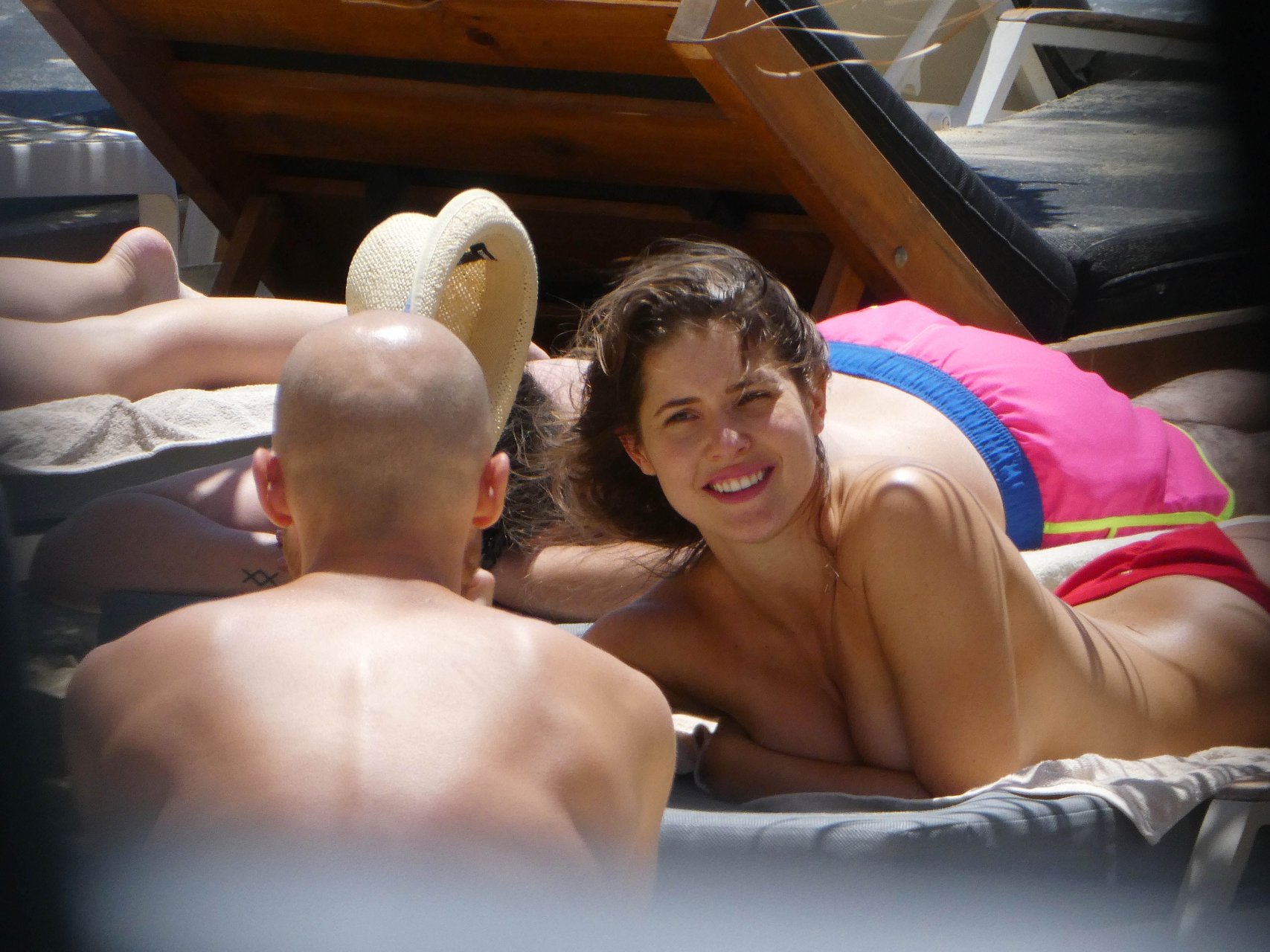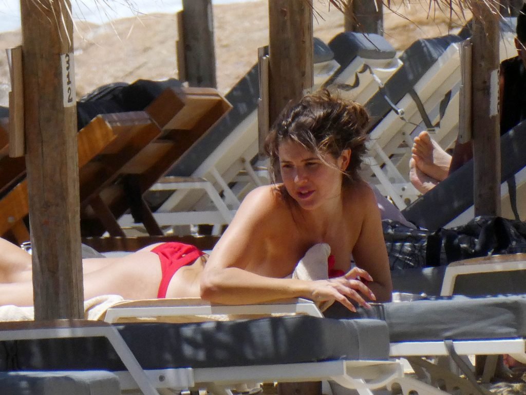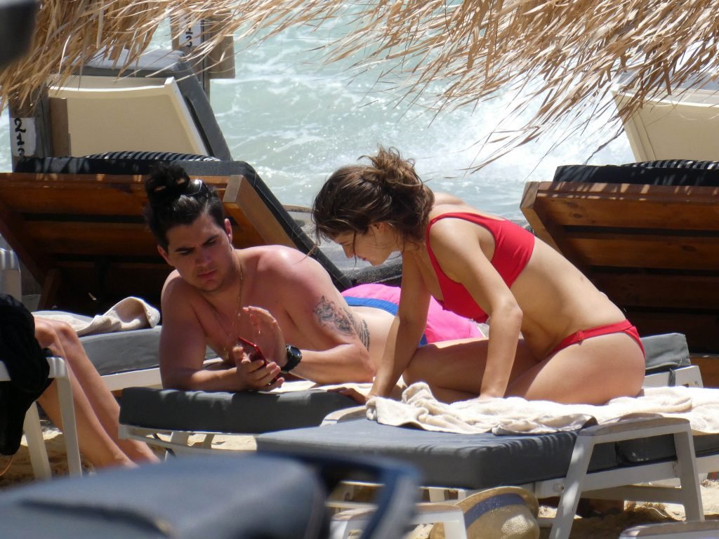 L’attrice americana, modella e star dei social media Amanda Cerny è vista topless sulla spiaggia a Mykonos con amici e il suo uomo Johannes Bartl, 28/06/2018.