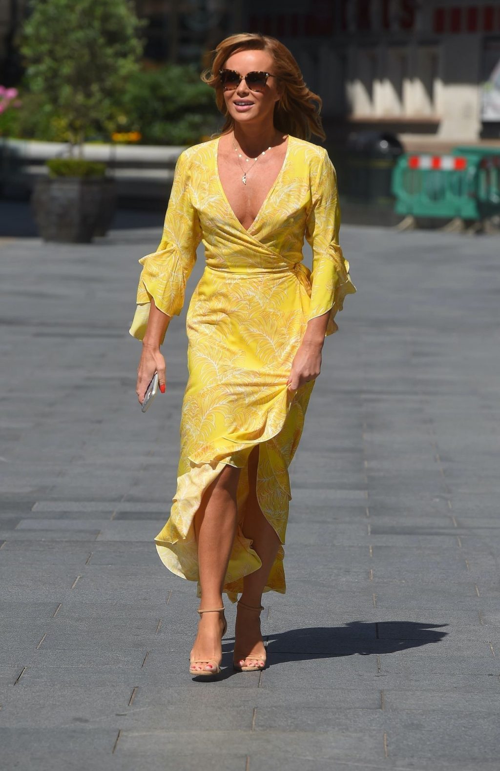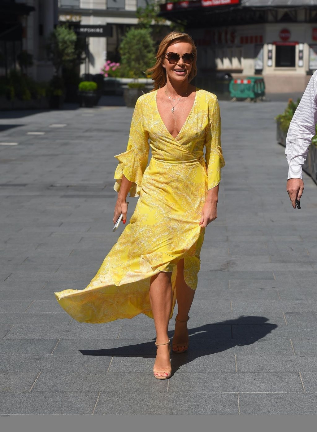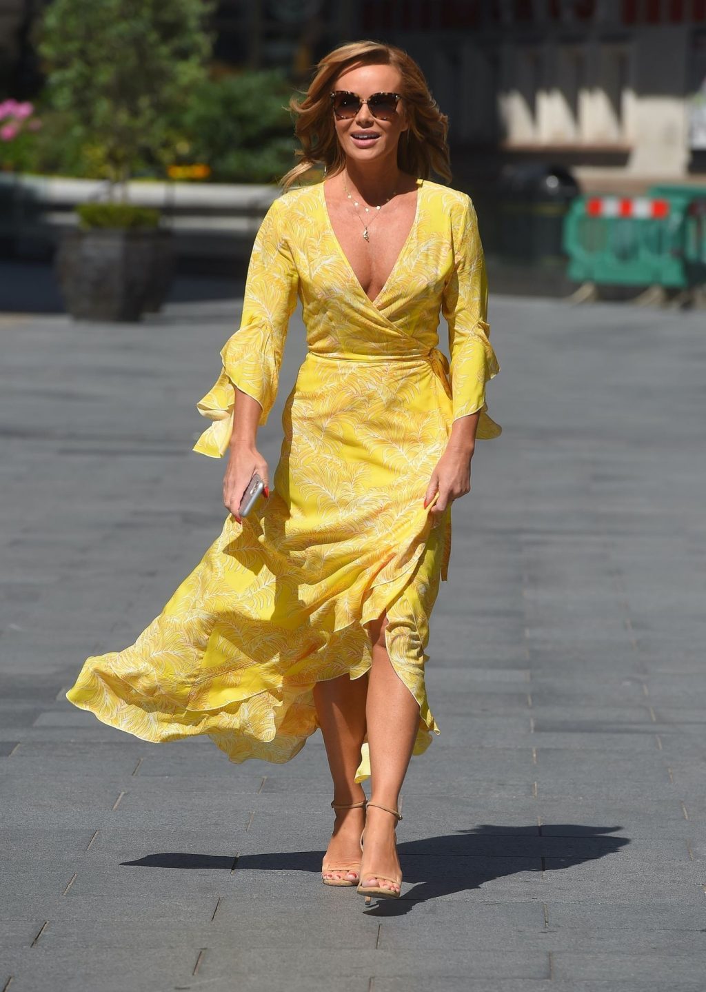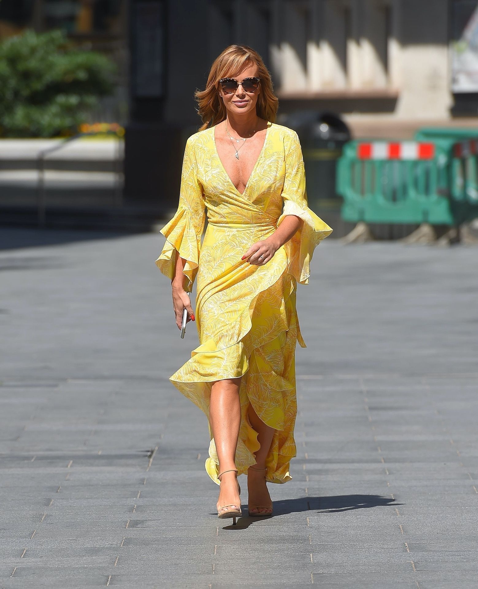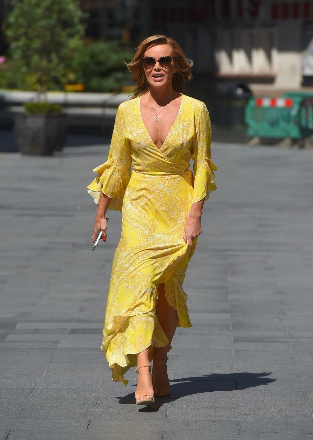 La presentatrice televisiva e radiofonica Amanda Holden (49), senza reggiseno, esce da Heart Radio con un vestito giallo a Londra, 22/06/2020.