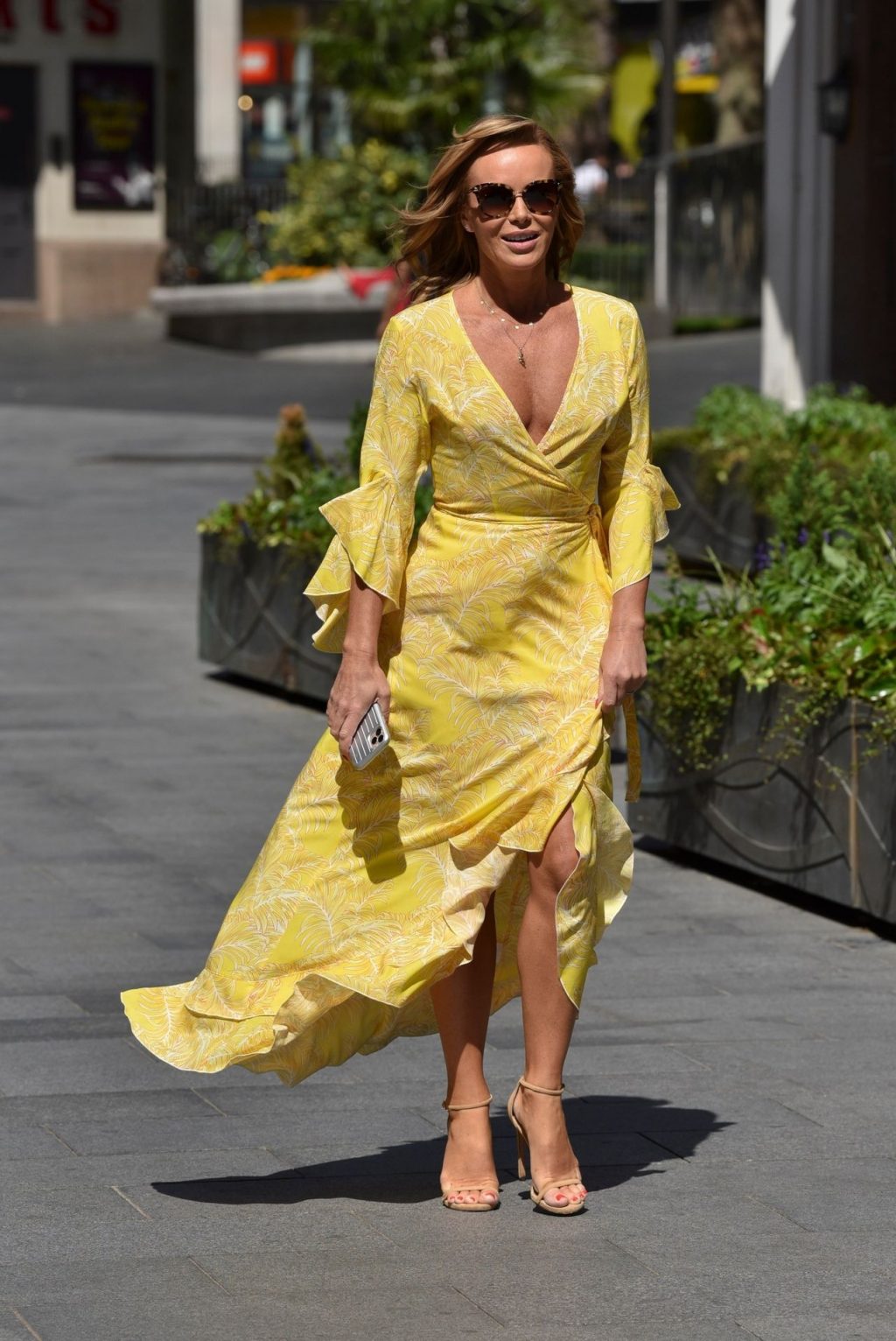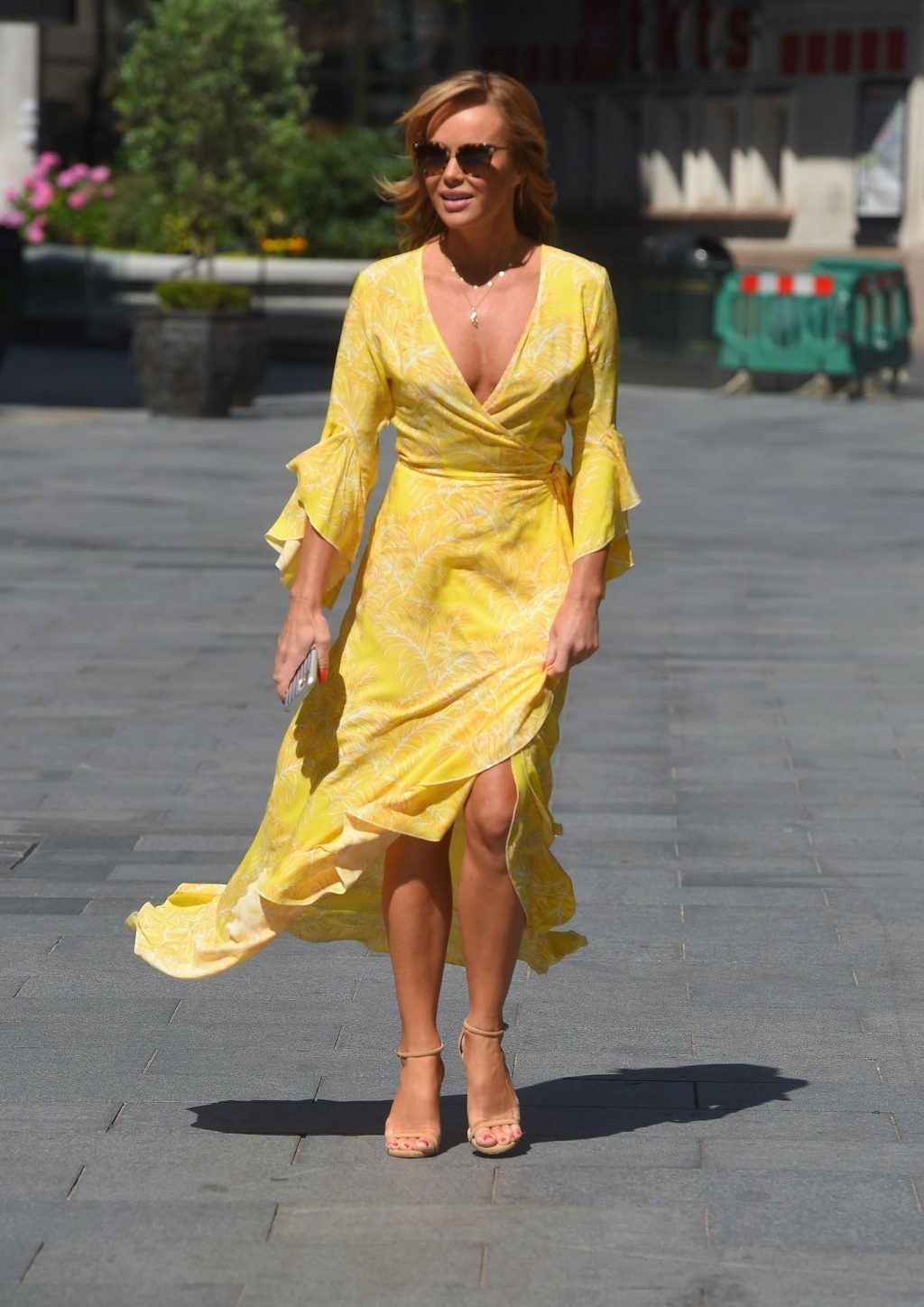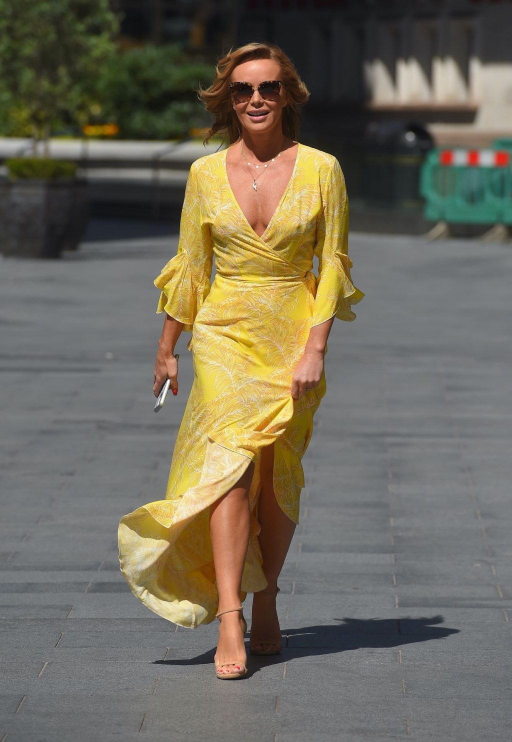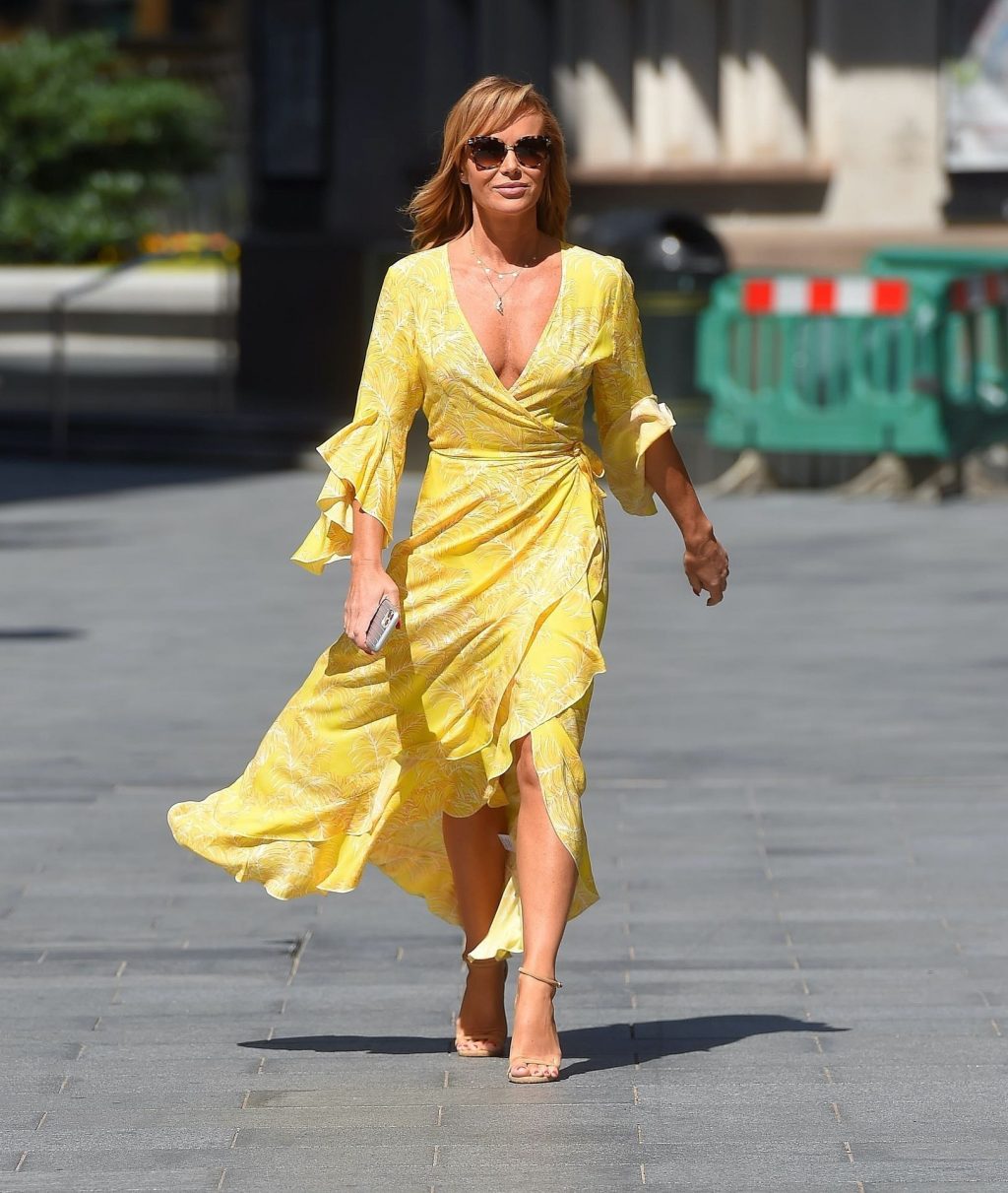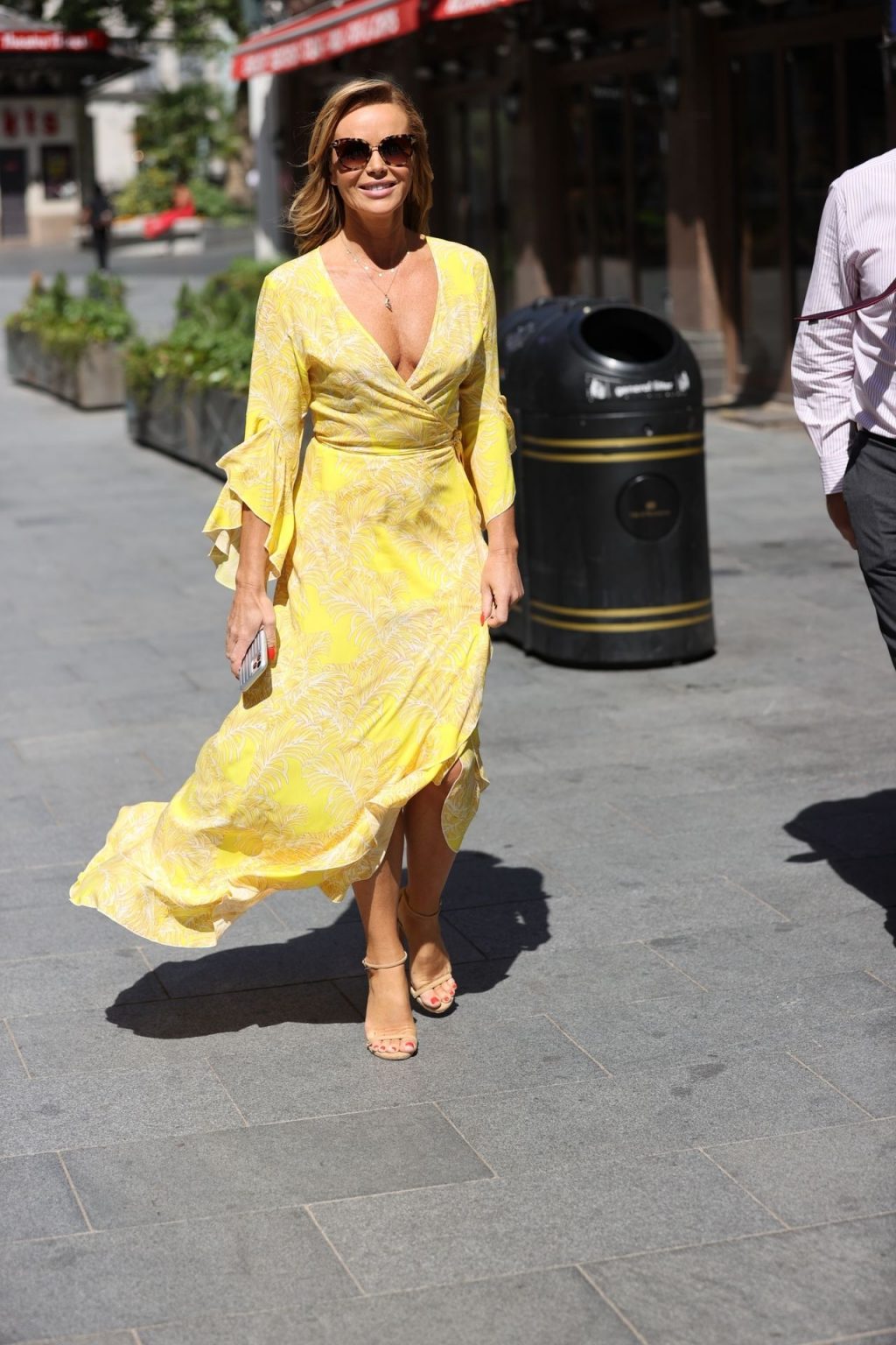 La presentatrice televisiva e radiofonica Amanda Holden (49), senza reggiseno, esce da Heart Radio con un vestito giallo a Londra, 22/06/2020.