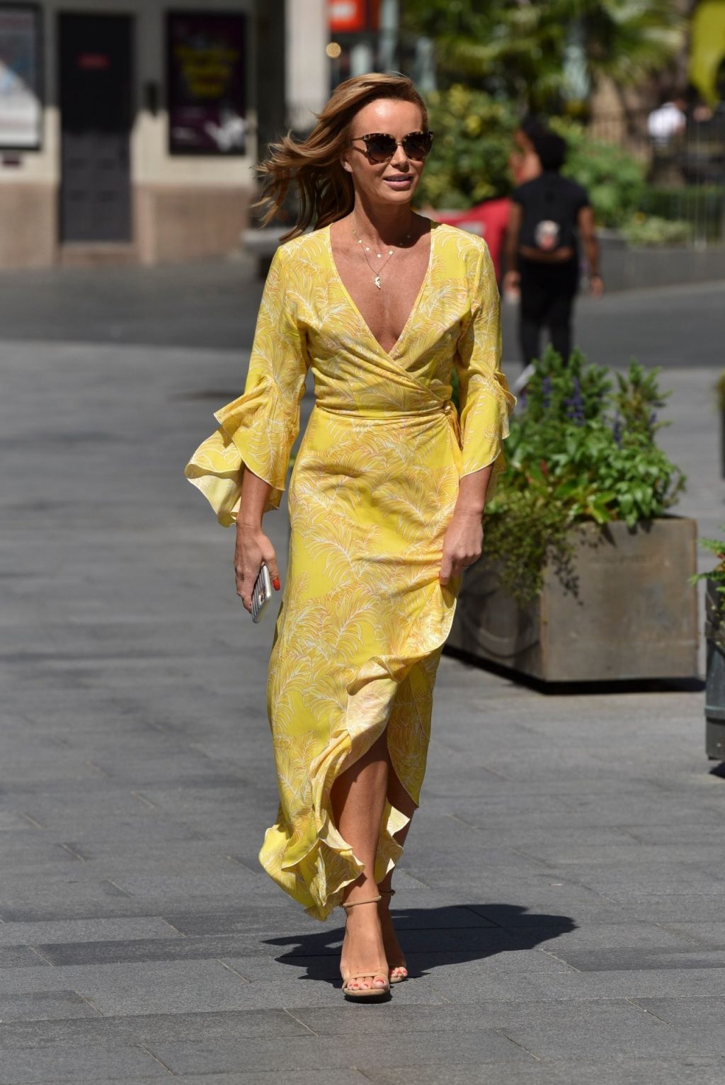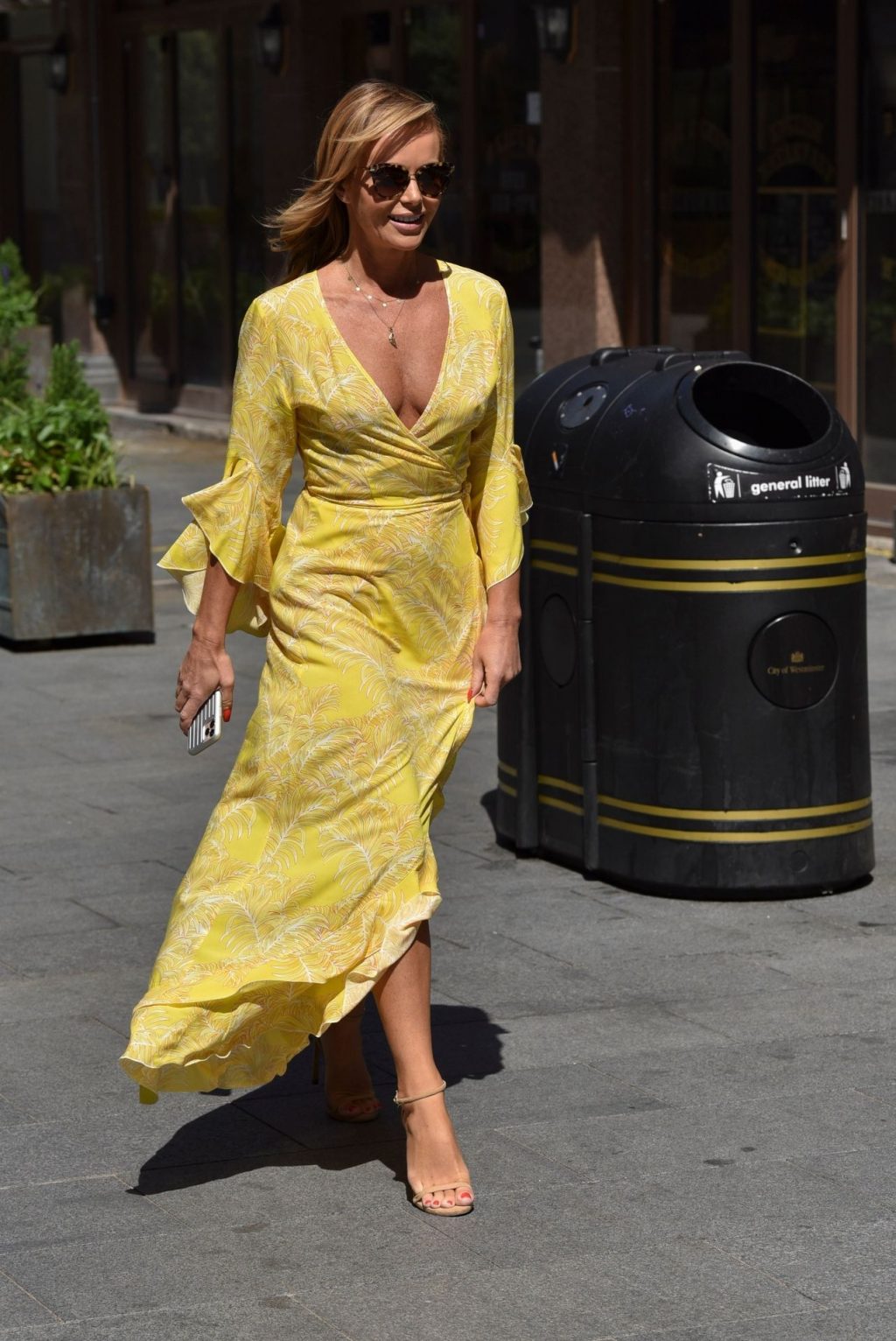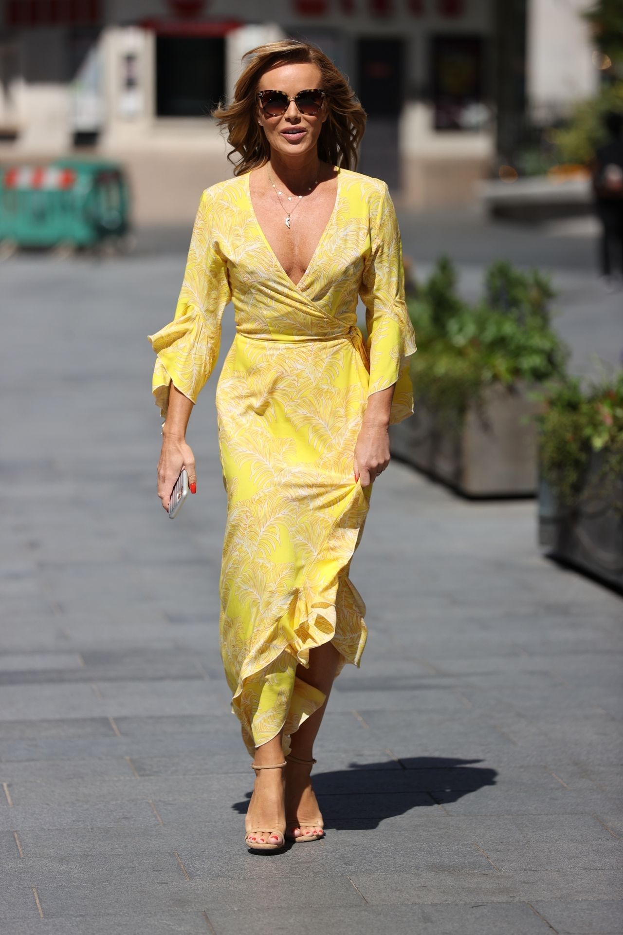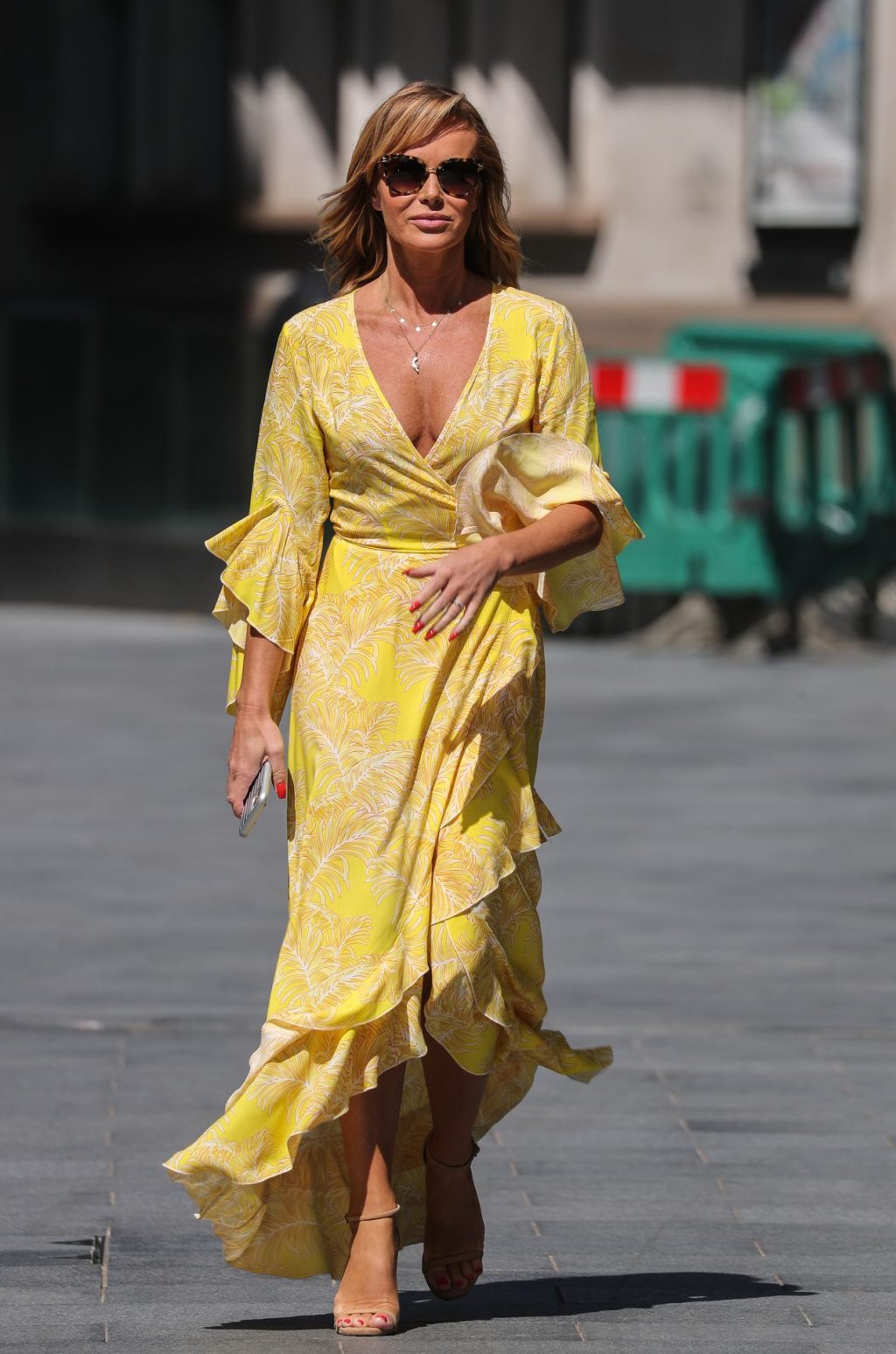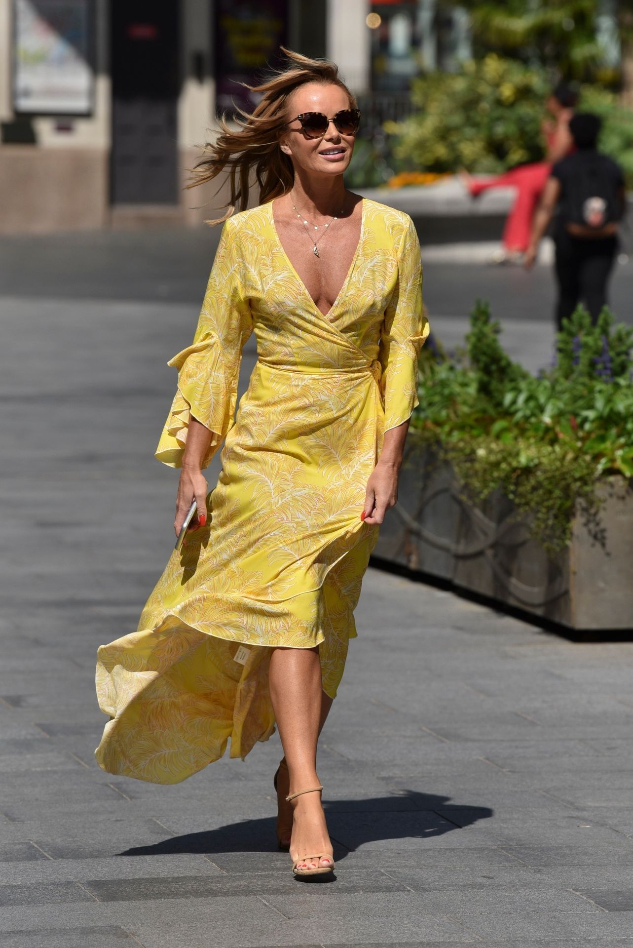 La presentatrice televisiva e radiofonica Amanda Holden (49), senza reggiseno, esce da Heart Radio con un vestito giallo a Londra, 22/06/2020.
