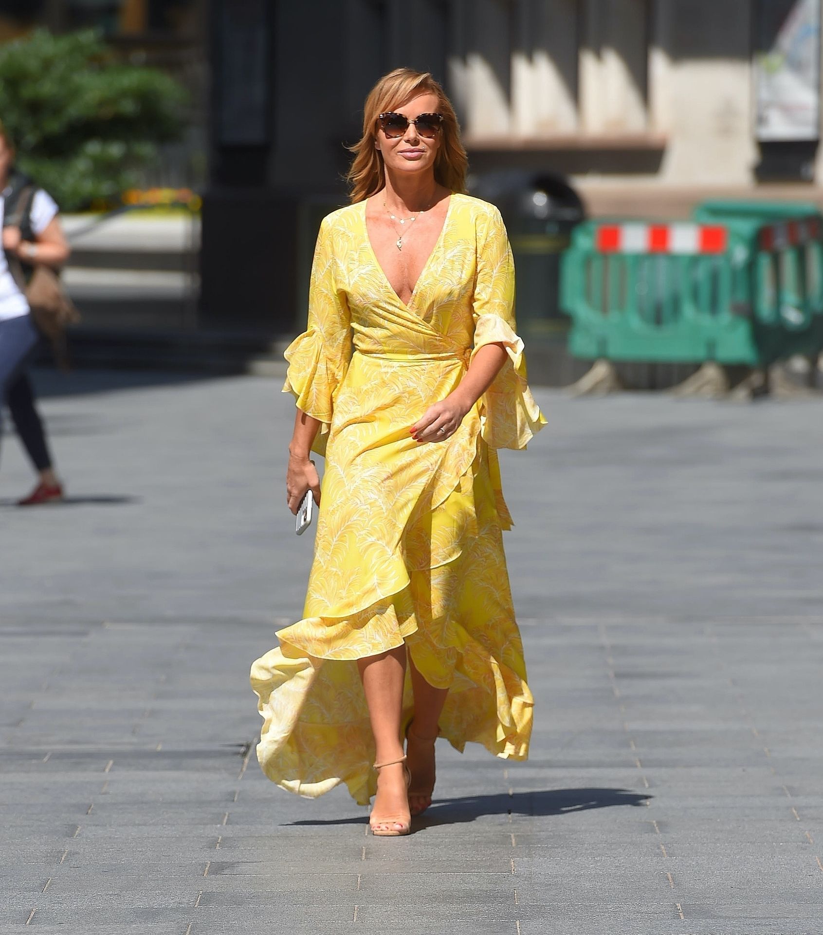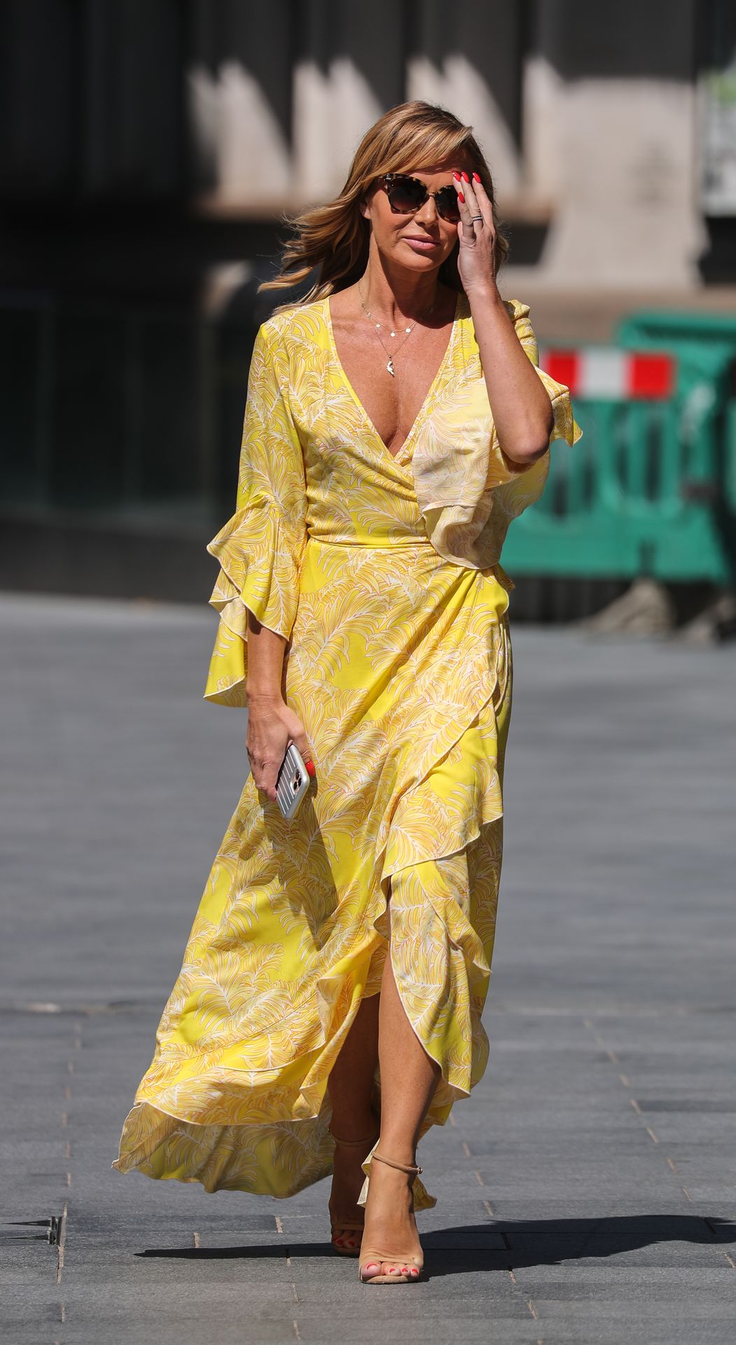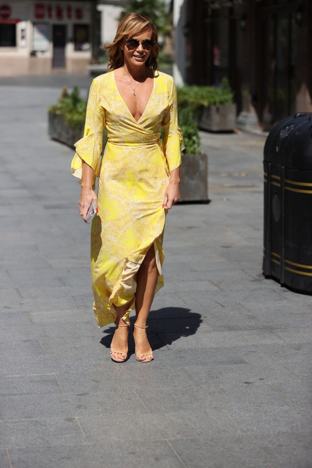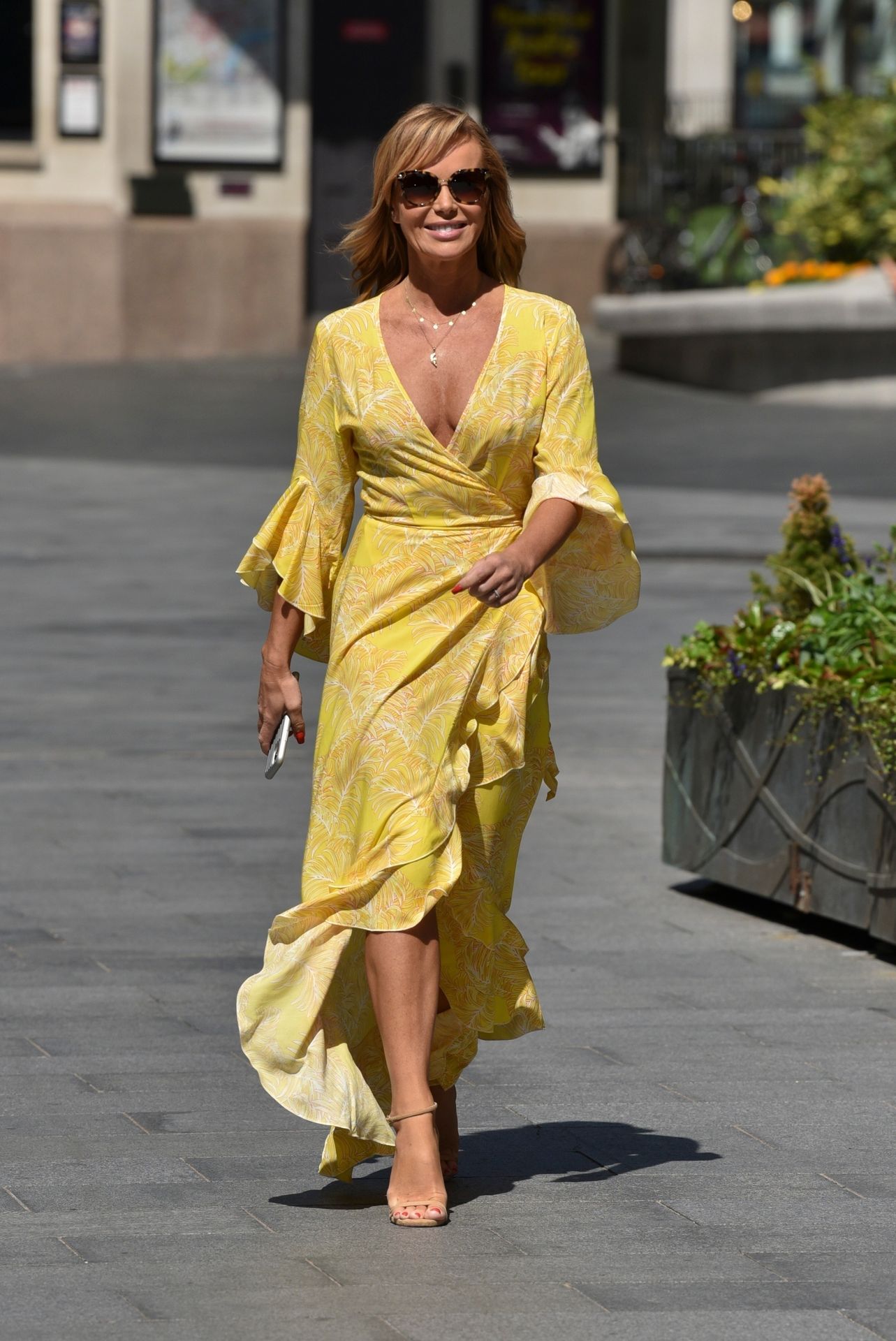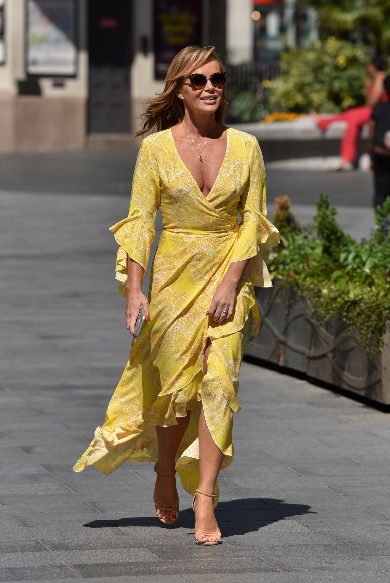 La presentatrice televisiva e radiofonica Amanda Holden (49), senza reggiseno, esce da Heart Radio con un vestito giallo a Londra, 22/06/2020.