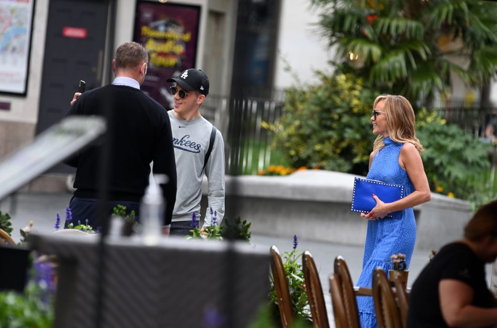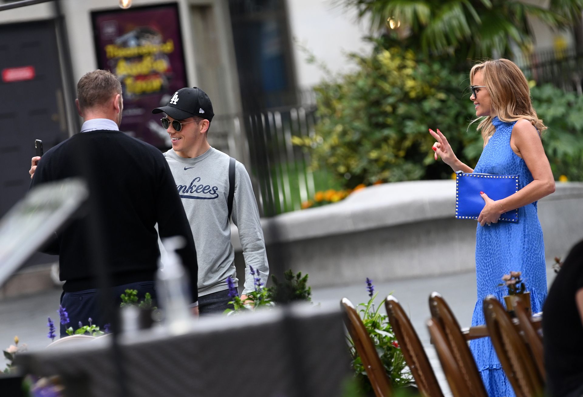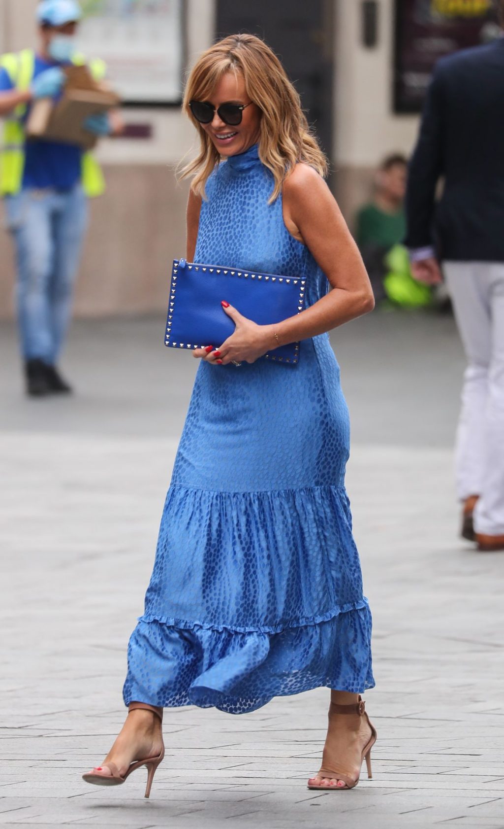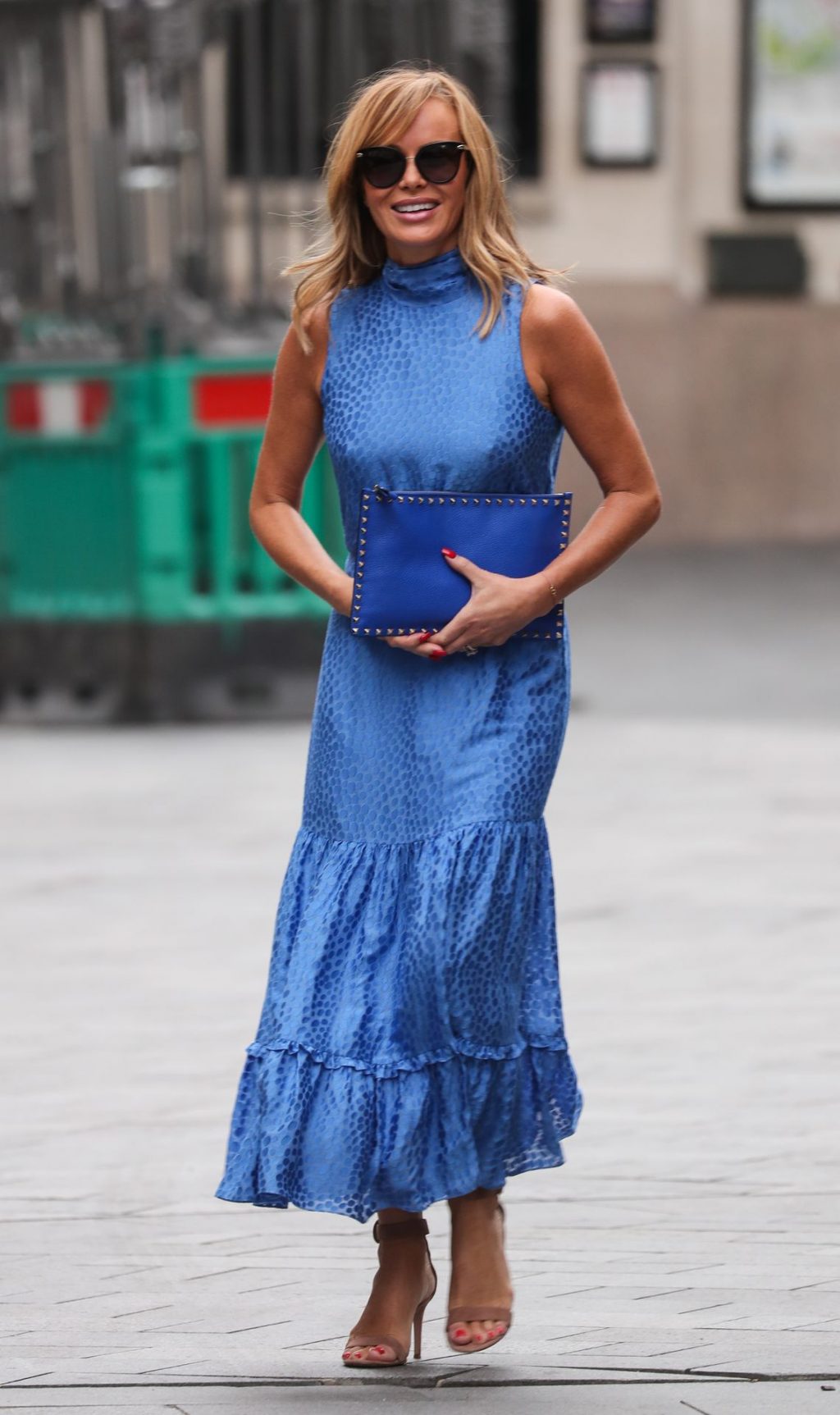 La personalità televisiva britannica e conduttrice radiofonica Amanda Holden lascia lo show Heart Breakfast indossando un vestito blu senza maniche a Londra, 16/07/2020.
