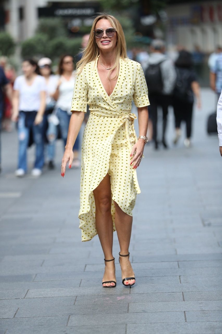 La presentatrice televisiva Amanda Holden mostra le gambe lunghe con un audace abito giallo a pois con spacco alto mentre lascia Heart Radio, Global House a Londra, 07/08/2019.
