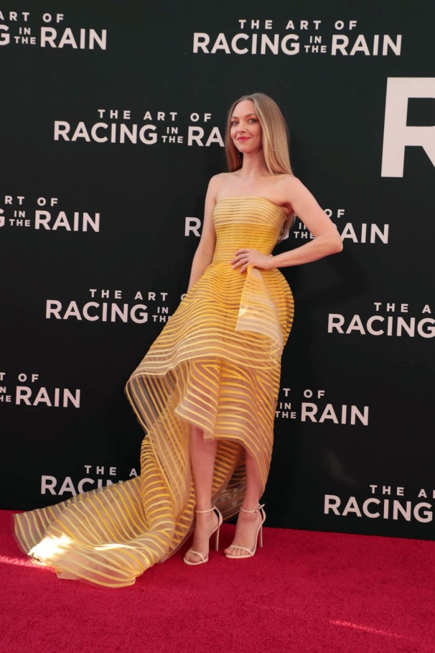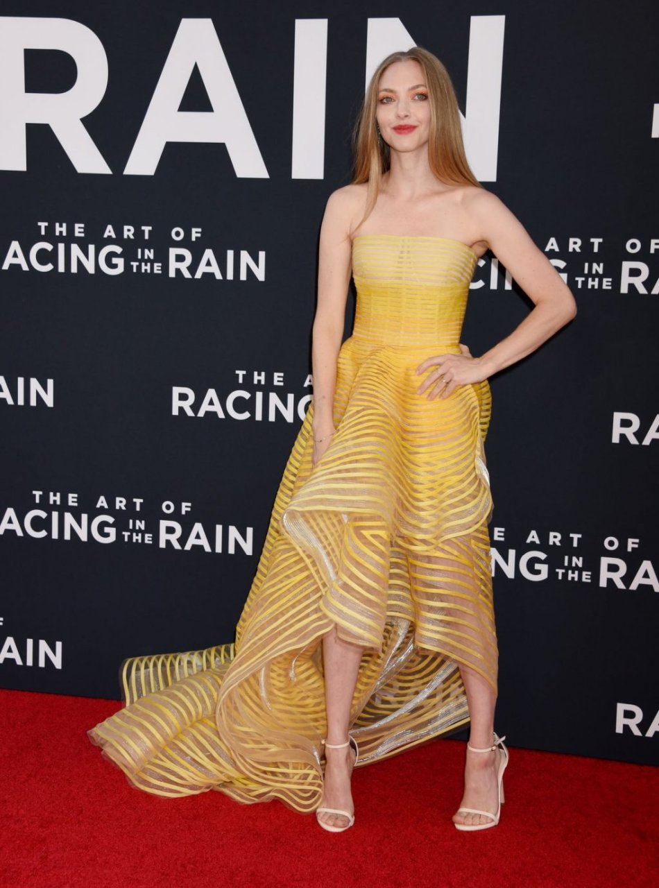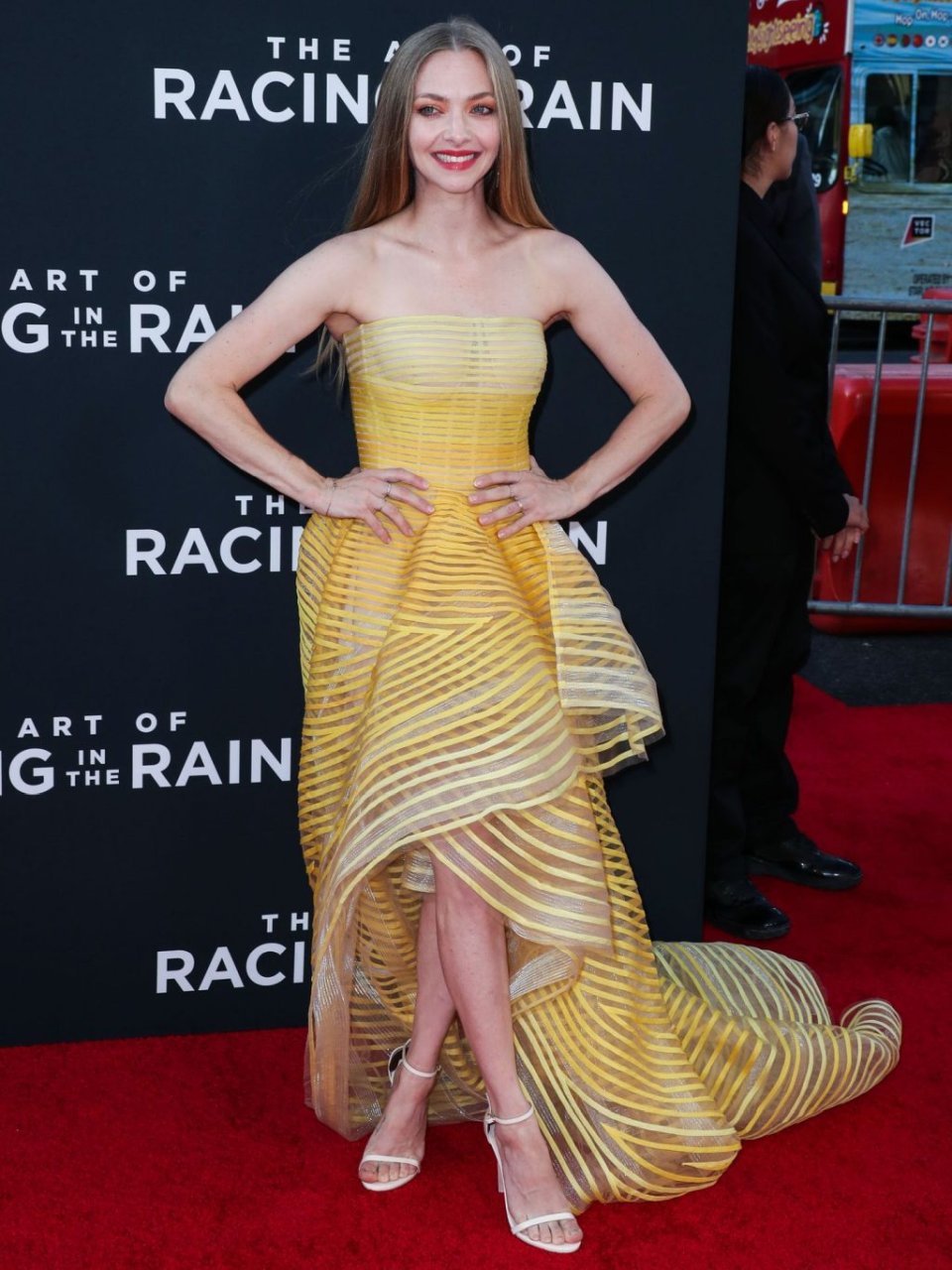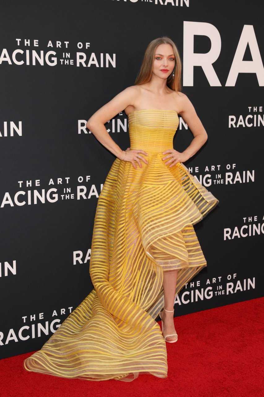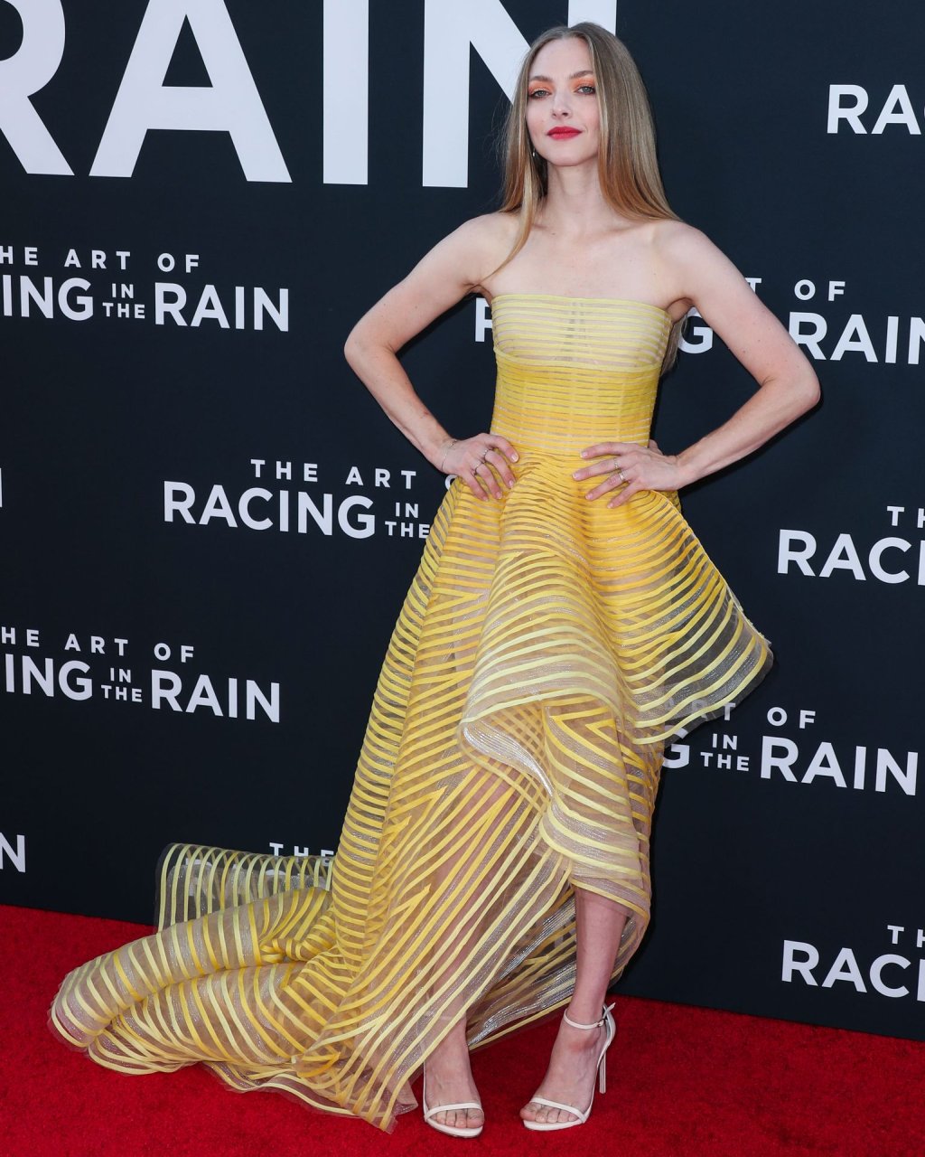L’attrice Amanda Seyfried indossa un abito Oscar de la Renta, tacchi Stuart Weitzman e orecchini Jennifer Meyer mentre arriva alla prima di Los Angeles del film di 20th Century Fox ‘The Art Of Racing In The Rain’ tenutasi al El Capitan Theatre a Hollywood, Los Angeles, 01/08/2019.