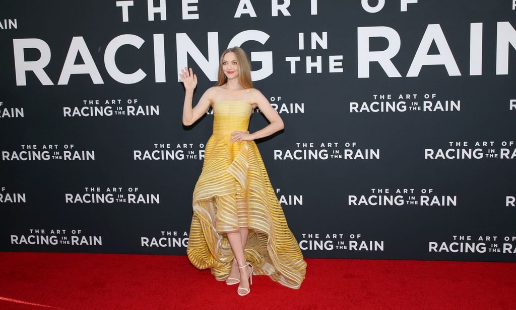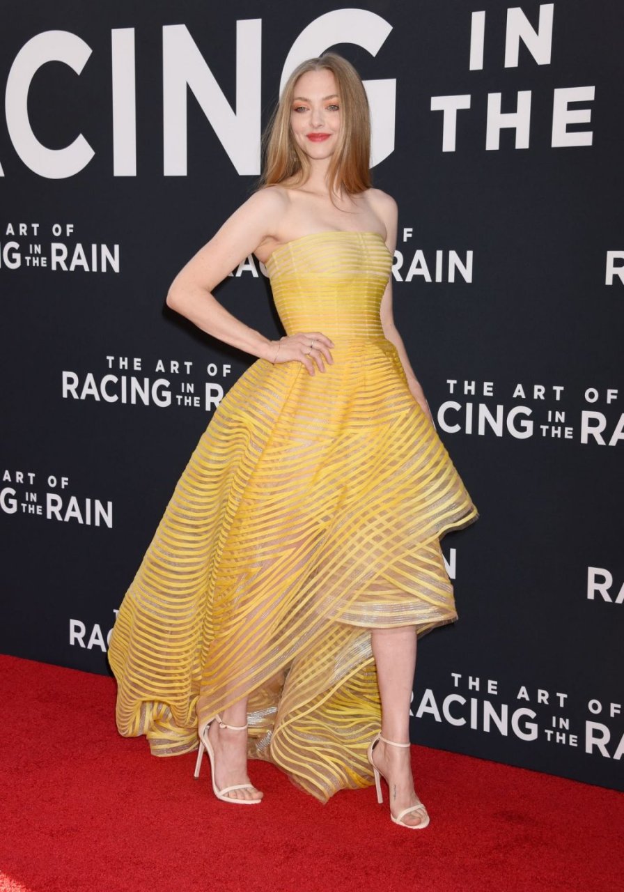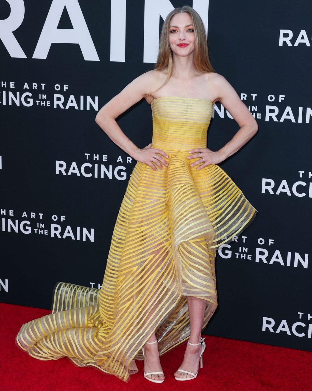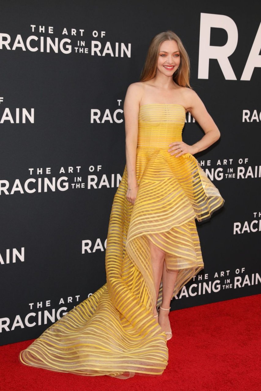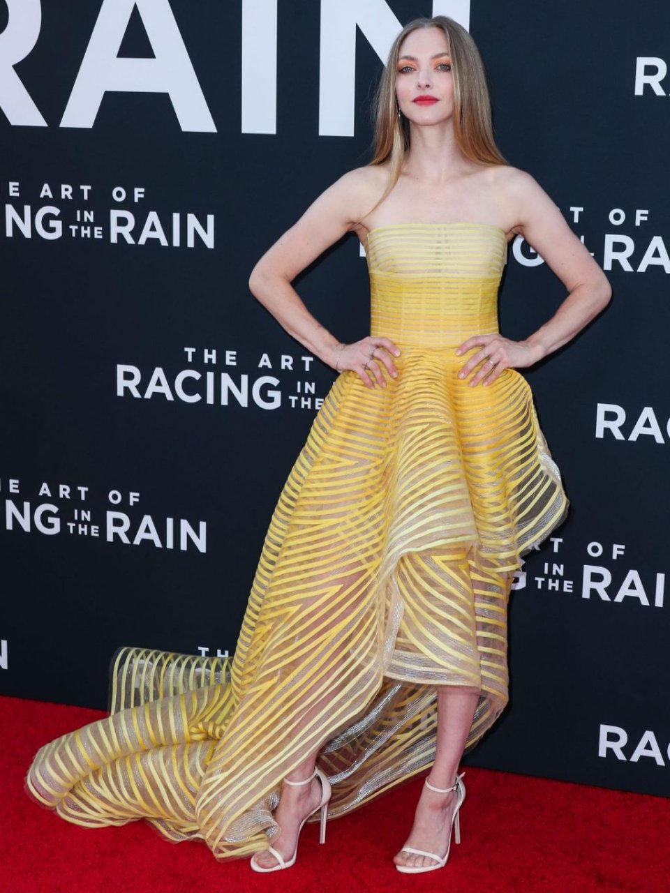 L’attrice Amanda Seyfried indossa un abito Oscar de la Renta, tacchi Stuart Weitzman e orecchini Jennifer Meyer mentre arriva alla prima di Los Angeles del film di 20th Century Fox ‘The Art Of Racing In The Rain’ tenutasi al El Capitan Theatre a Hollywood, Los Angeles, 01/08/2019.