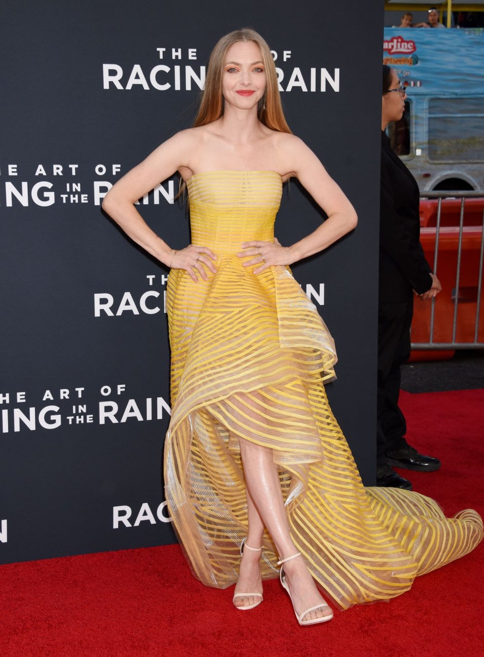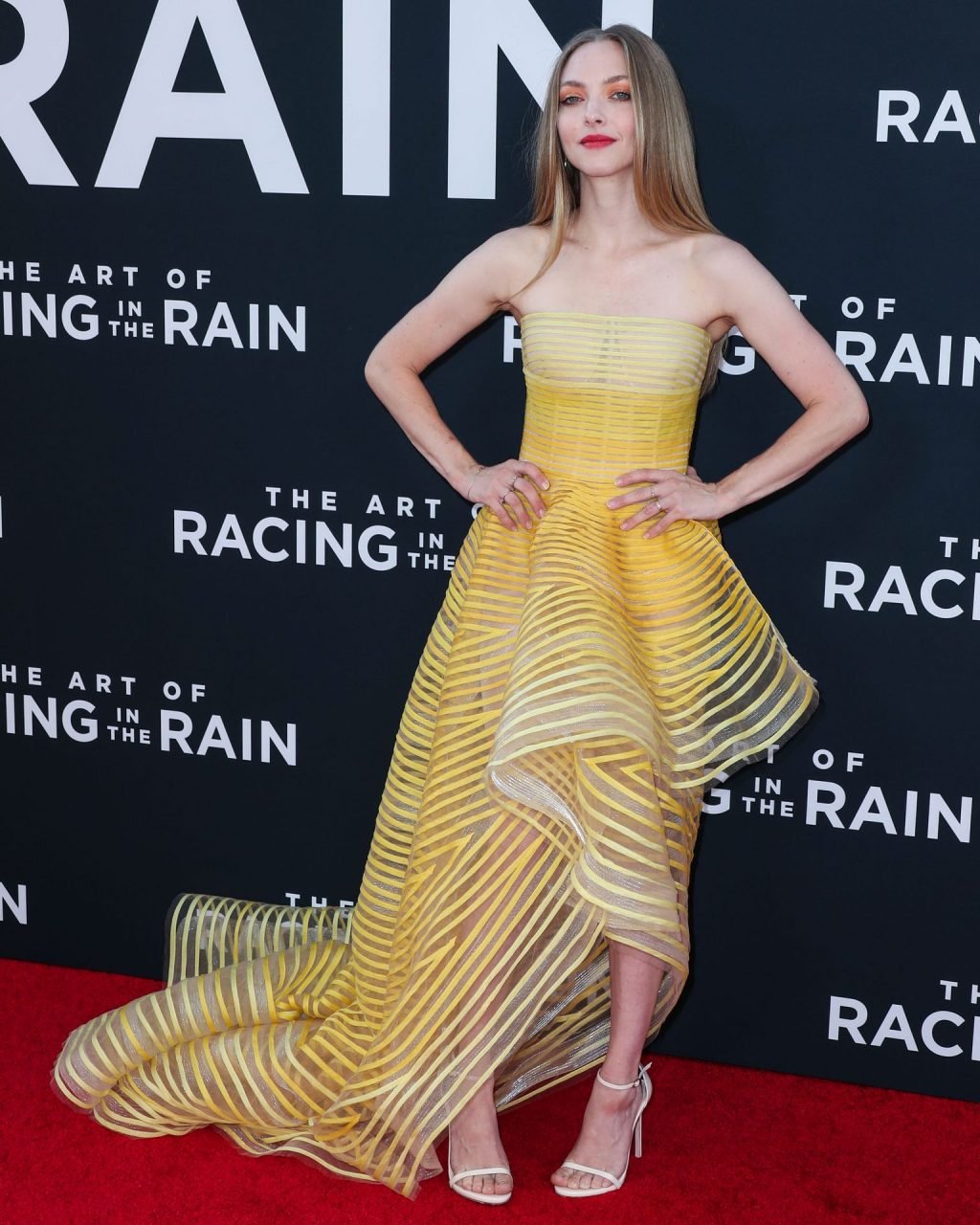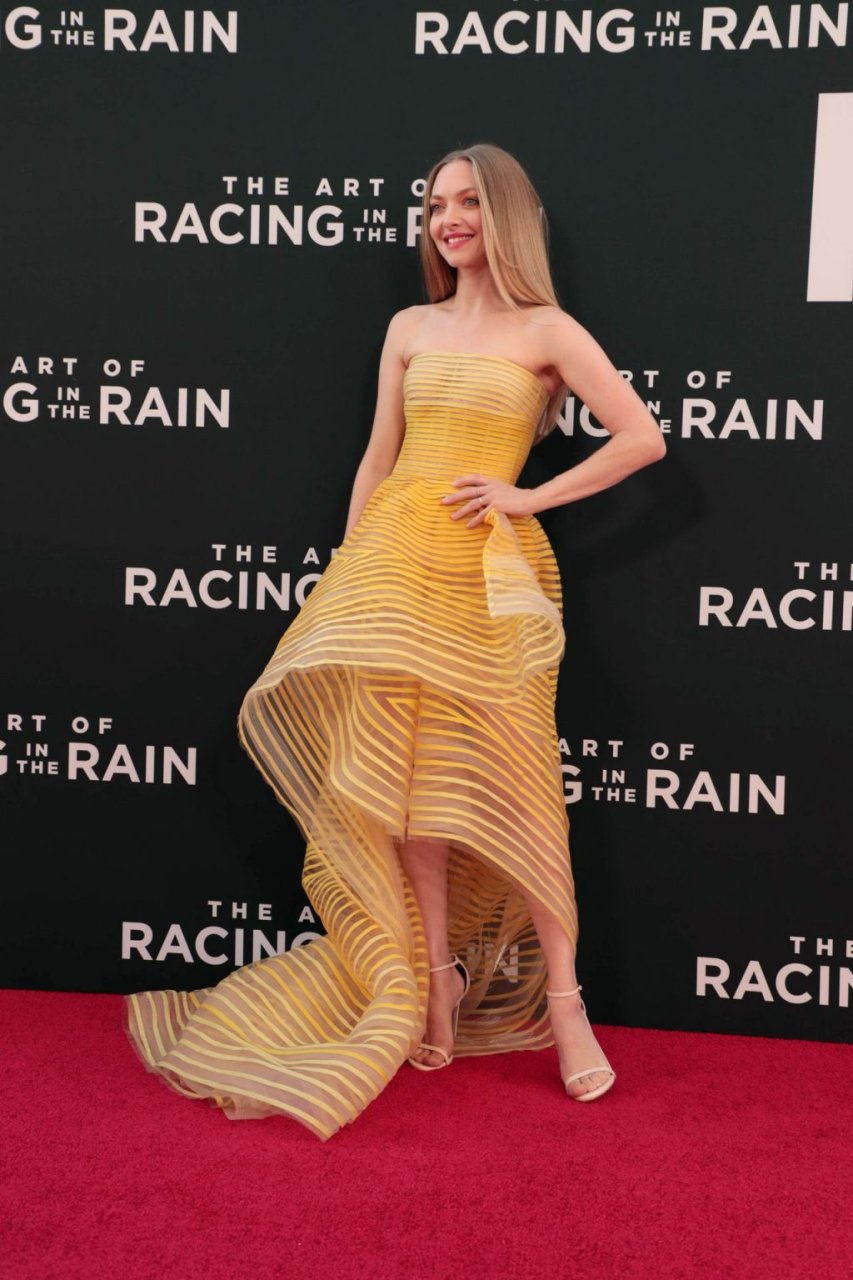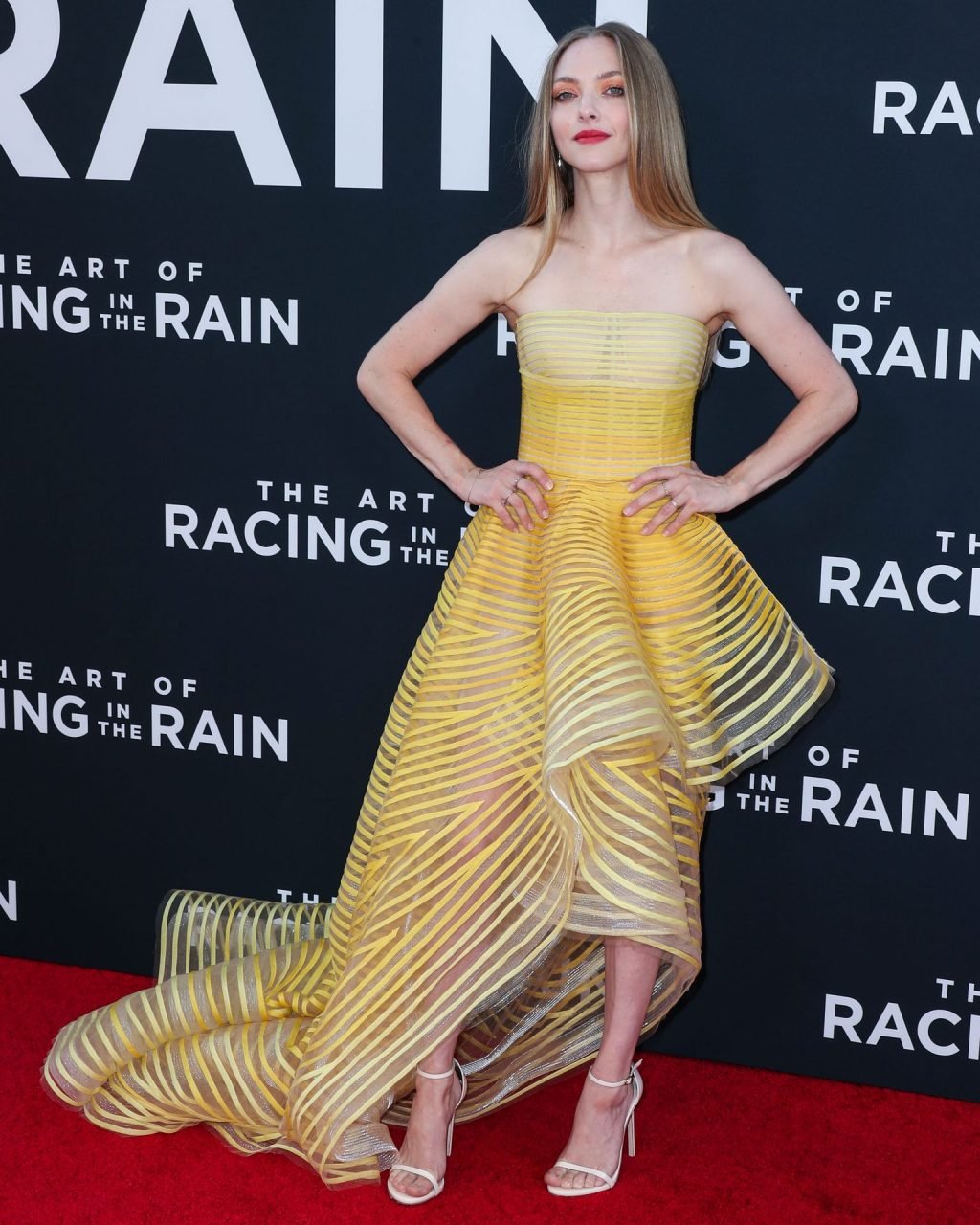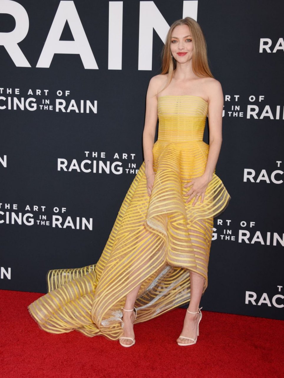L’attrice Amanda Seyfried indossa un abito Oscar de la Renta, tacchi Stuart Weitzman e orecchini Jennifer Meyer mentre arriva alla prima di Los Angeles del film di 20th Century Fox ‘The Art Of Racing In The Rain’ tenutasi al El Capitan Theatre a Hollywood, Los Angeles, 01/08/2019.
