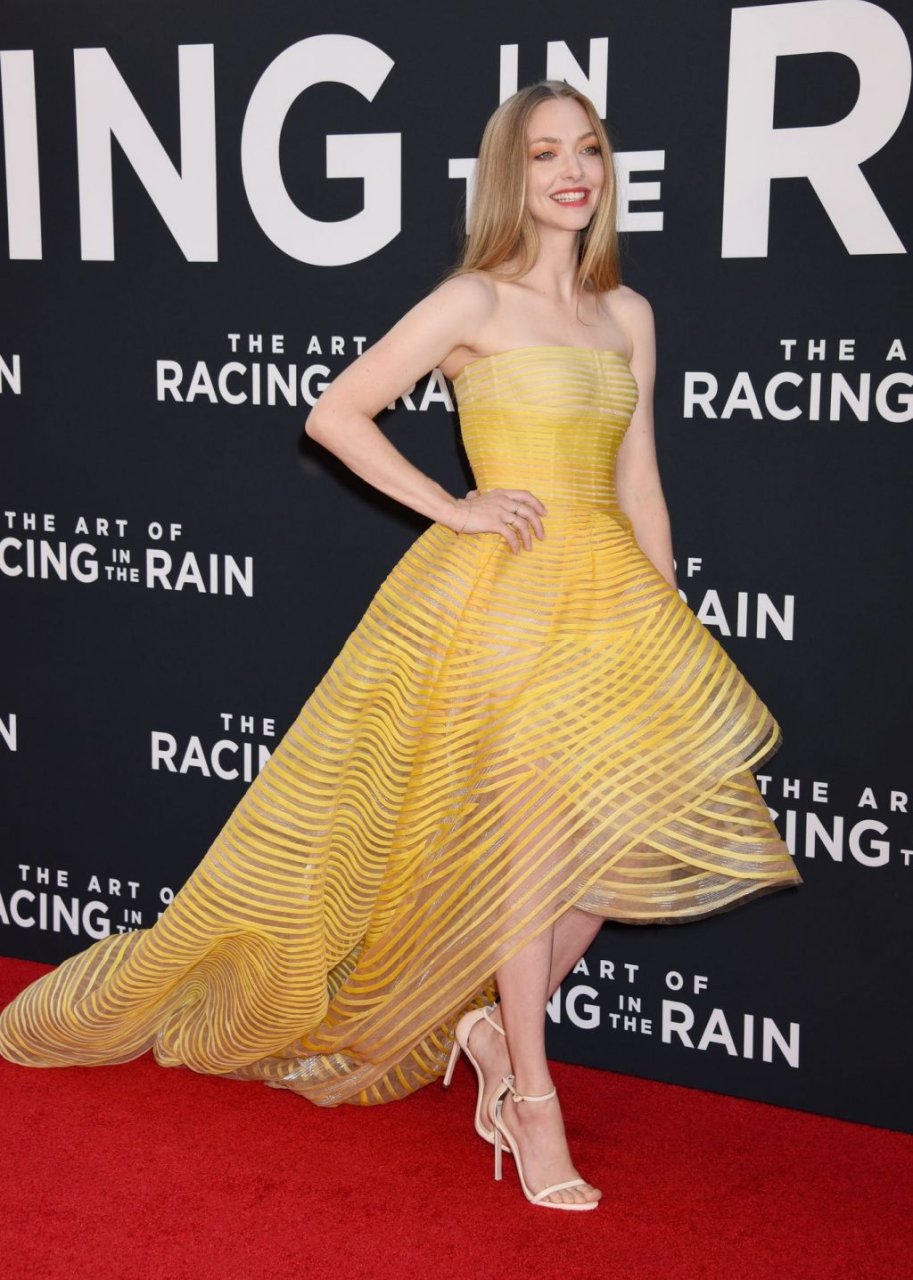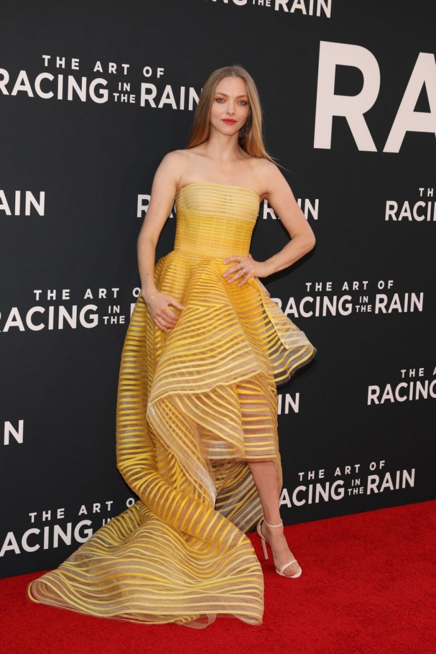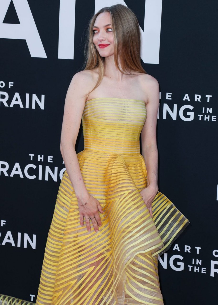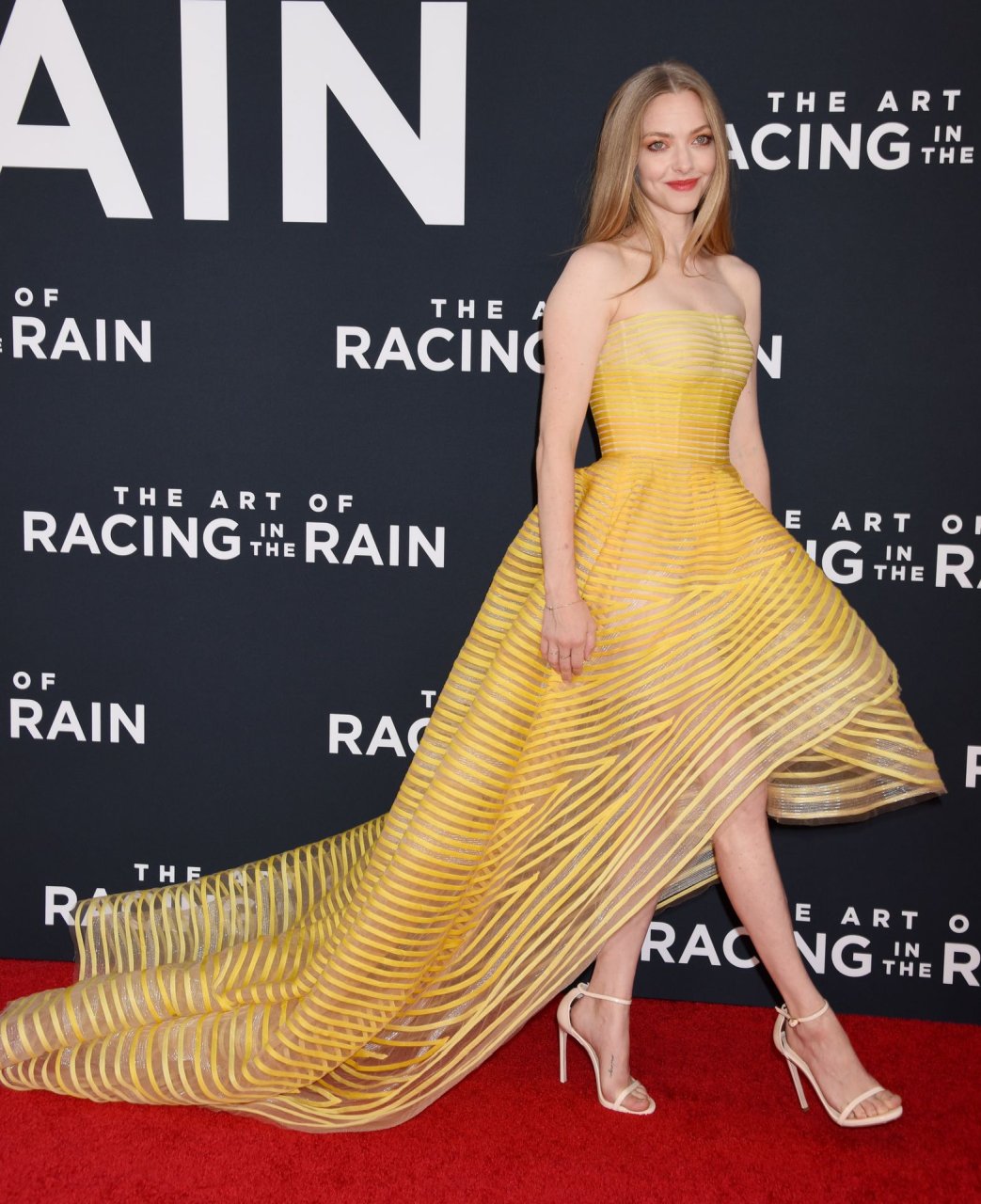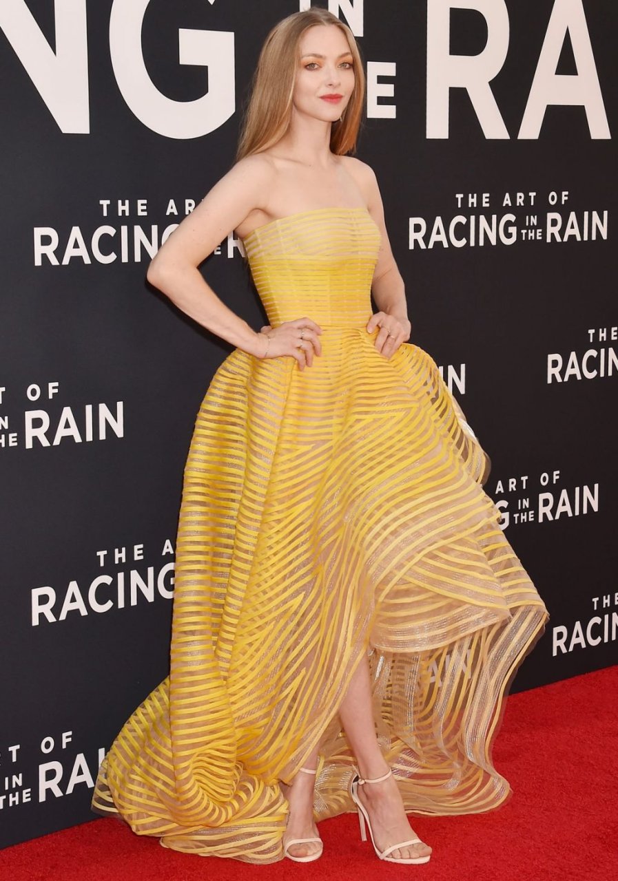L’attrice Amanda Seyfried indossa un abito Oscar de la Renta, tacchi Stuart Weitzman e orecchini Jennifer Meyer mentre arriva alla prima di Los Angeles del film di 20th Century Fox ‘The Art Of Racing In The Rain’ tenutasi al El Capitan Theatre a Hollywood, Los Angeles, 01/08/2019.