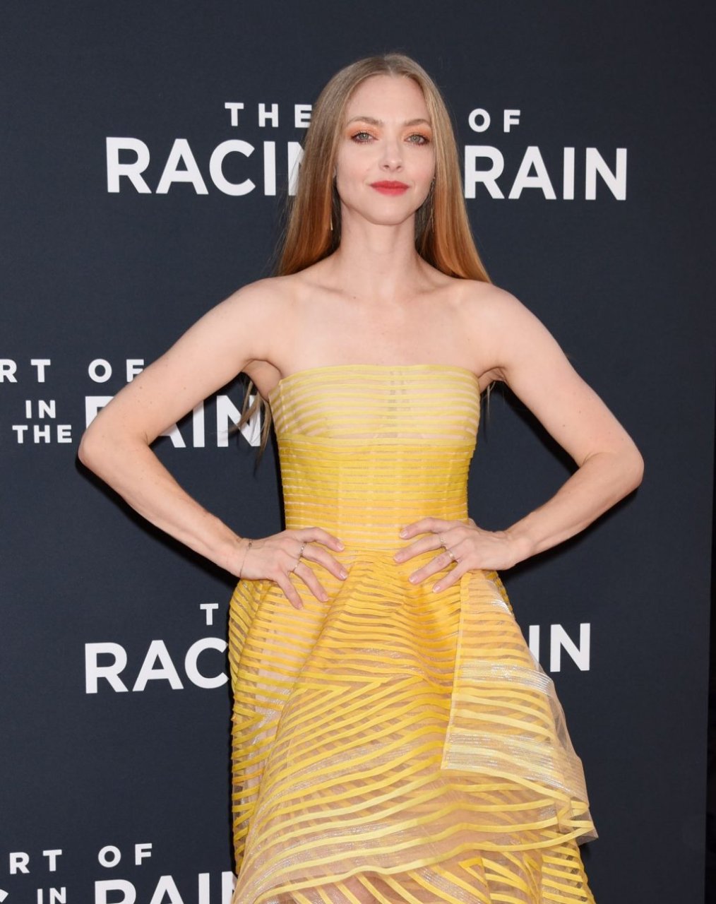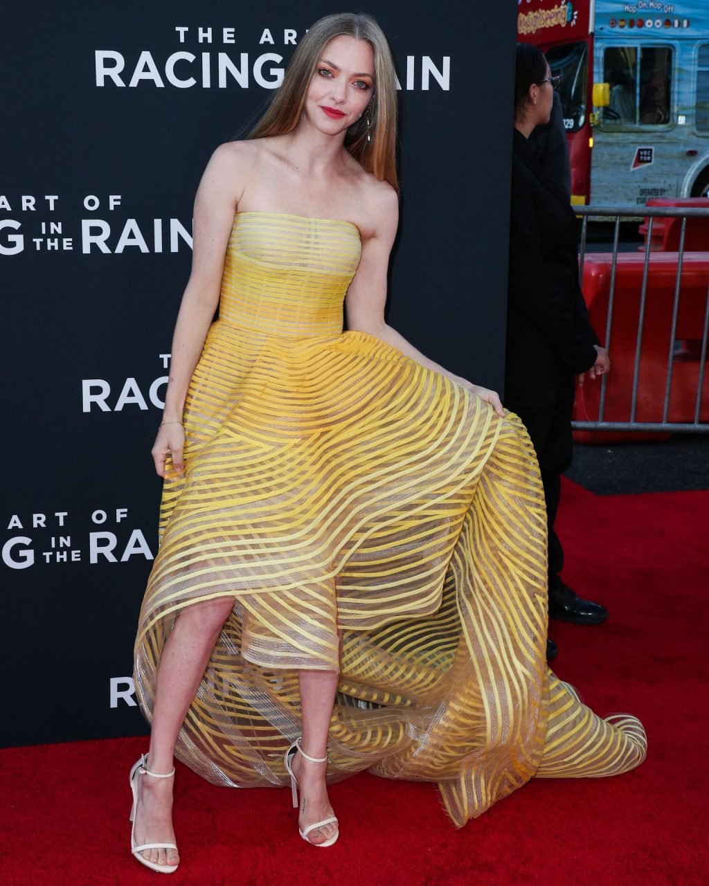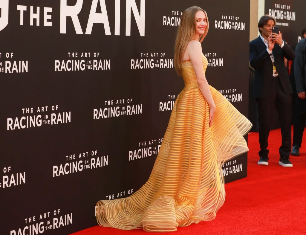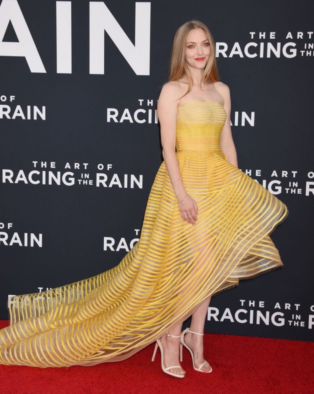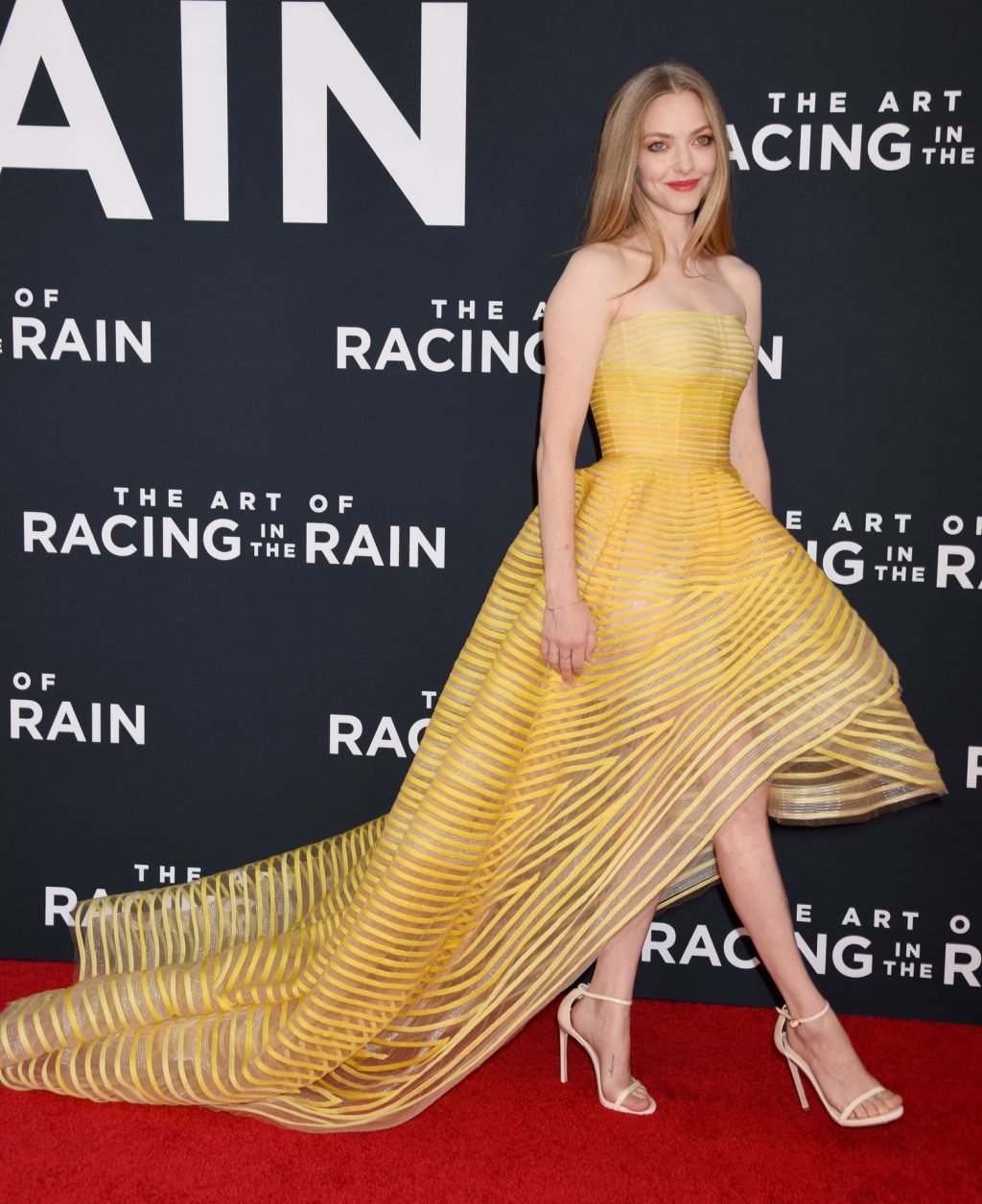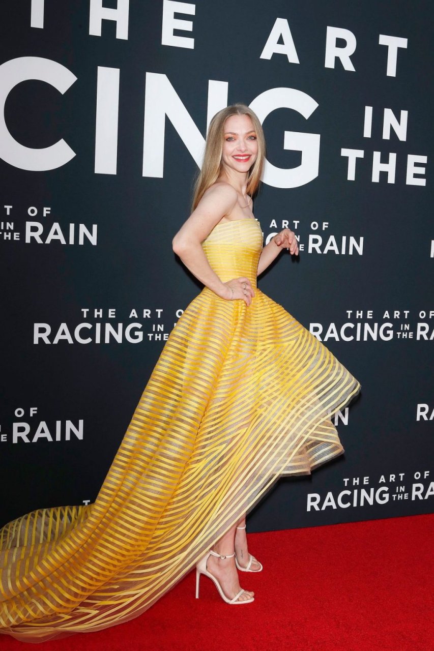 L’attrice Amanda Seyfried indossa un abito Oscar de la Renta, tacchi Stuart Weitzman e orecchini Jennifer Meyer mentre arriva alla prima di Los Angeles del film di 20th Century Fox ‘The Art Of Racing In The Rain’ tenutasi al El Capitan Theatre a Hollywood, Los Angeles, 01/08/2019.