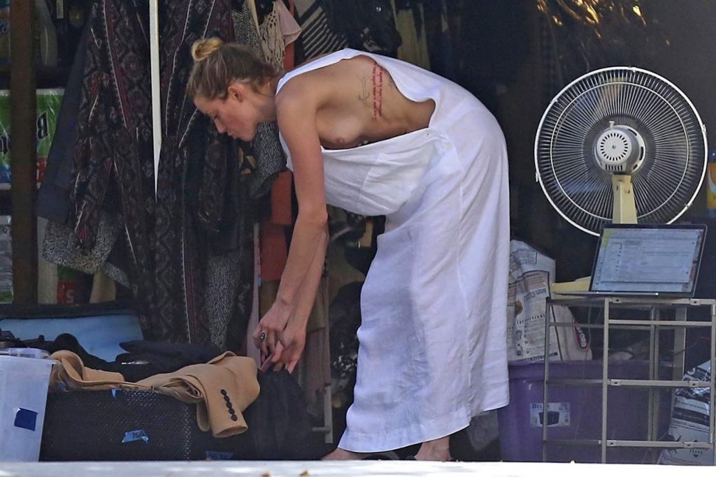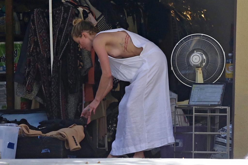 Elon Musk’s and Johnny Depp’s ex, Amber Heard’s nip slip, happened while cleaning her garage in Los Angeles! You used to see Amber Heard pretty and nude, but this time she was seen at her home, doing some cleaning and looking very dirty and unhappy, hope she has a dick to fuck and a pussy to give! Amber’s face is full of acne and red pimples, so she needs some cum over her face; we heard it’s suitable for face cleaning! LMAO