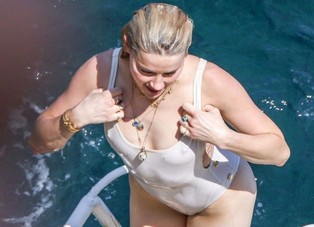 Amber is going through a challenging period of her life; she’s divorcing the American actor and being OK with that! We’re supporting Amber Heard by sexualizing her body! Heard wore a white one-piece swimsuit, and her nipples were seen through it! I know one woman with harder nipples than Amber’s, and that’s our favorite funny lady Jennifer Aniston!