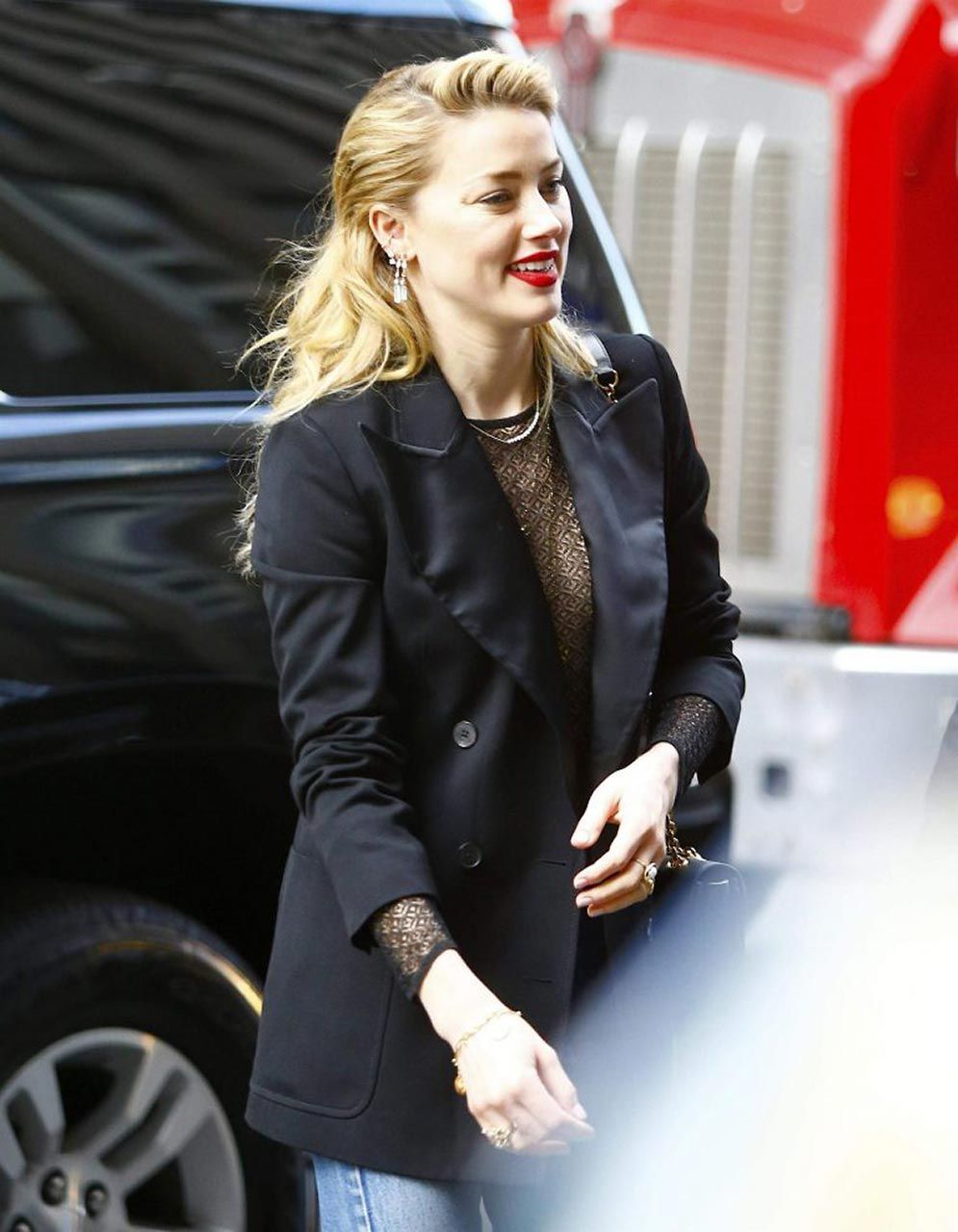 Amber Heard wore a see-through top, an elegant black jacket, and black high heels! Her blonde hair was stunning as her makeup!