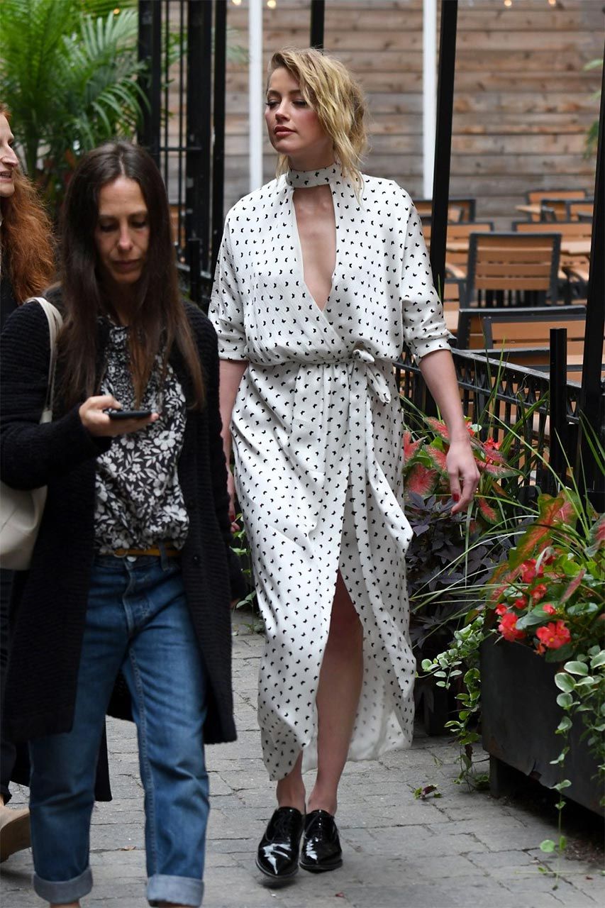 Here is the gallery of Amber Heard’s braless appearance in Toronto. She promoted her new movie with lesbian actress and model Cara Delevingne! Amber was stunning if we’re looking at her beautiful face and blonde hair. The loose white and black dress is flawless, but her knees are too gross! Amber wore shoes she borrowed from a grandma, and I don’t have another explication for this style!
