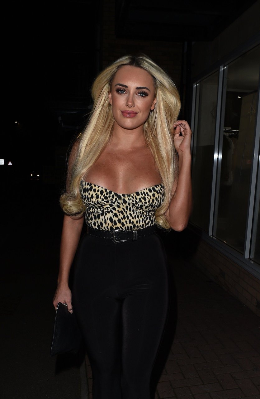 Amber Turner arriva all’anniversario del By Georgina Salon a Loughton, Regno Unito, 24/02/2018. La fashion blogger di 24 anni indossava un top leopardato rivelatore.