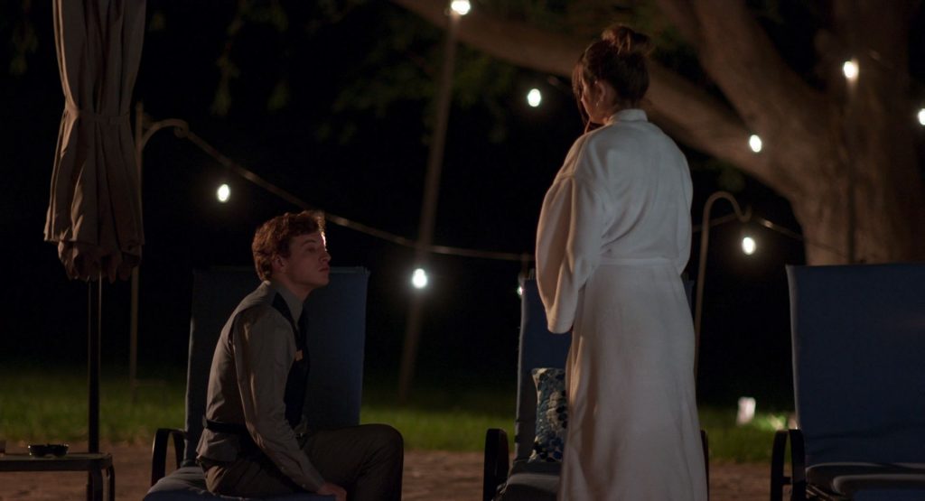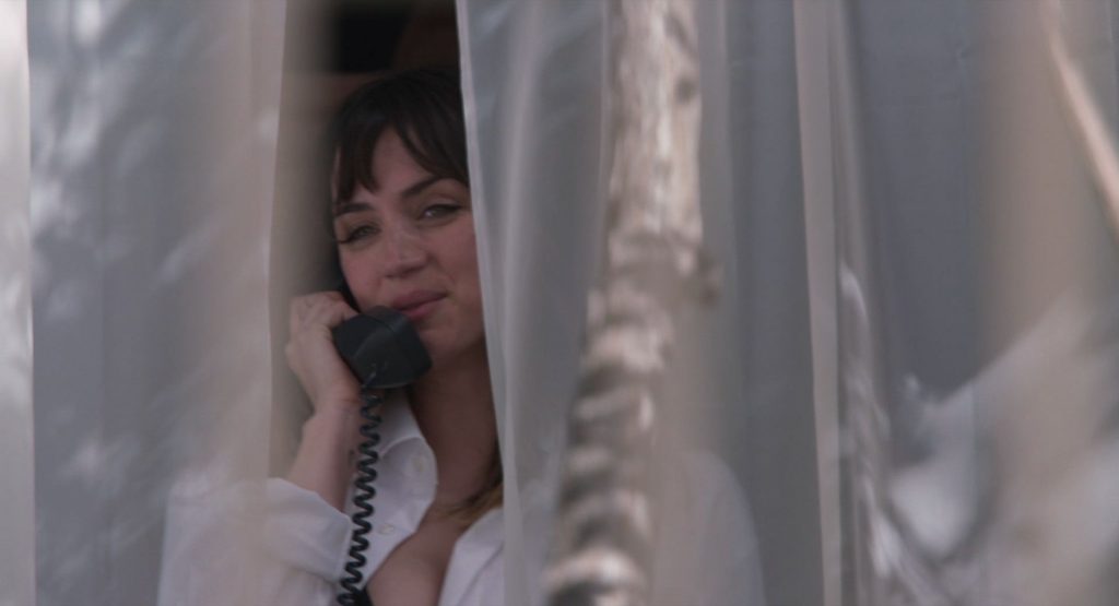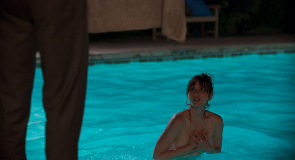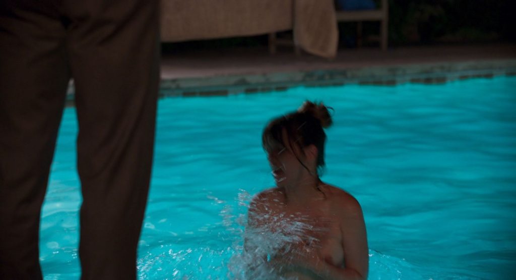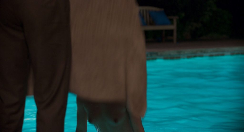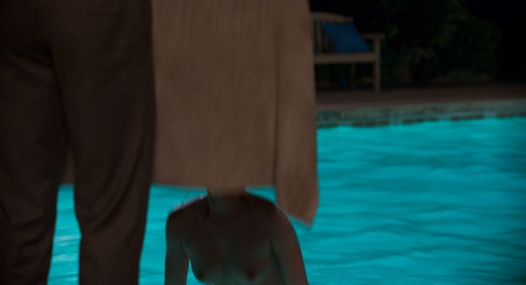 Nella scena più interessante, Ana de Armas nuota a seno nudo nella piscina, mostrando il petto mentre inizia a uscire dalla piscina prima di notare un ragazzo in piedi sul bordo con un asciugamano in mano. Poi chiude le braccia sui seni per un po’, quindi le abbassa e si alza per avvolgersi in un asciugamano.