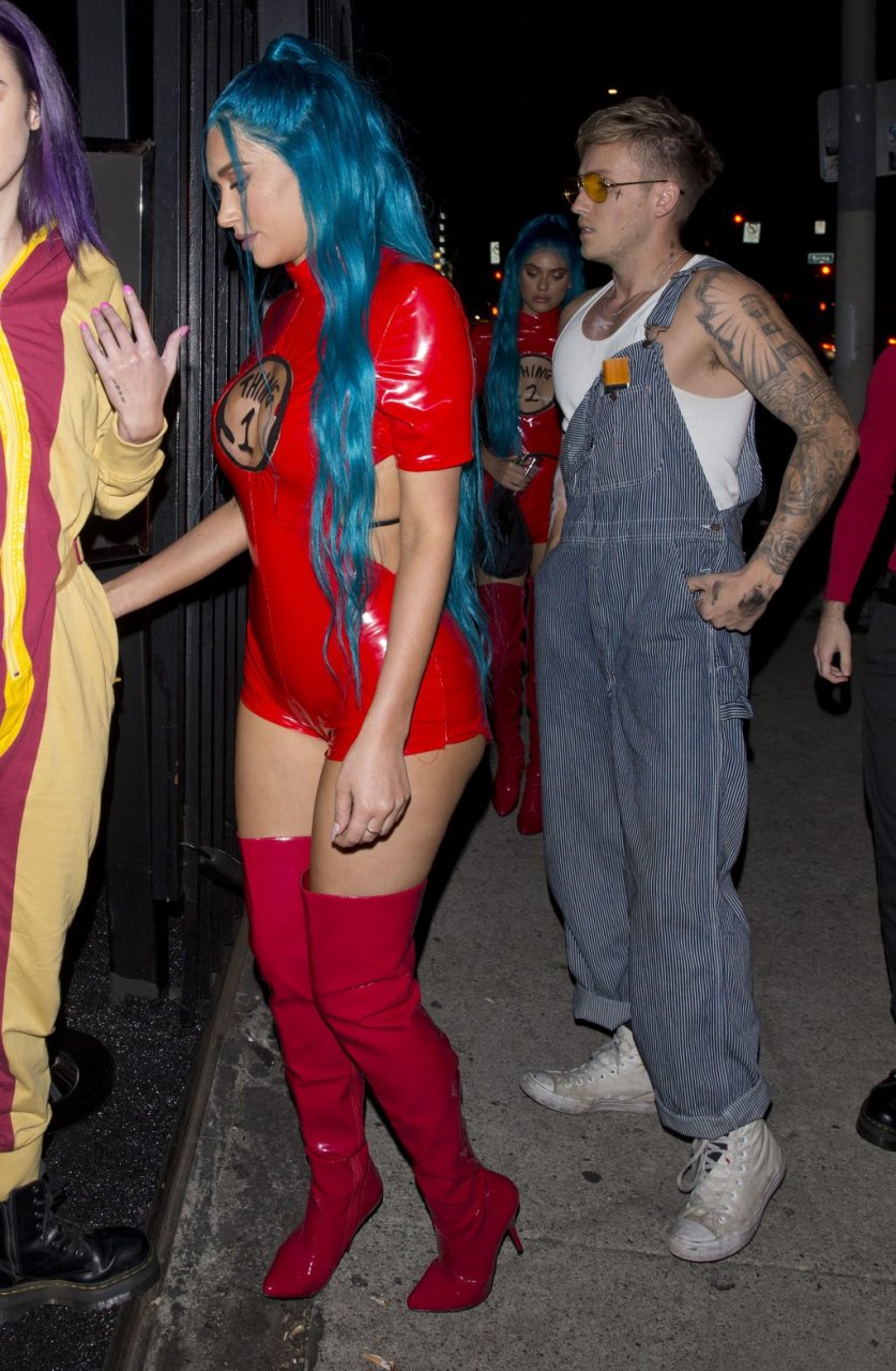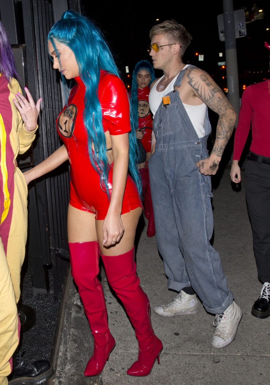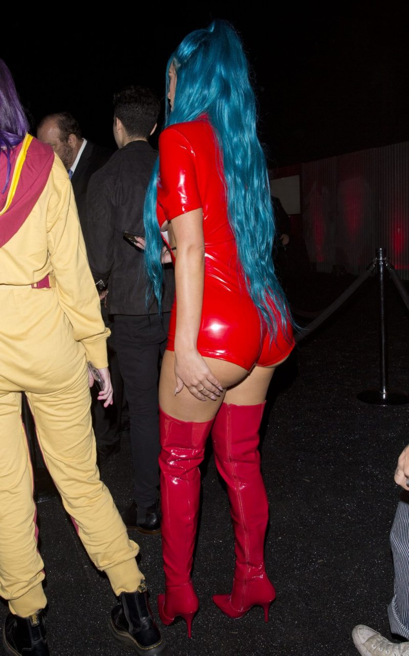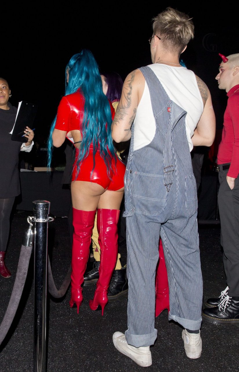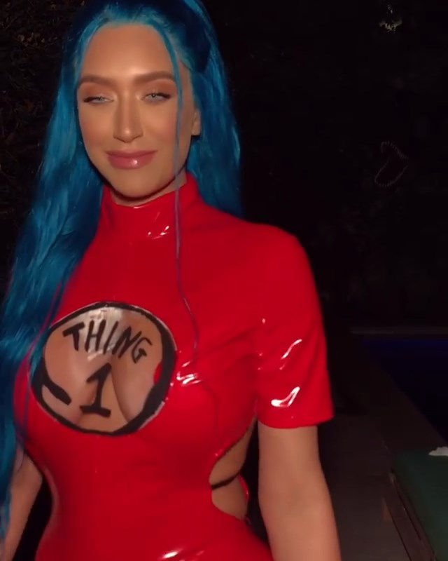 La star di Instagram Anastasia Karanikolaou (Stassiebaby) indossa un outfit in plastica rossa alla festa di Halloween di Just Jared a Hollywood, 27/10/2018.