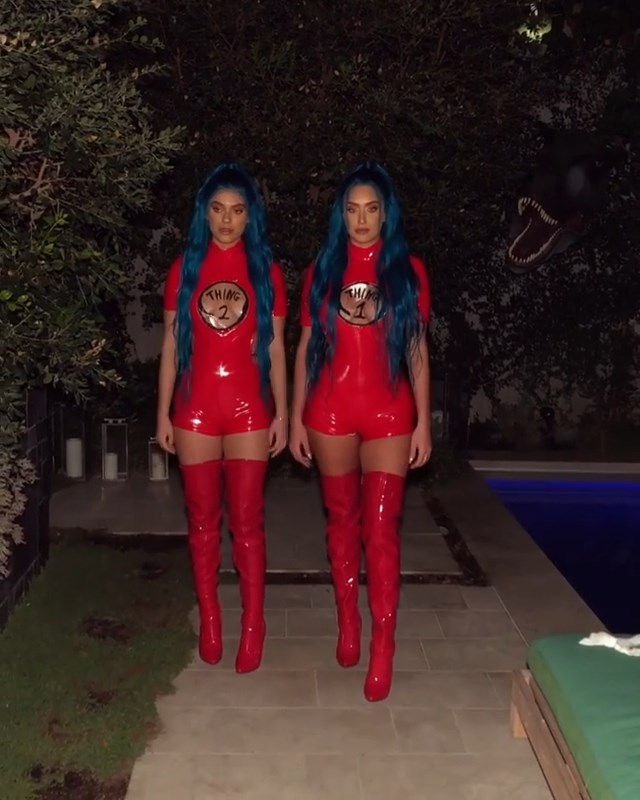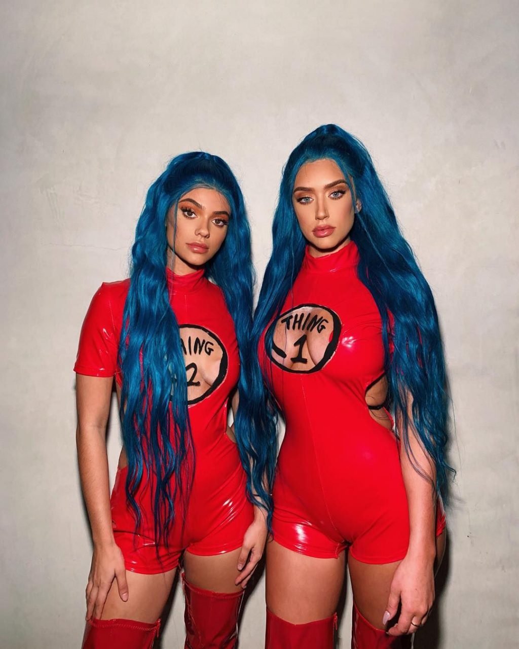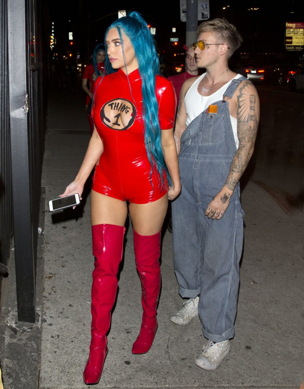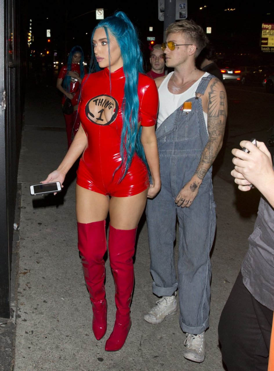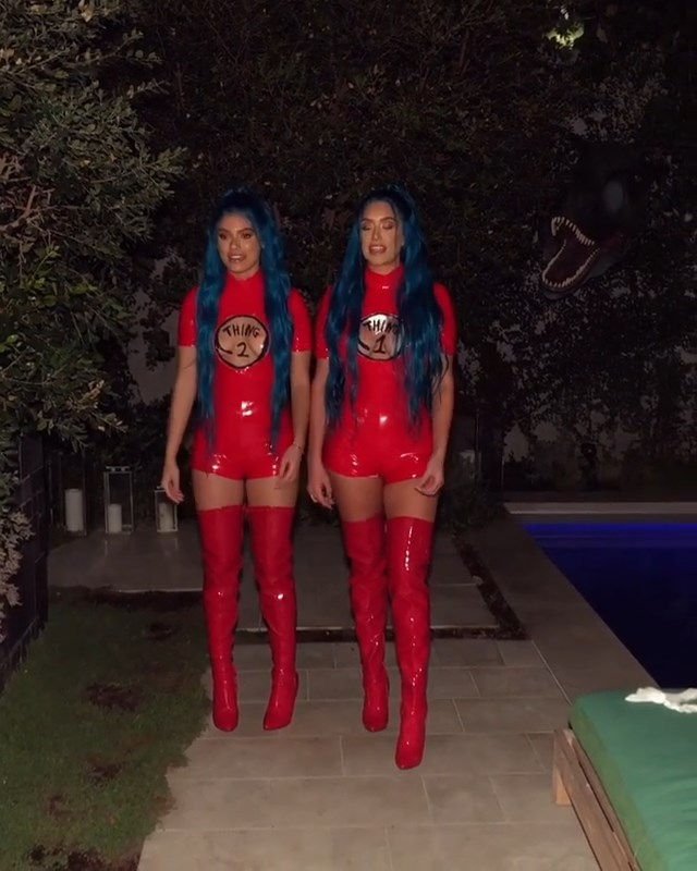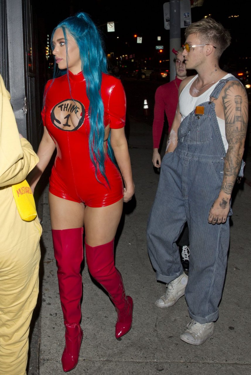La star di Instagram Anastasia Karanikolaou (Stassiebaby) indossa un outfit in plastica rossa alla festa di Halloween di Just Jared a Hollywood, 27/10/2018.