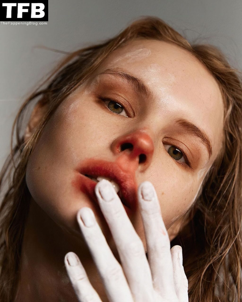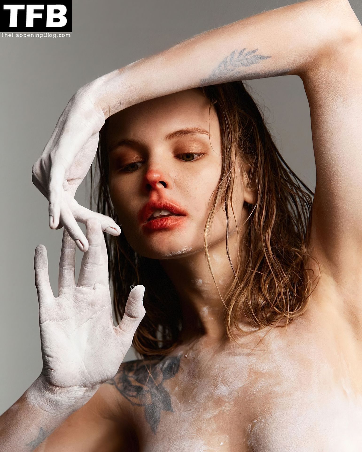La modella/attrice russa Anastasiya Scheglova appare sensuale mentre posa nuda, coprendo i suoi seni naturali in un servizio fotografico di Dasha Mayer (2021).