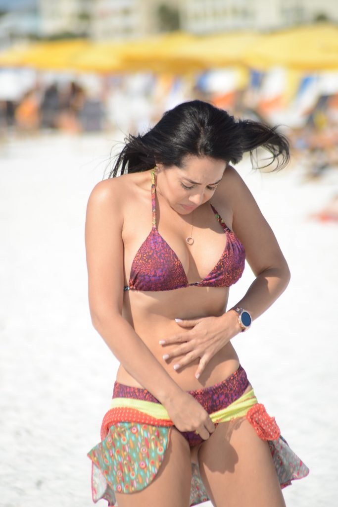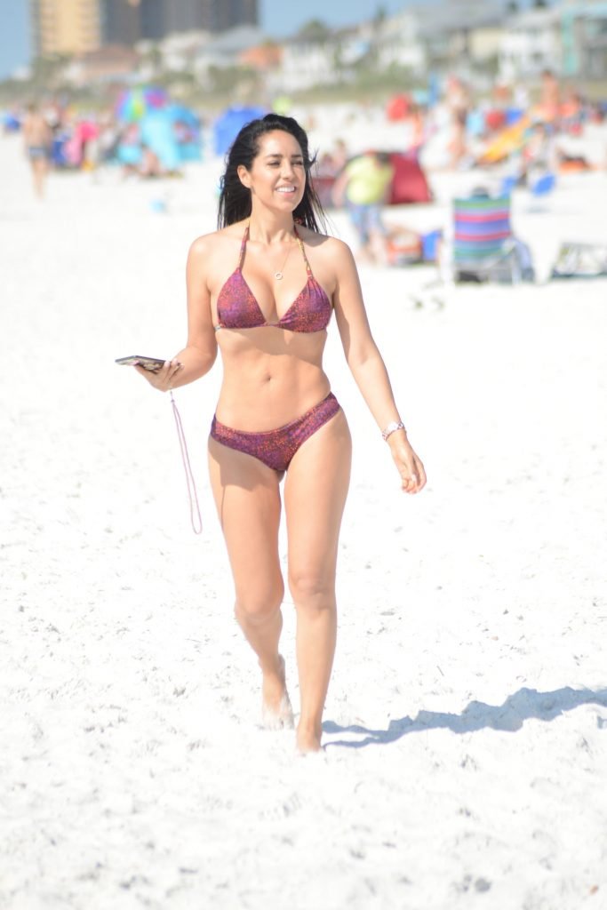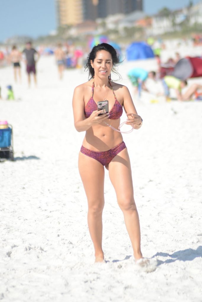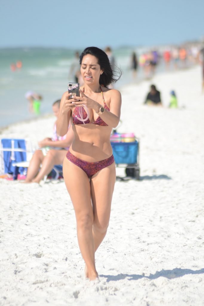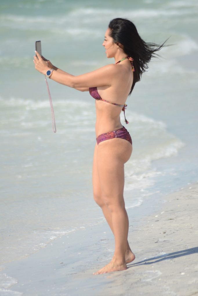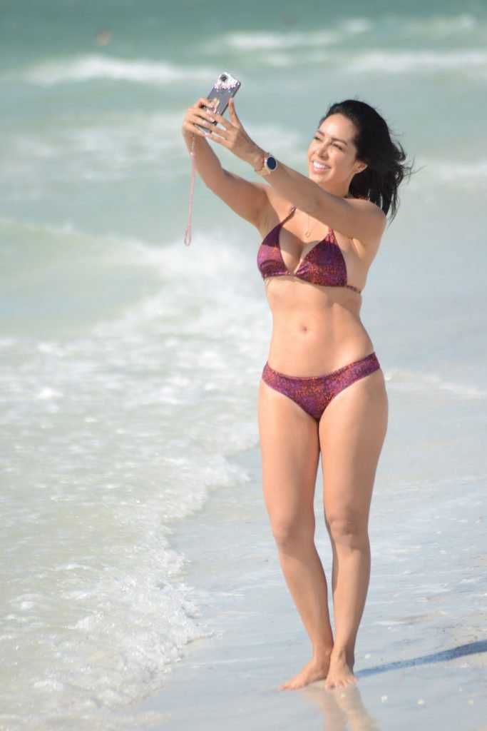 Modella tonica e in forma e commentatrice sportiva Andrea Calle, 35 anni, che si riprende e fa selfie per i suoi fan o per una persona speciale sulla spiaggia di Miami, 24/04/2018. La commentatrice MMA / UFC in forma ha attirato l’attenzione mentre camminava lungo la spiaggia.