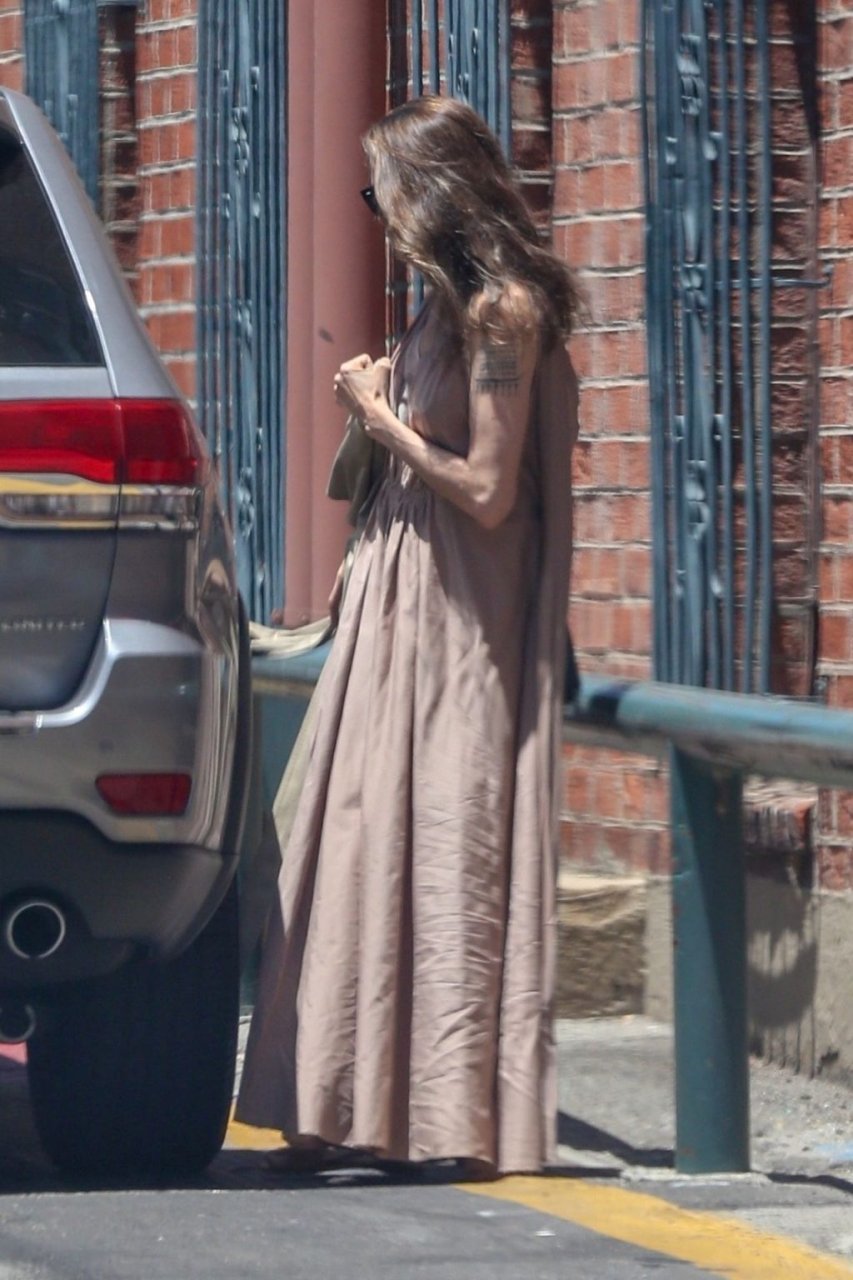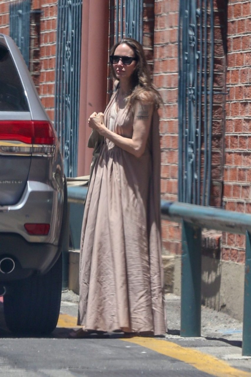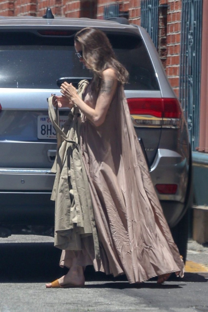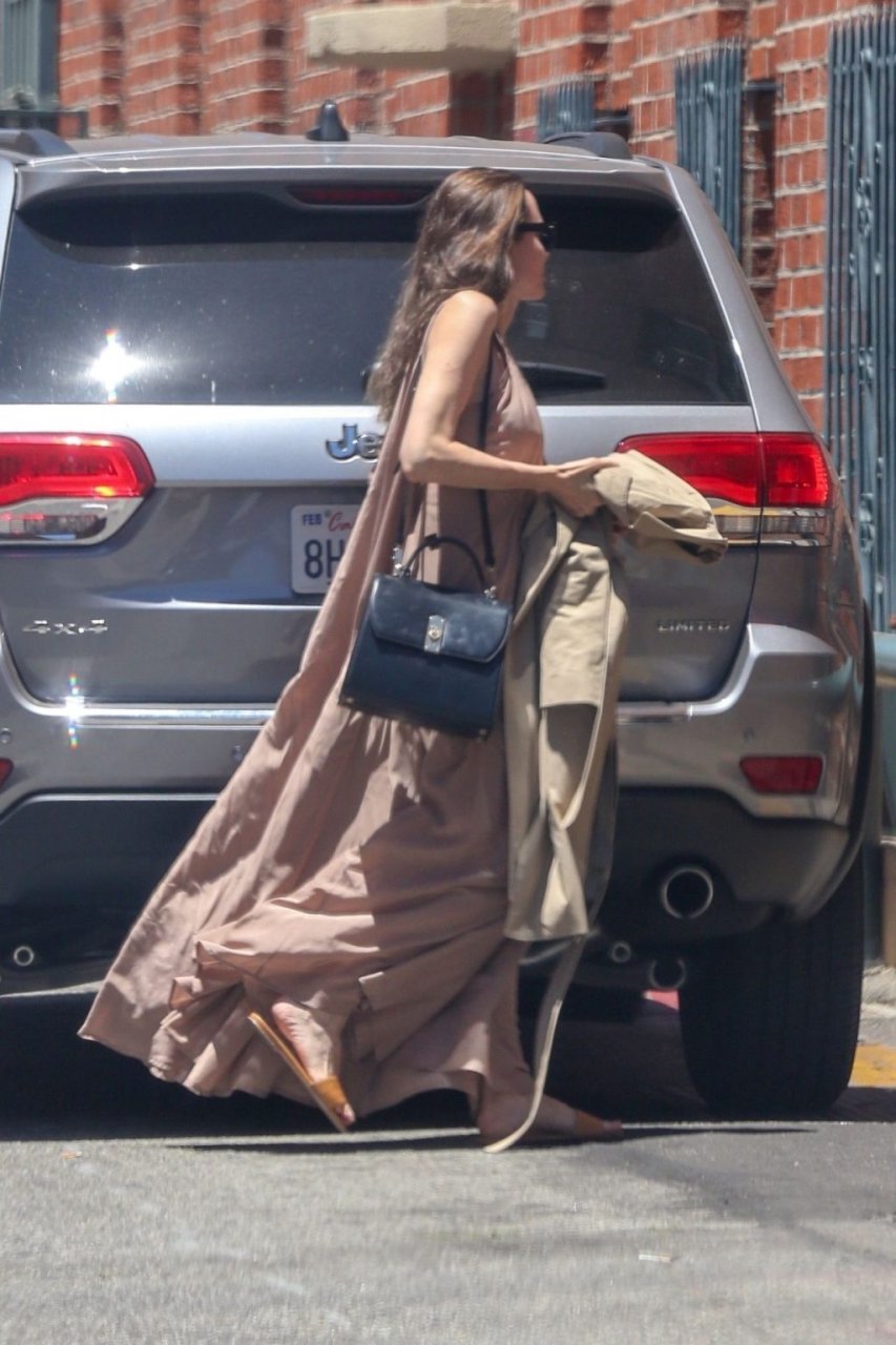 Angelina Jolie è a Beverly Hills in visita a una clinica mentre indossa un abito color nudo e occhiali da sole neri, 01/07/2019. La star di 44 anni ha un assistente che le porta il cappotto.