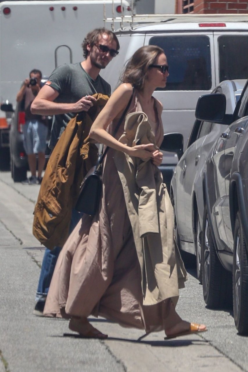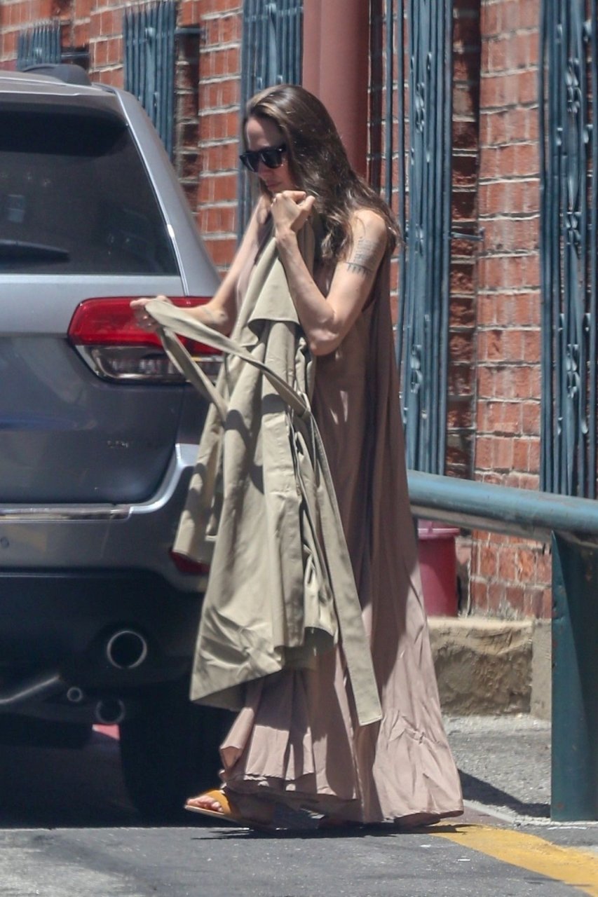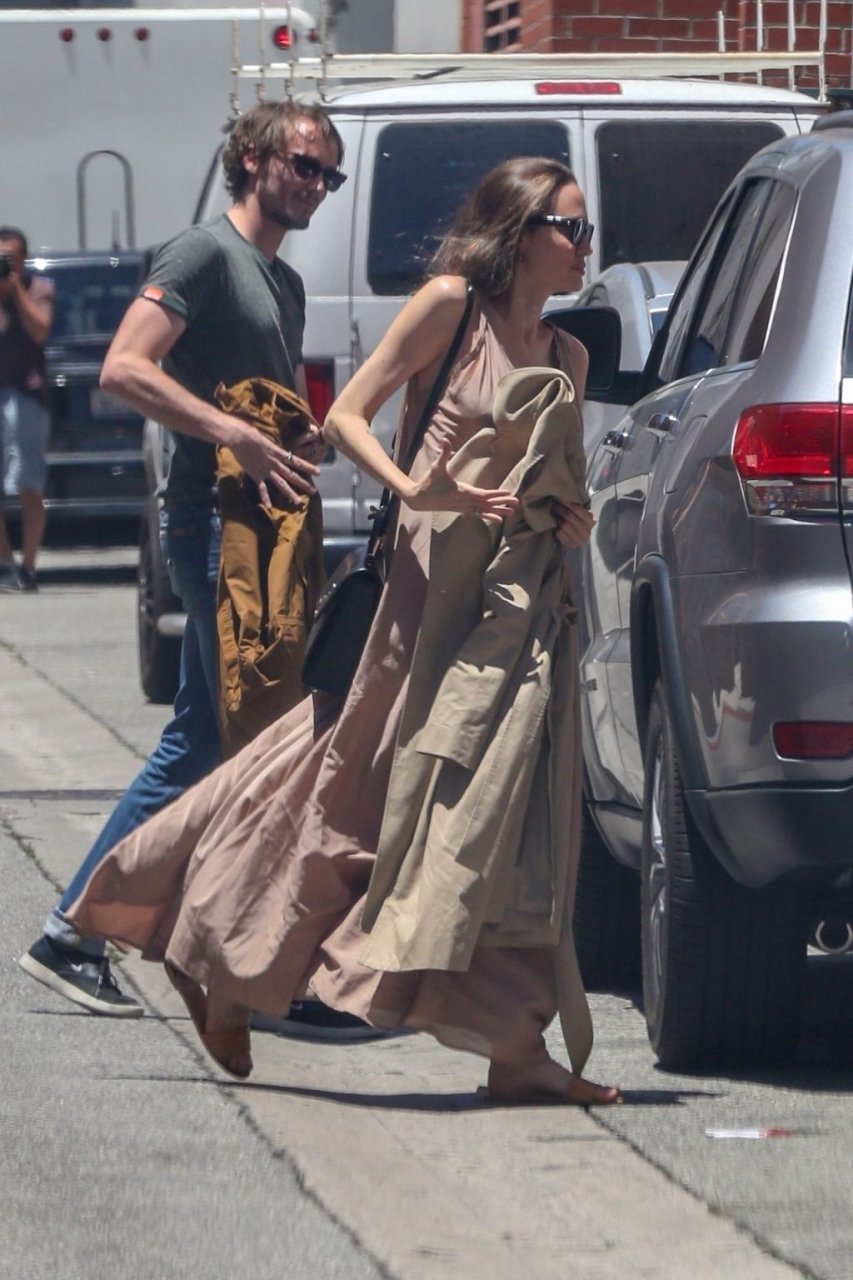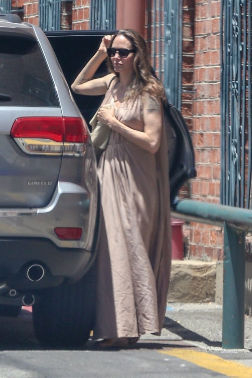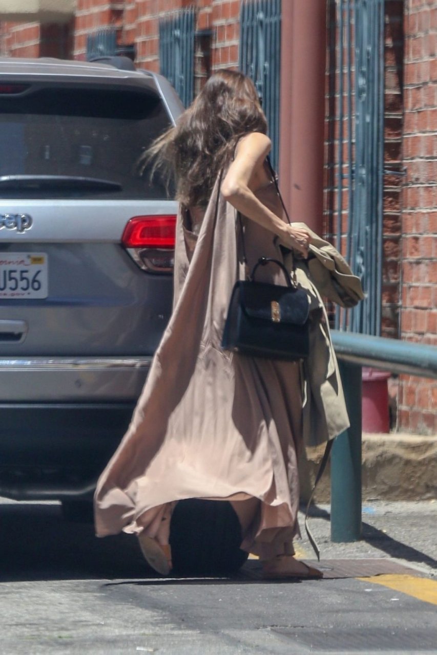 Angelina Jolie è a Beverly Hills in visita a una clinica mentre indossa un abito color nudo e occhiali da sole neri, 01/07/2019. La star di 44 anni ha un assistente che le porta il cappotto.