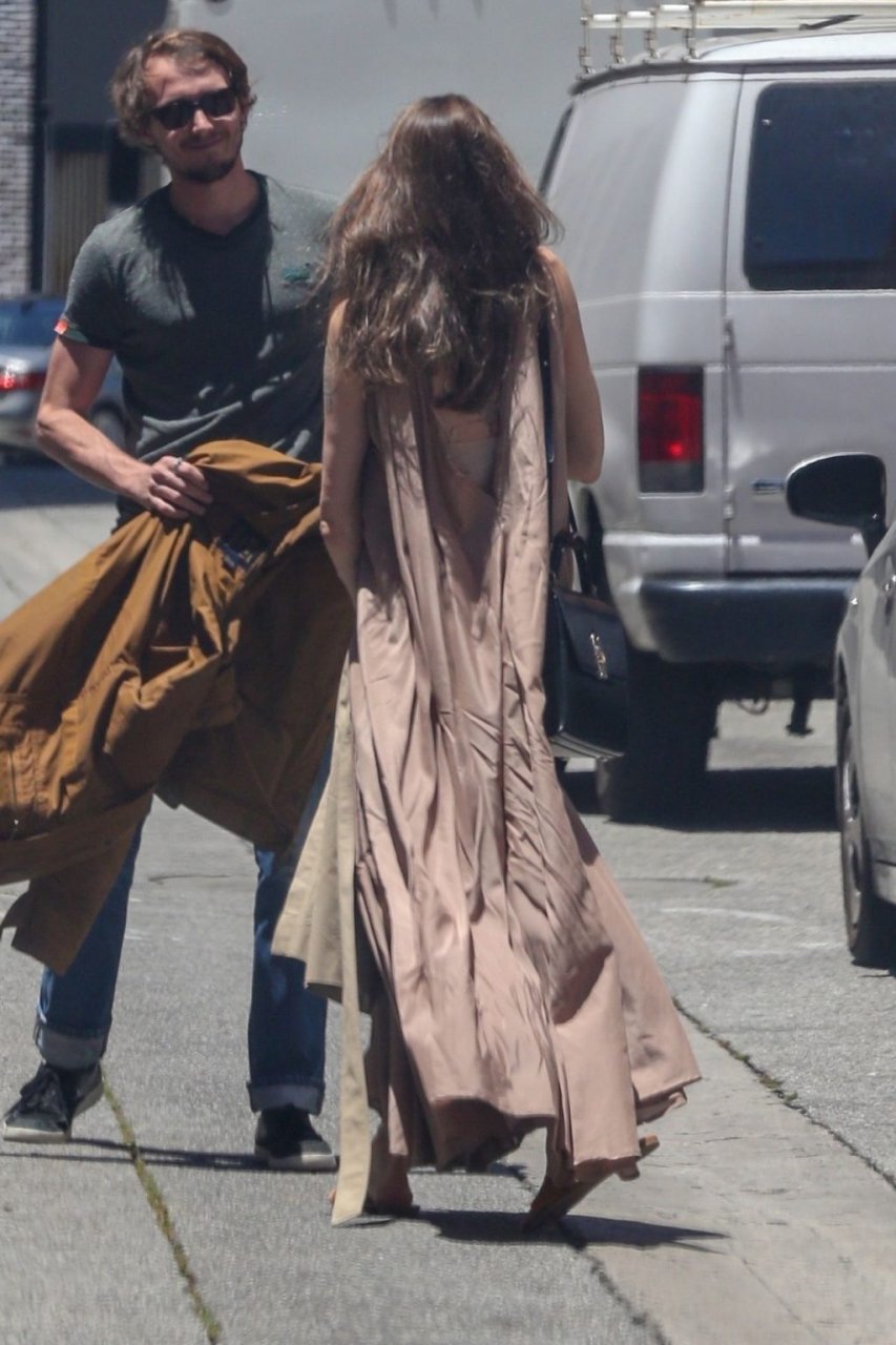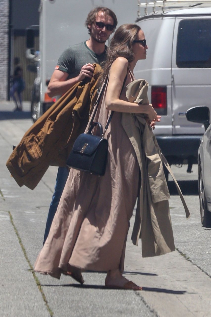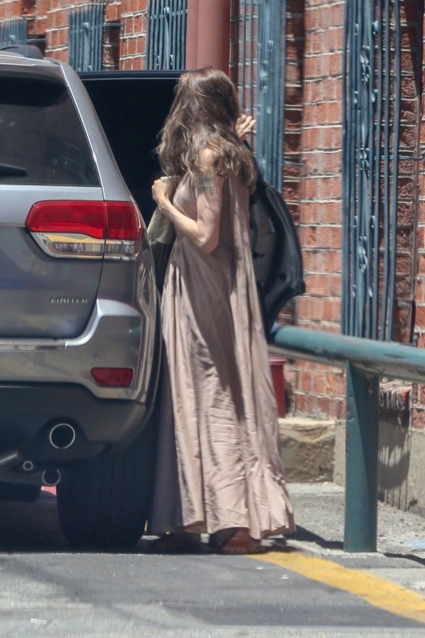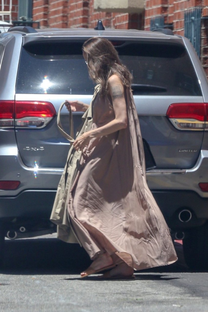 Angelina Jolie è a Beverly Hills in visita a una clinica mentre indossa un abito color nudo e occhiali da sole neri, 01/07/2019. La star di 44 anni ha un assistente che le porta il cappotto.