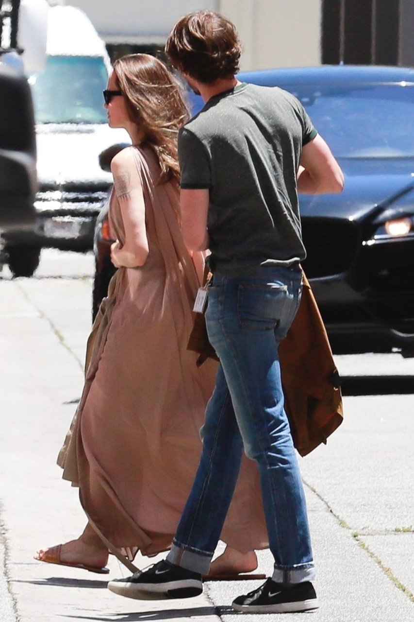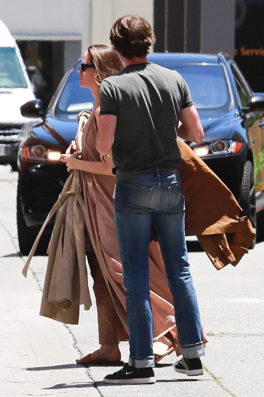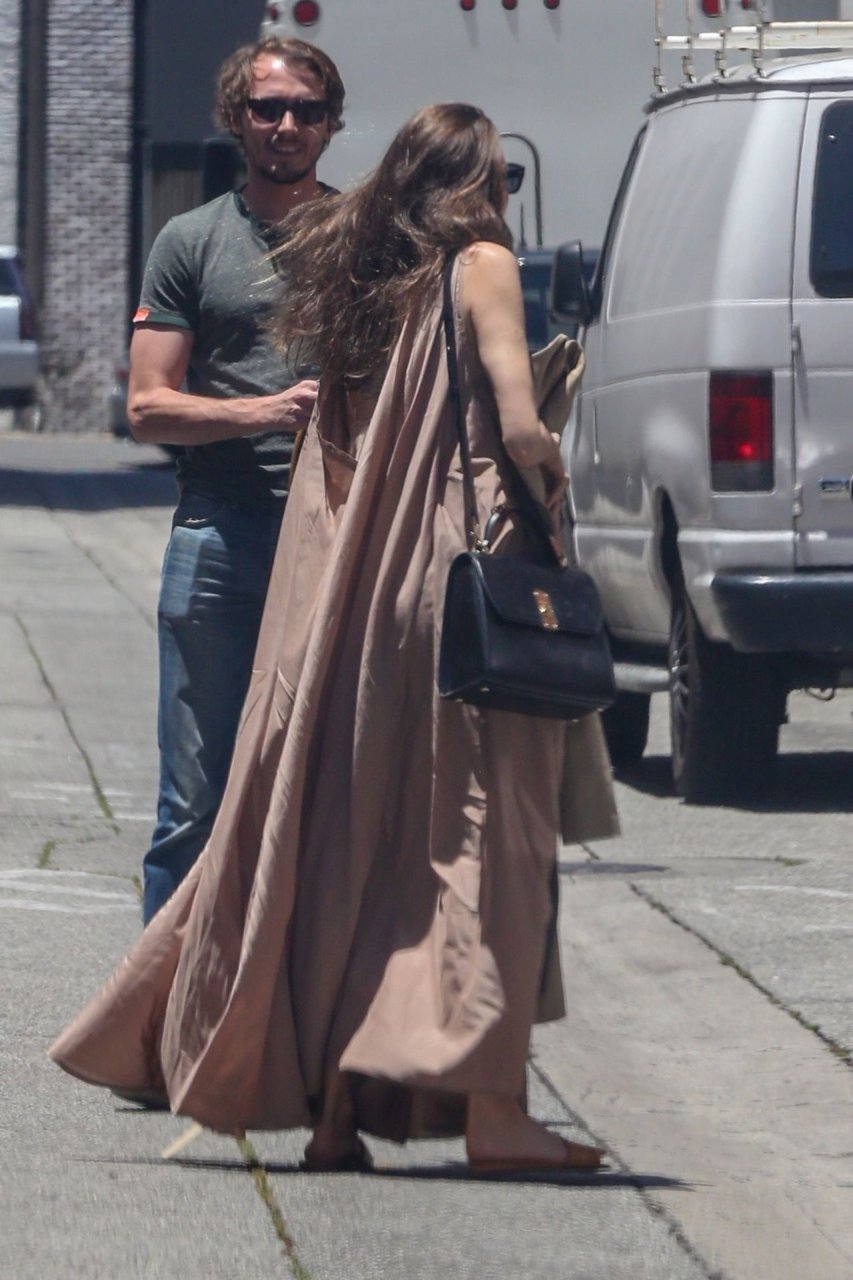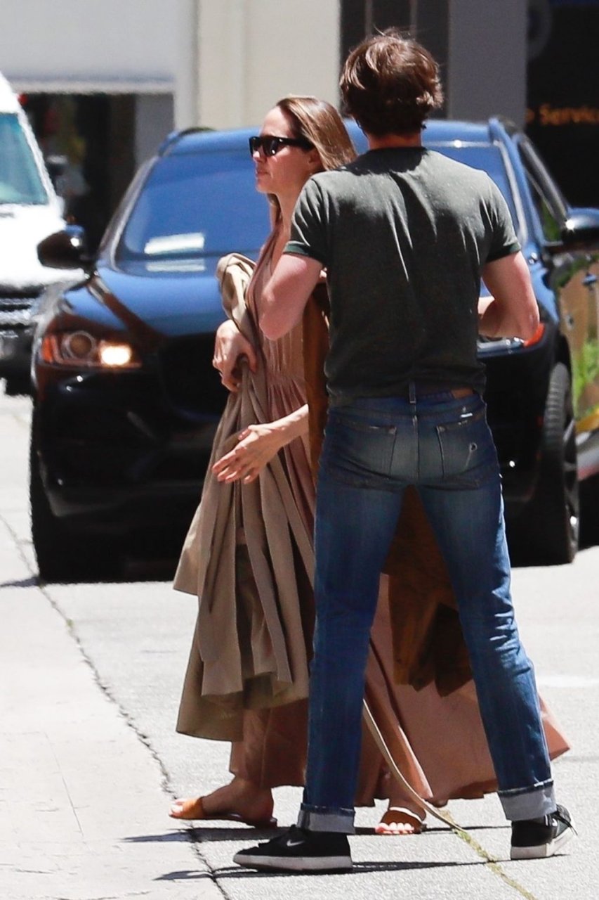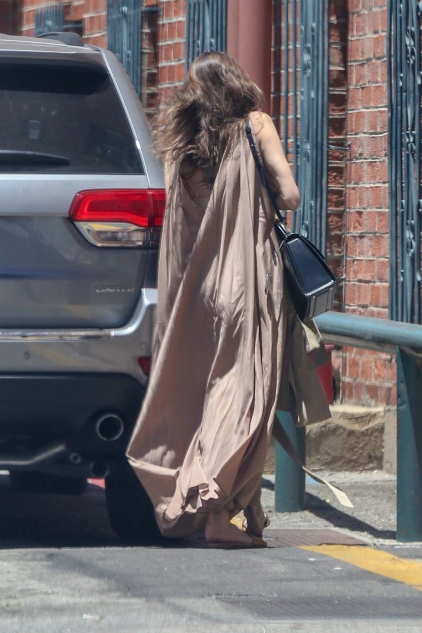 Angelina Jolie è a Beverly Hills in visita a una clinica mentre indossa un abito color nudo e occhiali da sole neri, 01/07/2019. La star di 44 anni ha un assistente che le porta il cappotto.