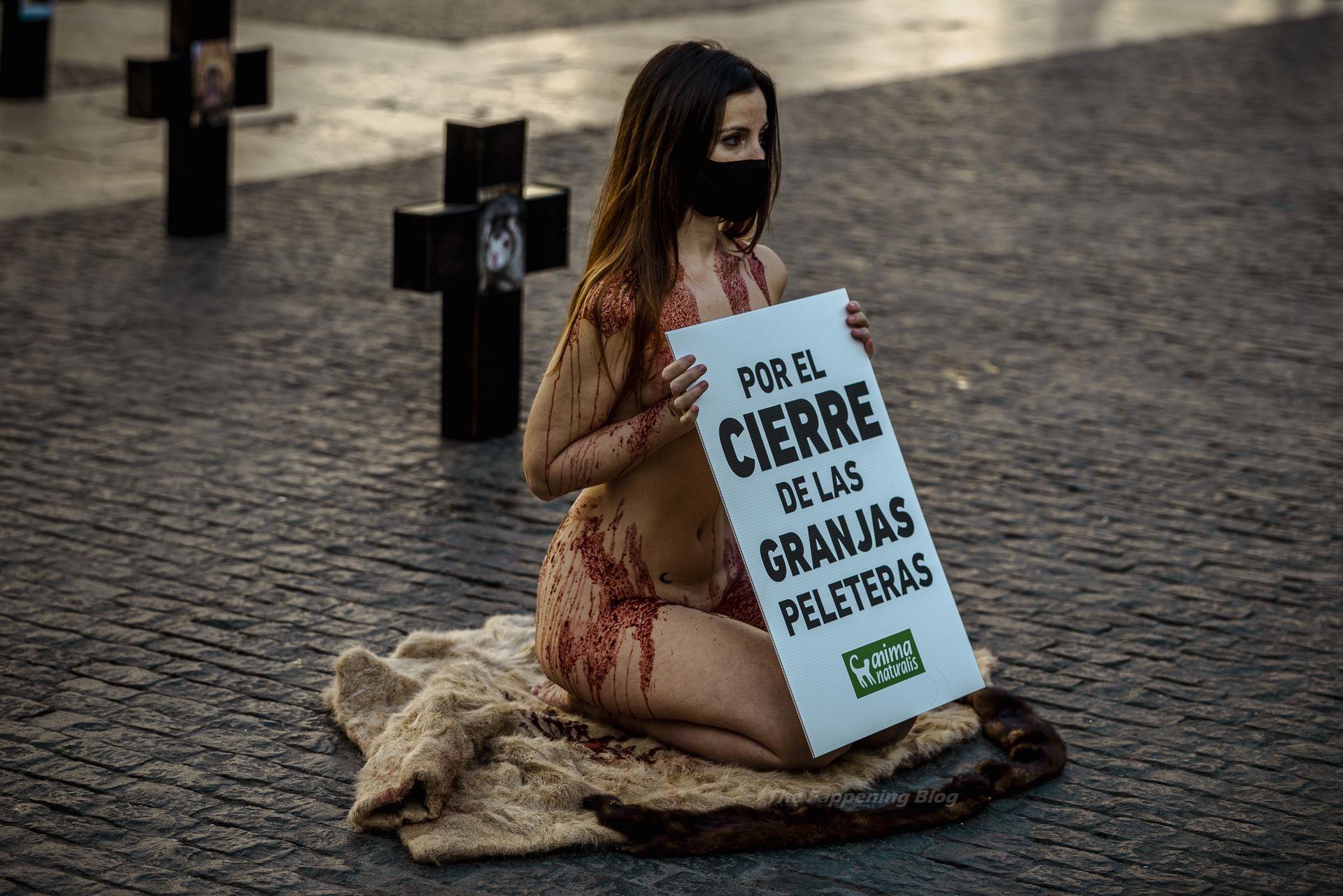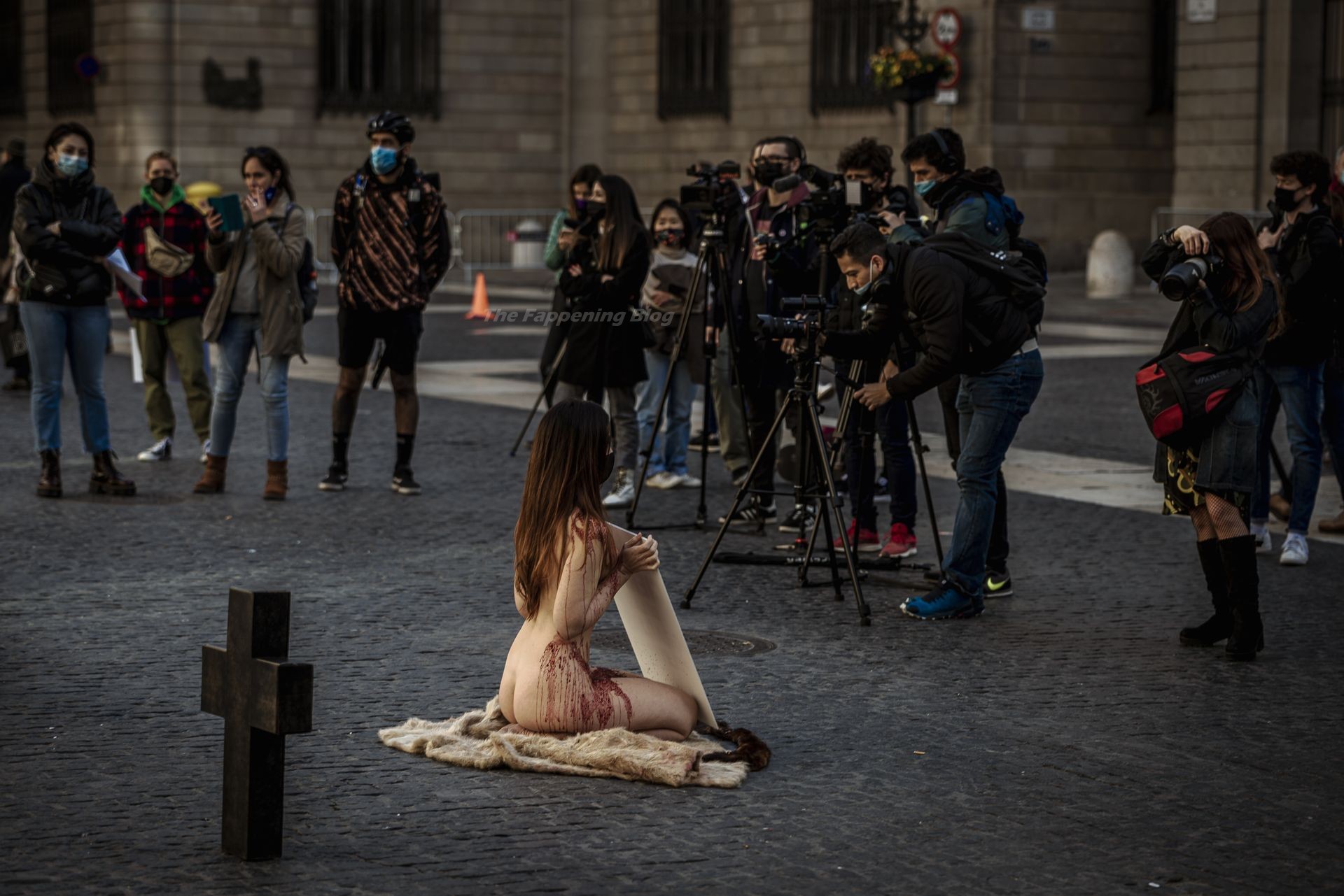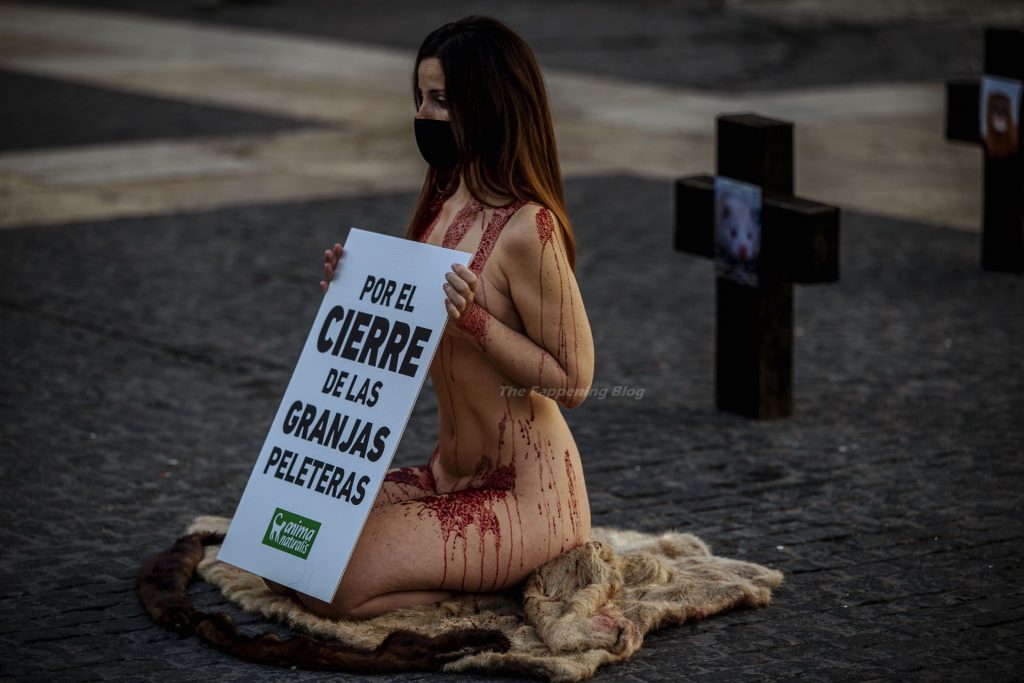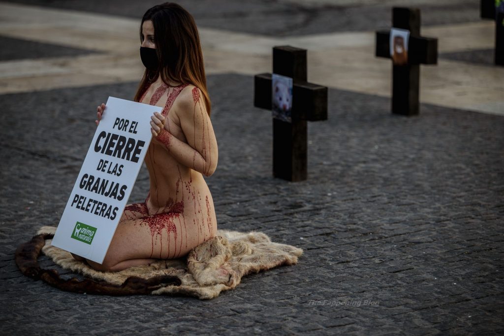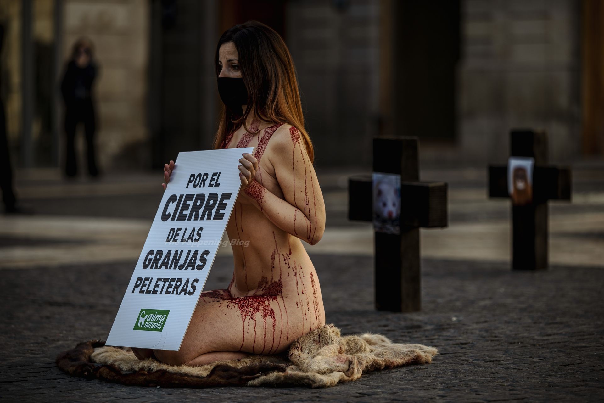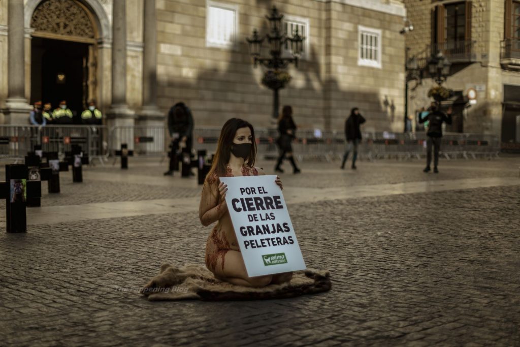 Un attivista per i diritti degli animali nudo coperto di sangue finto chiede la chiusura degli allevamenti di pellicce davanti alla stampa radunata durante una protesta per i diritti degli animali organizzata a Barcellona, 21/01/2021.