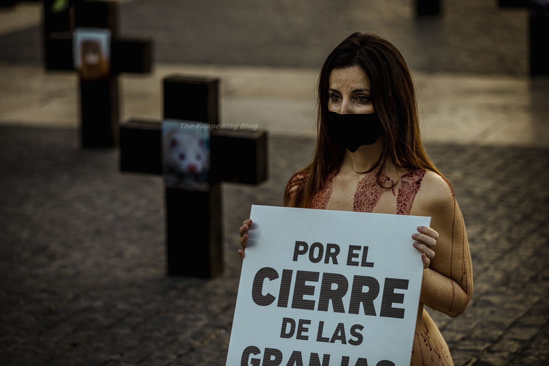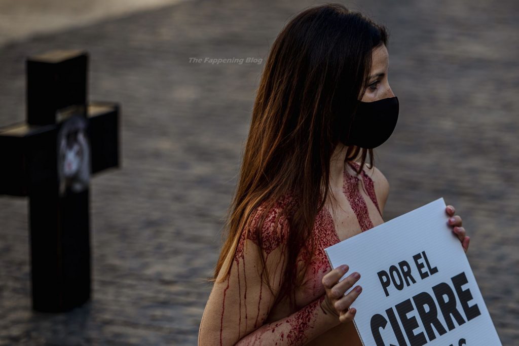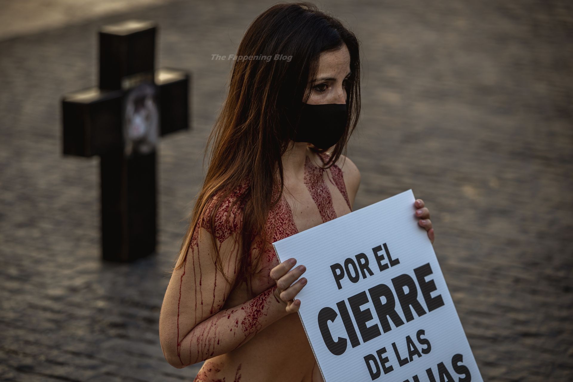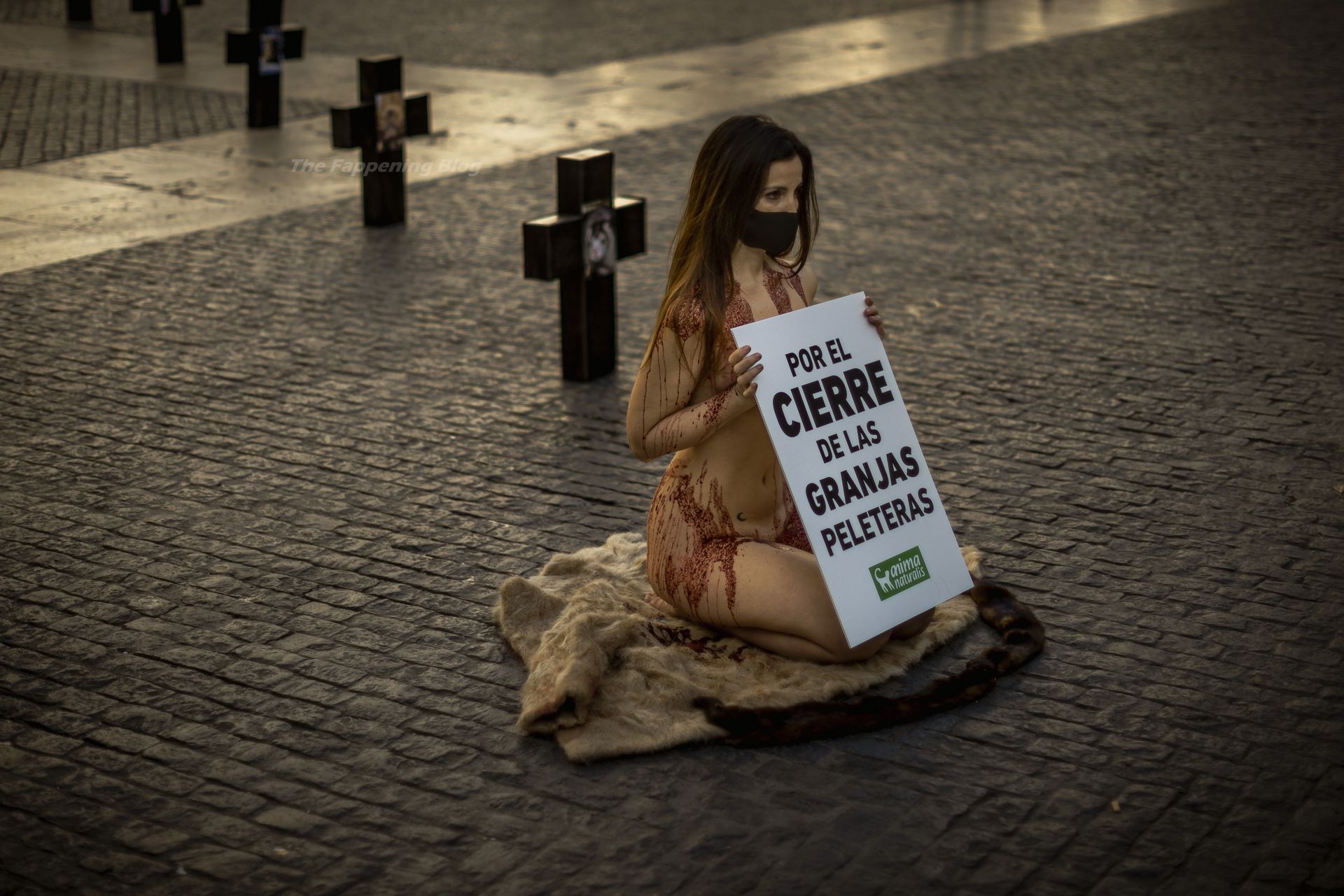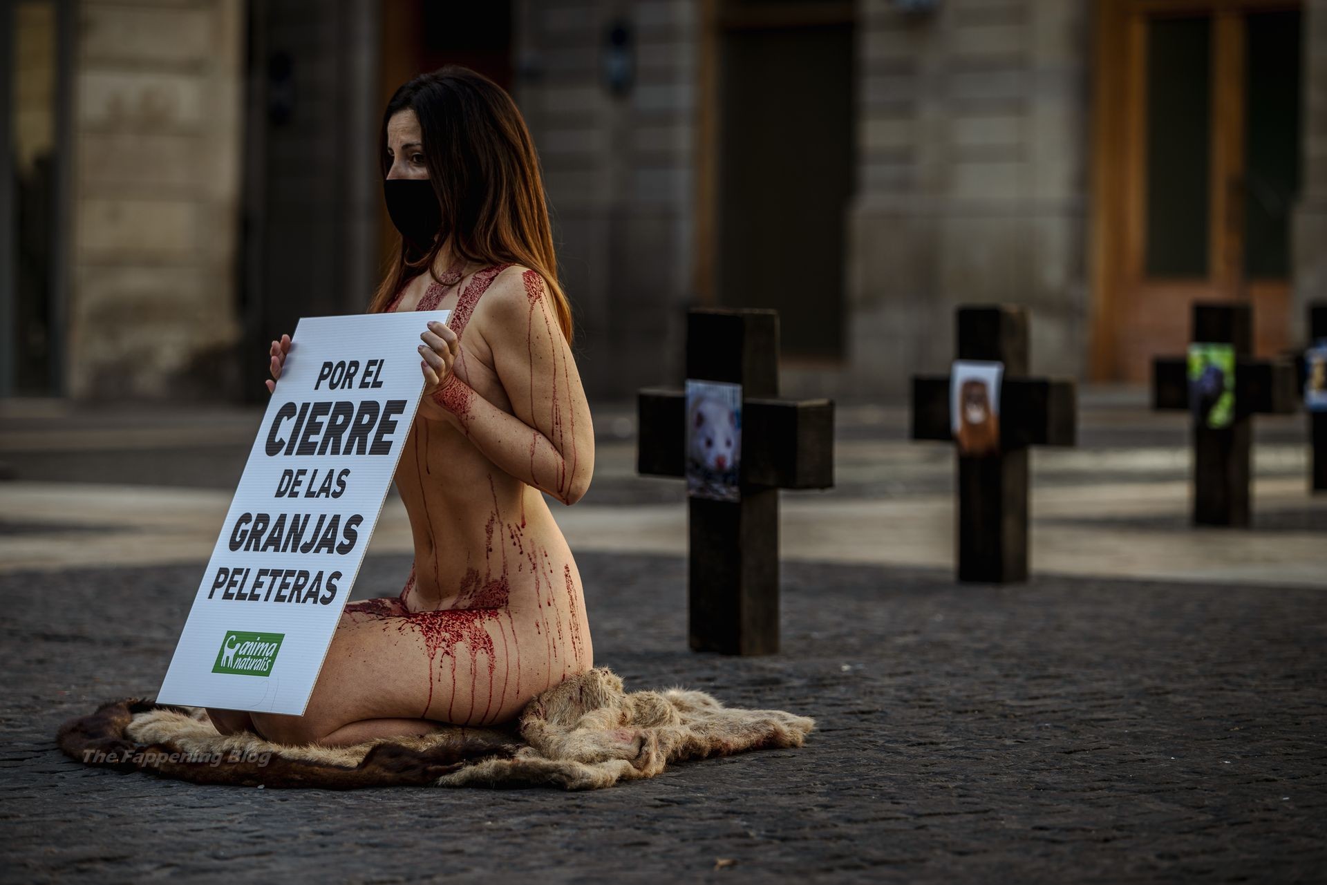 Un attivista per i diritti degli animali nudo coperto di sangue finto chiede la chiusura degli allevamenti di pellicce davanti alla stampa radunata durante una protesta per i diritti degli animali organizzata a Barcellona, 21/01/2021.