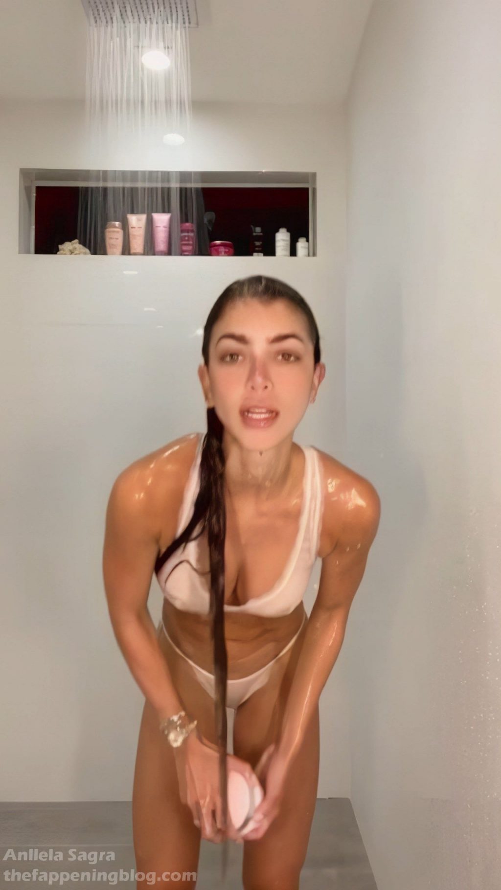 Fitness model Anllela Sagra mostra i suoi seni leggermente nudi in lingerie di pizzo mentre posa bagnata sotto la doccia – Instagram, 09/03/2020.