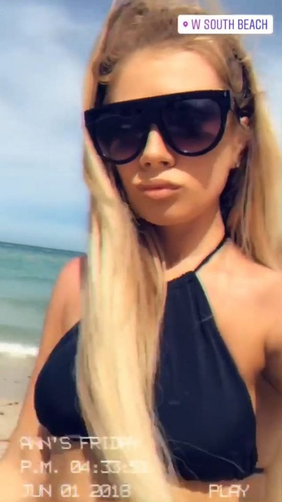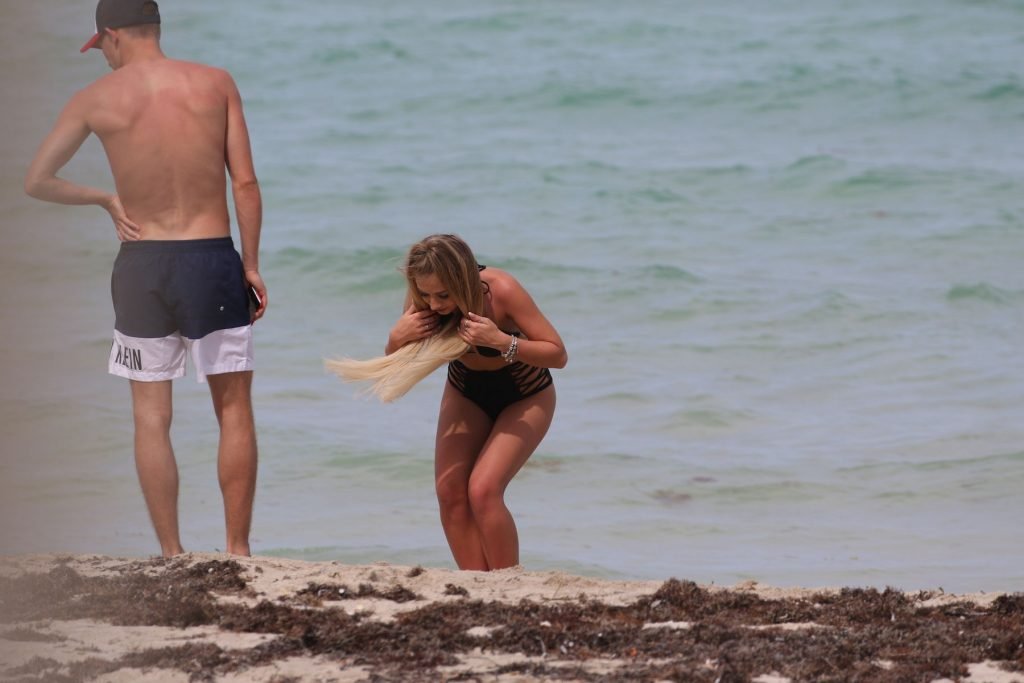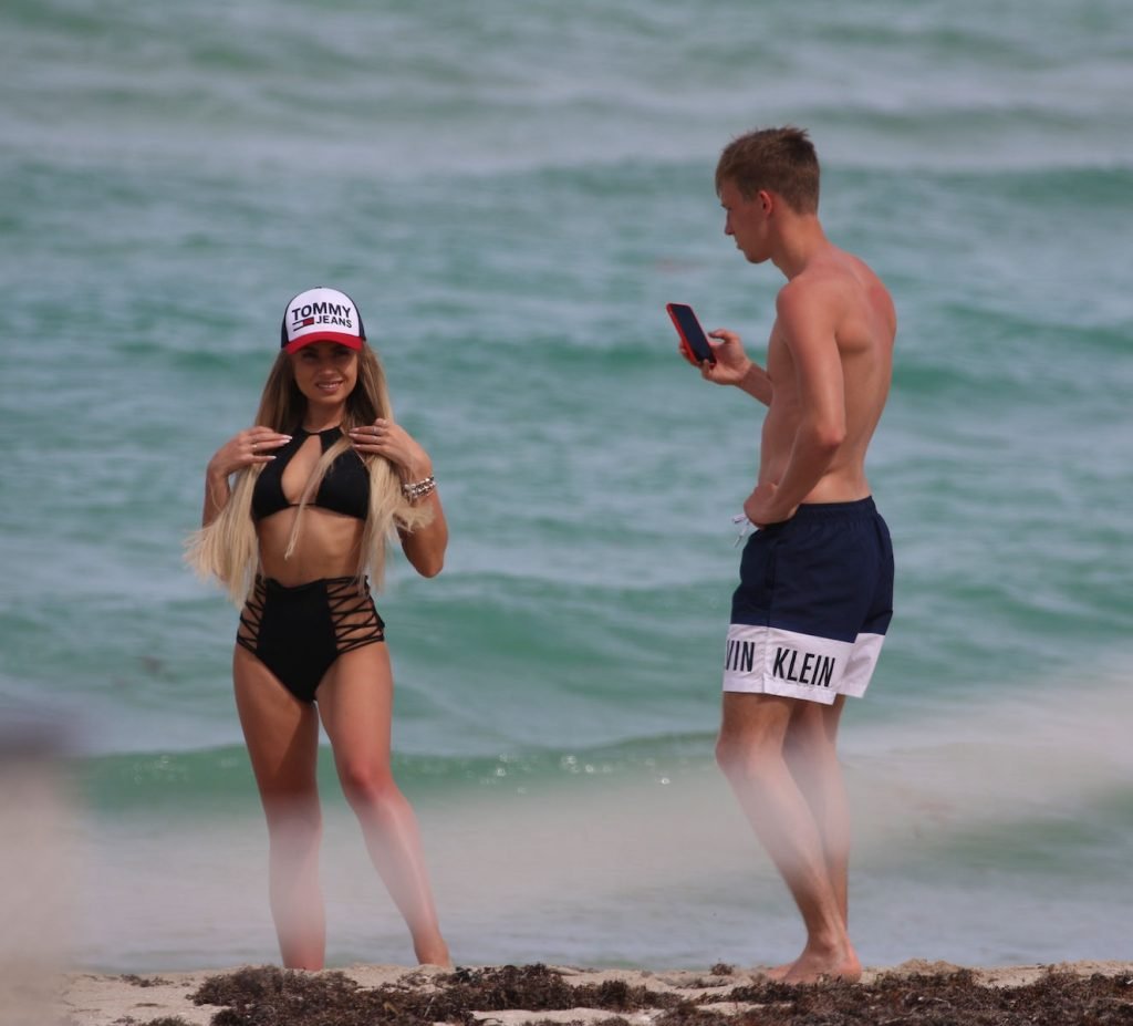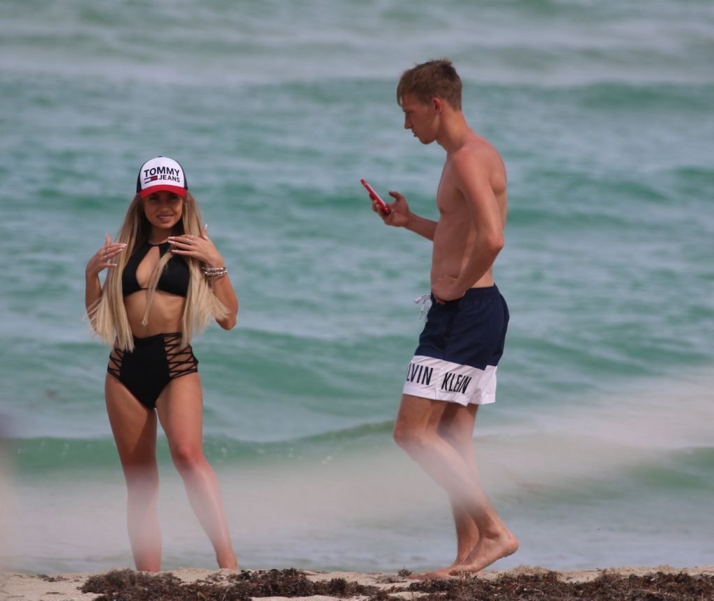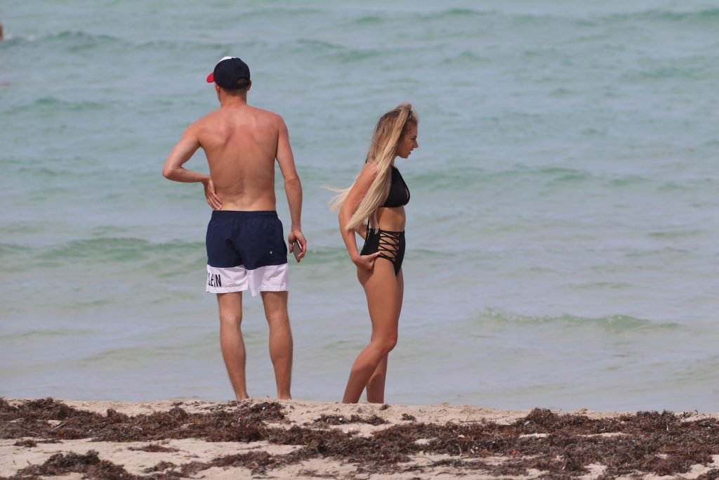 Calciatore Valeriy Luchkevych (Standard Liège) è stato visto con la sua fidanzata ucraina, la modella Anna (Anya Opalnic) sulla spiaggia di Miami Beach, 02/06/2018. Anya ha posato per le foto con un cappellino Tommy Jeans e un bikini nero mentre Valeriy scattava foto con il suo telefono.