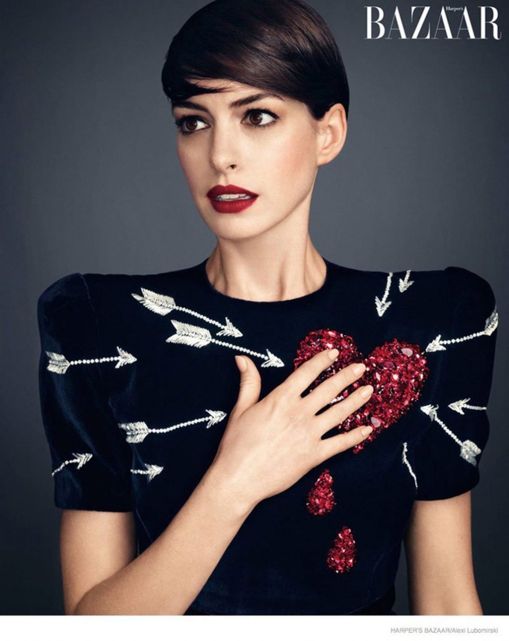 L’attrice hollywoodiana Anne Hathaway è diventata la protagonista del numero di novembre 2014 di Harper’s Bazaar US. Il servizio fotografico è stato realizzato in due colori – nero e rosso. Per la copertina, l’attrice ha indossato un magnifico abito rosso di Giorgio Armani.