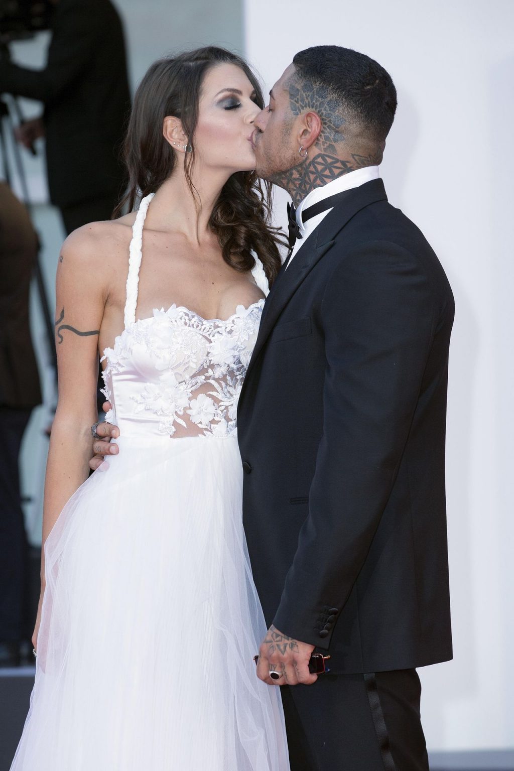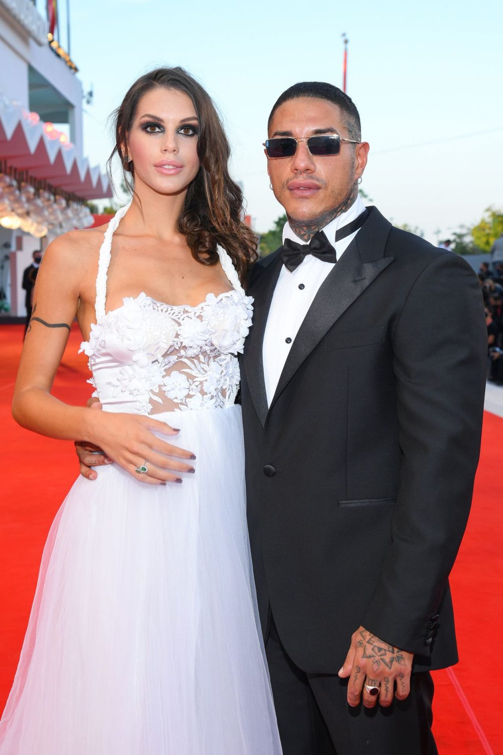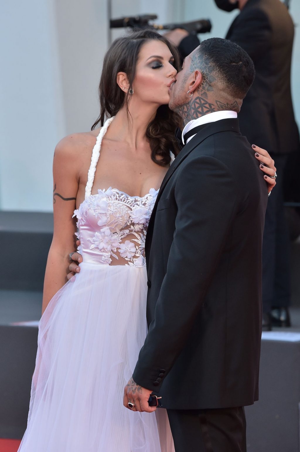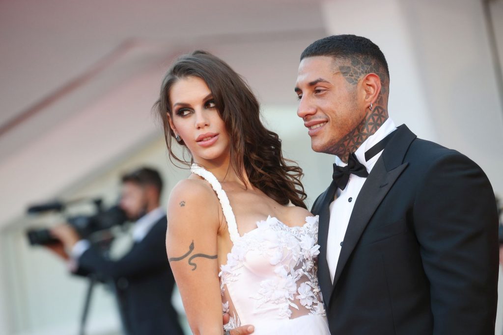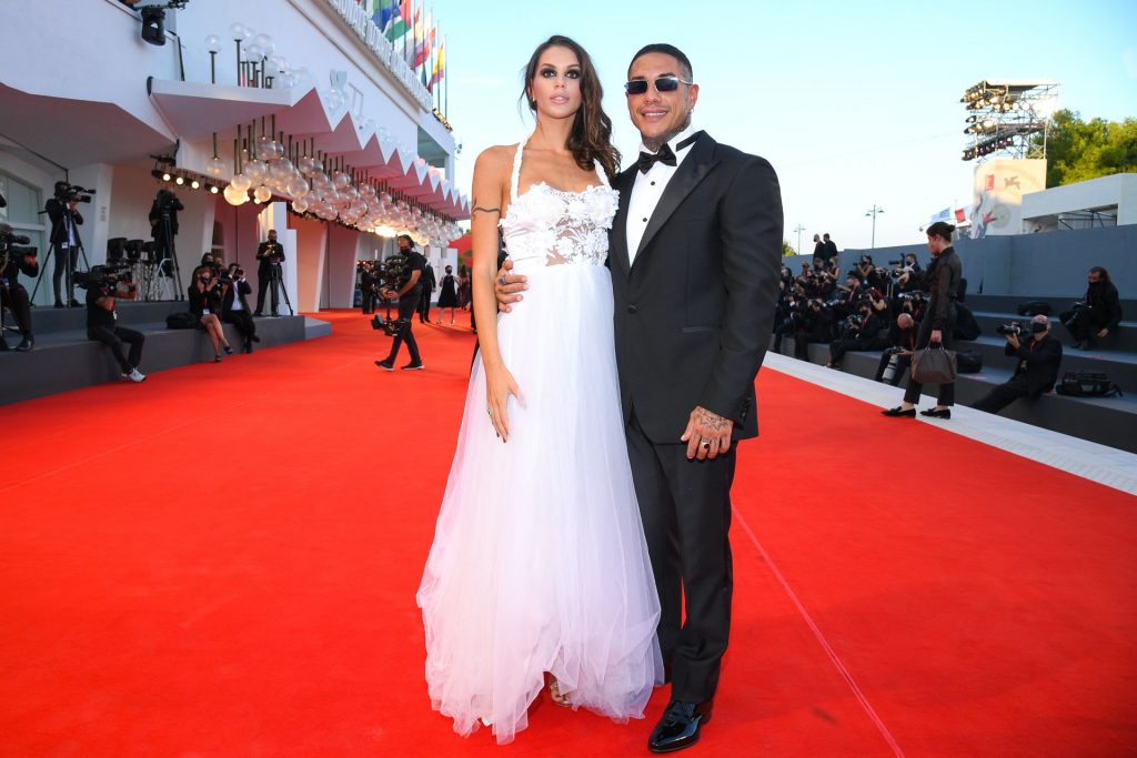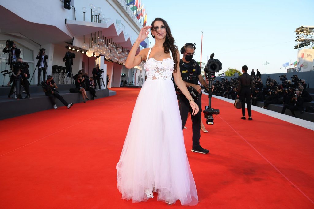 Sexy modella italiana Antonella Fiordelisi mostra il suo décolleté posando con un abito bianco sul red carpet prima del film “Le Sorelle Macaluso” al 77° Festival del Cinema di Venezia a Venezia, 09/09/2020.