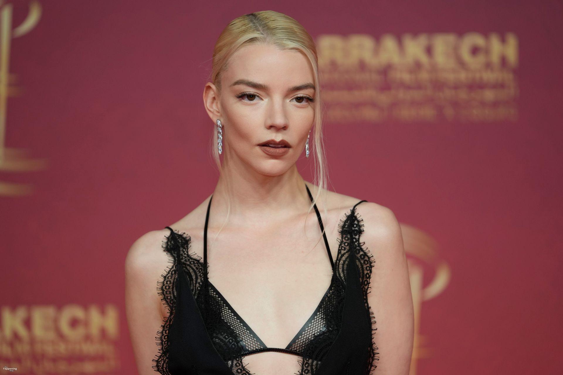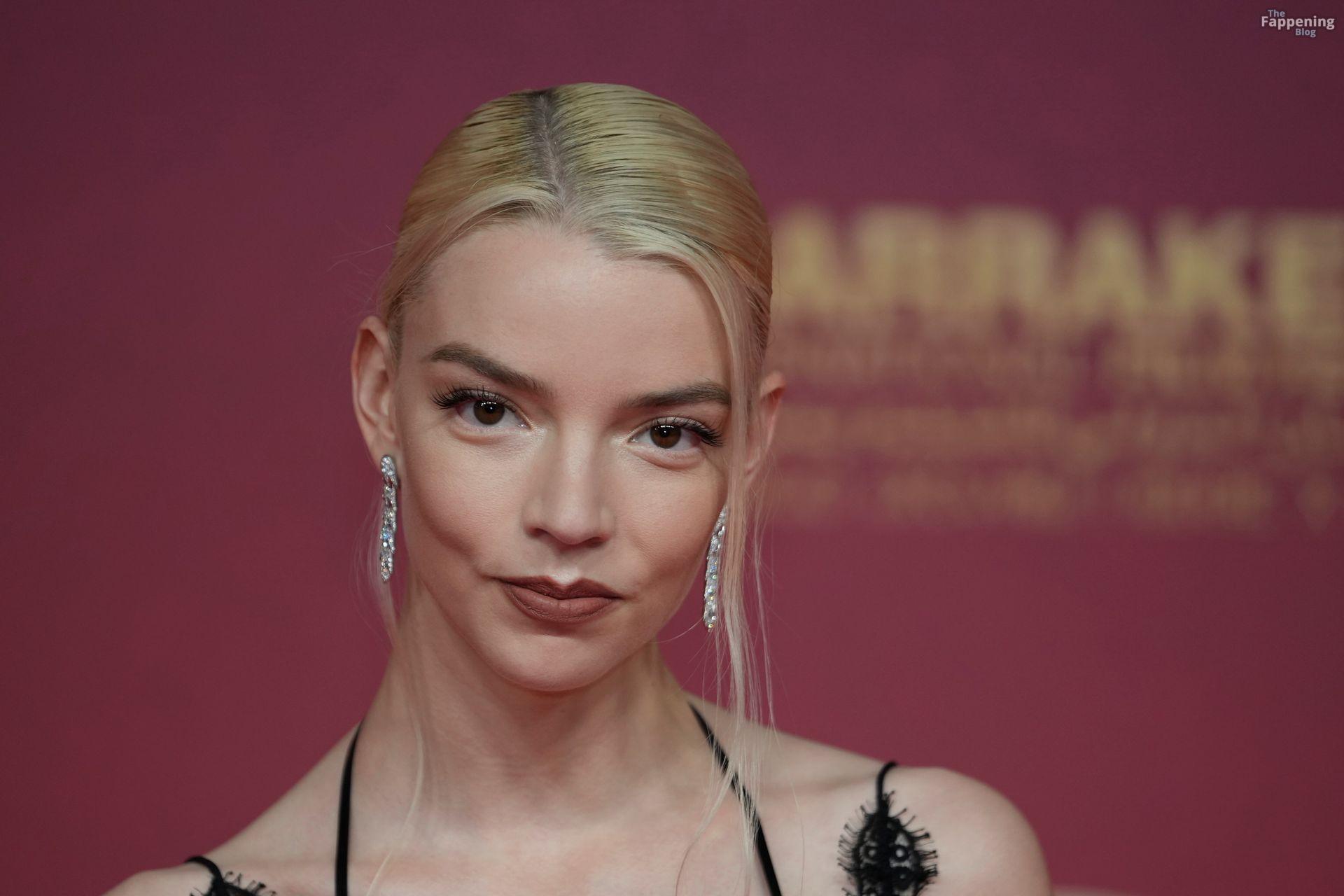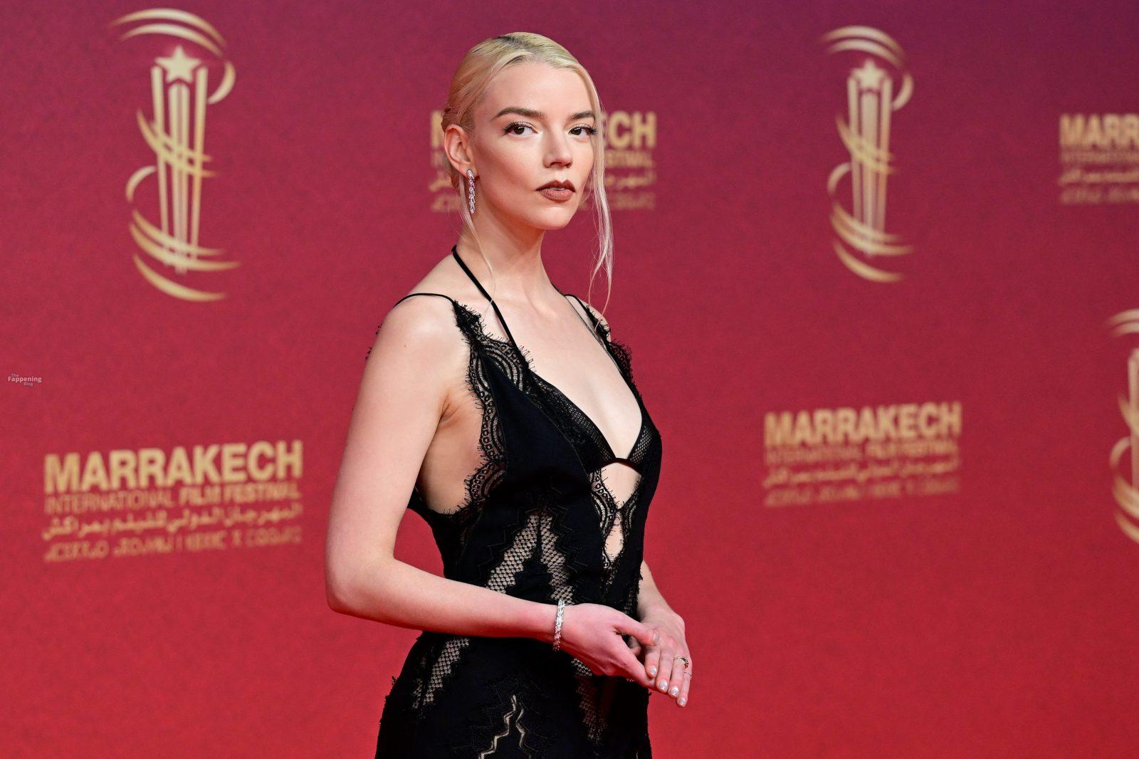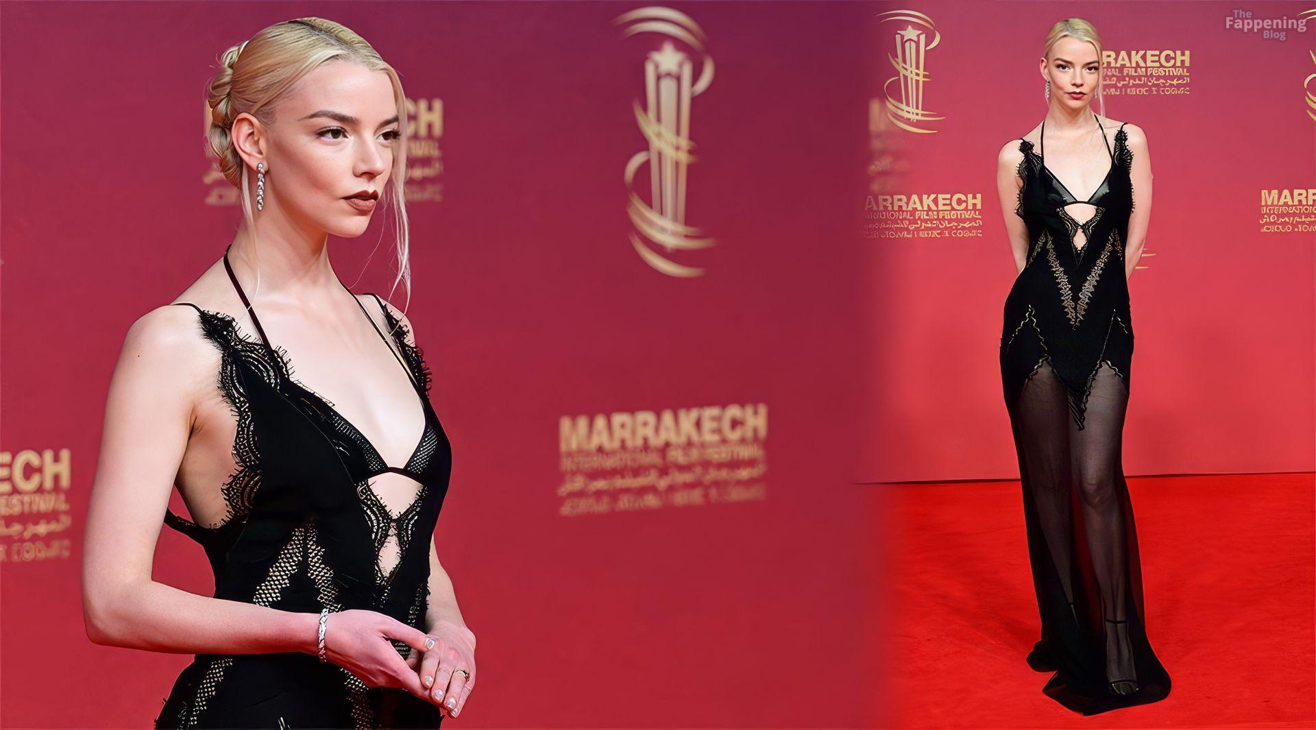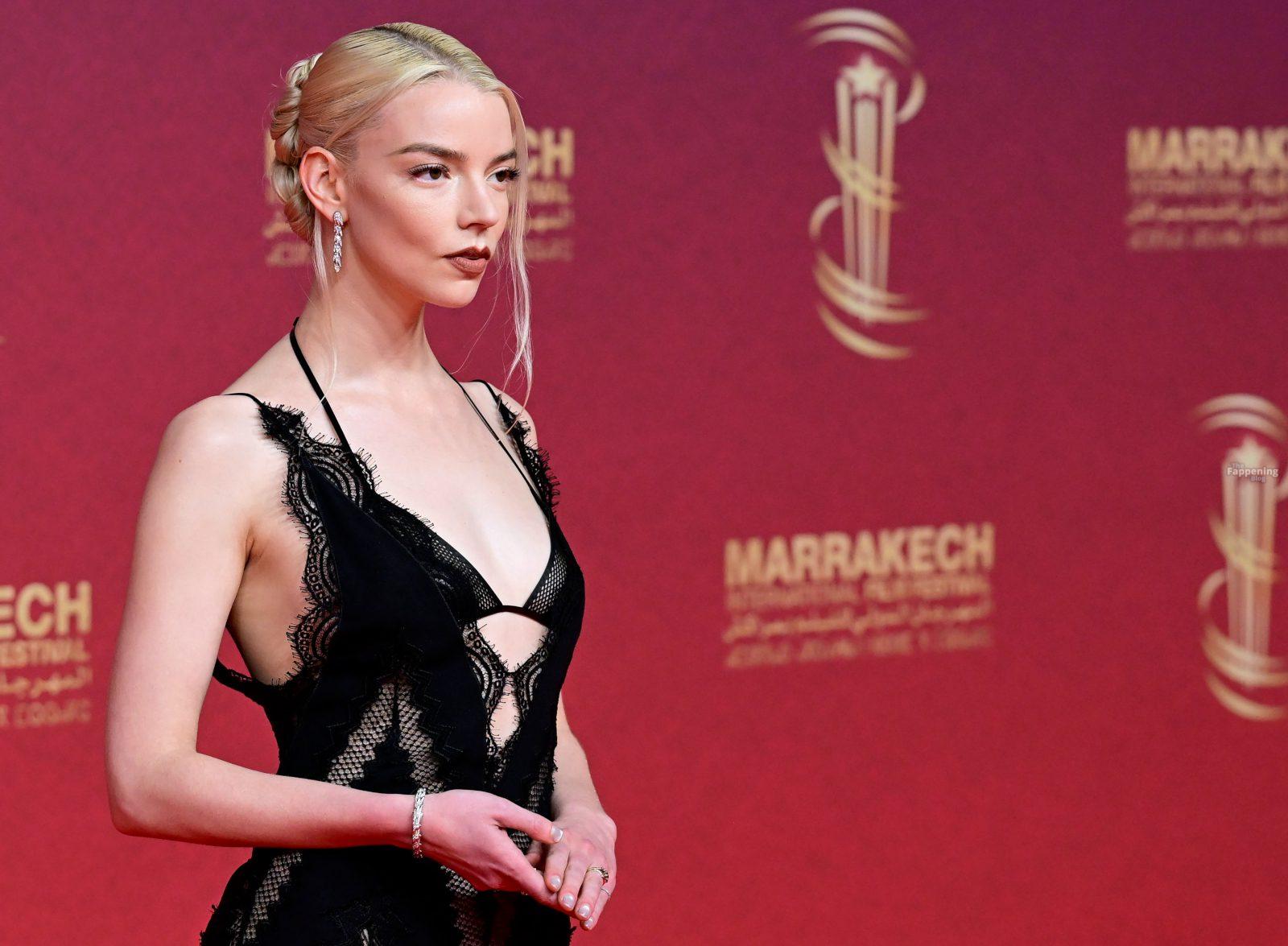 L’attrice statunitense Anya Taylor-Joy posa con un abito di pizzo trasparente che mostra le gambe sul tappeto rosso mentre arriva alla cerimonia di chiusura del 22º Festival del Cinema di Marrakech (FIFM) a Marrakech.