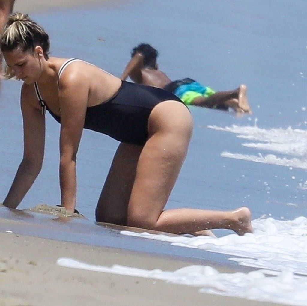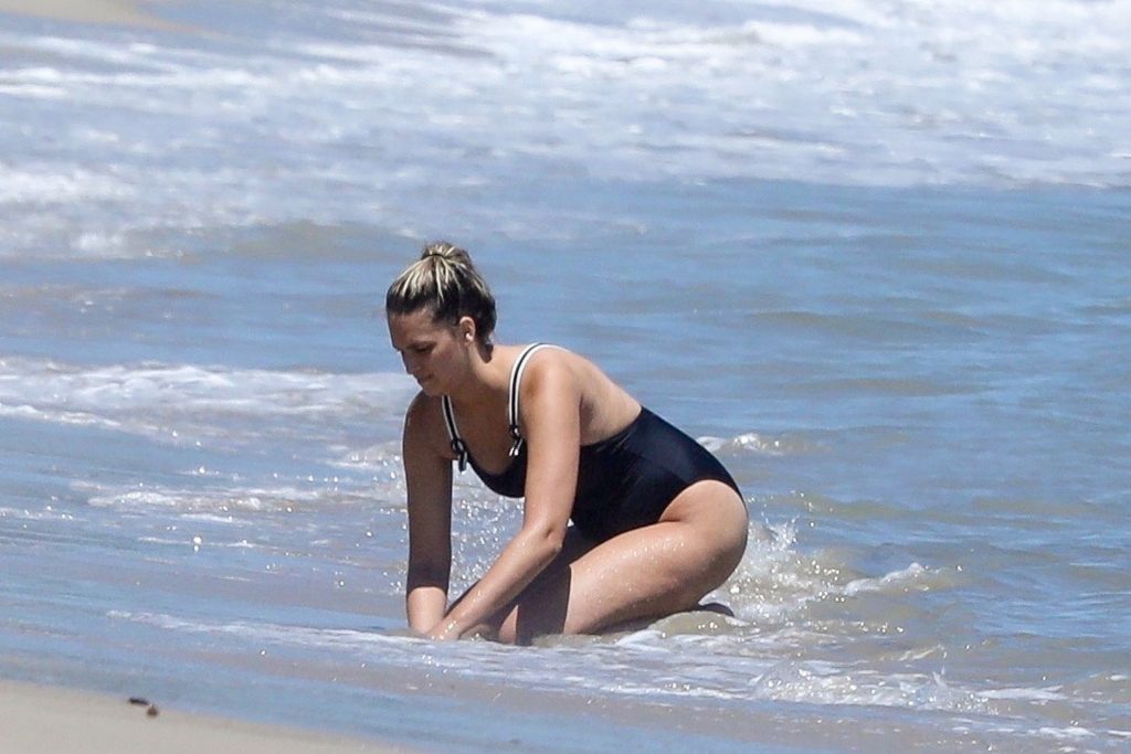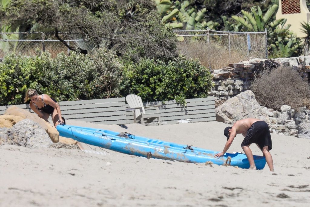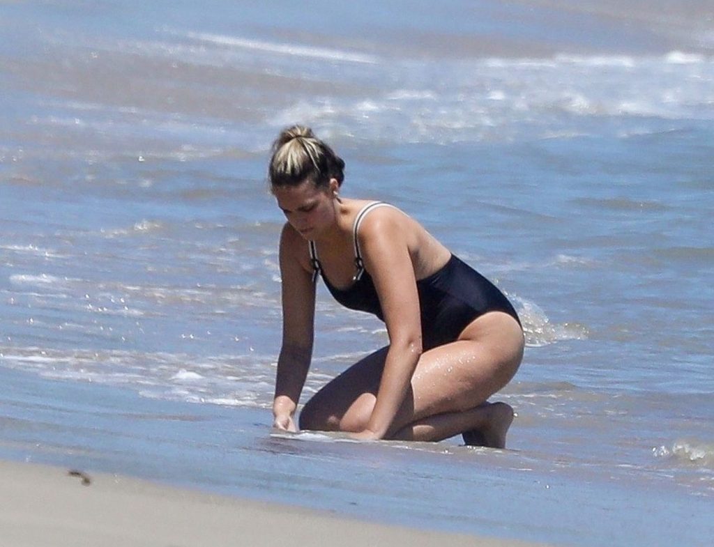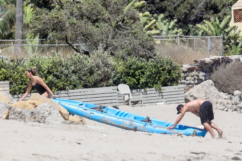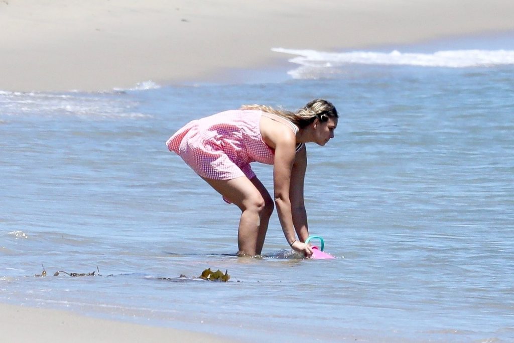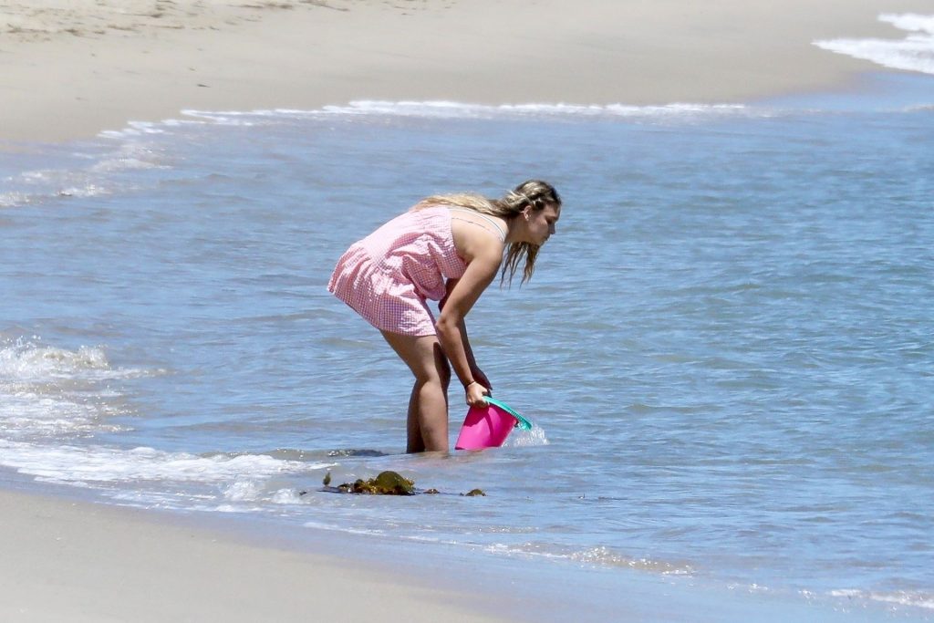 April cerca i granchi con sua figlia mentre i ragazzi giocano in acqua e su un kayak. April, che ha dato alla luce la figlia Lola Alain Thicke a febbraio 2019 e Mia Love a febbraio 2018, mette in mostra le sue curve con un semplice costume intero nero.
