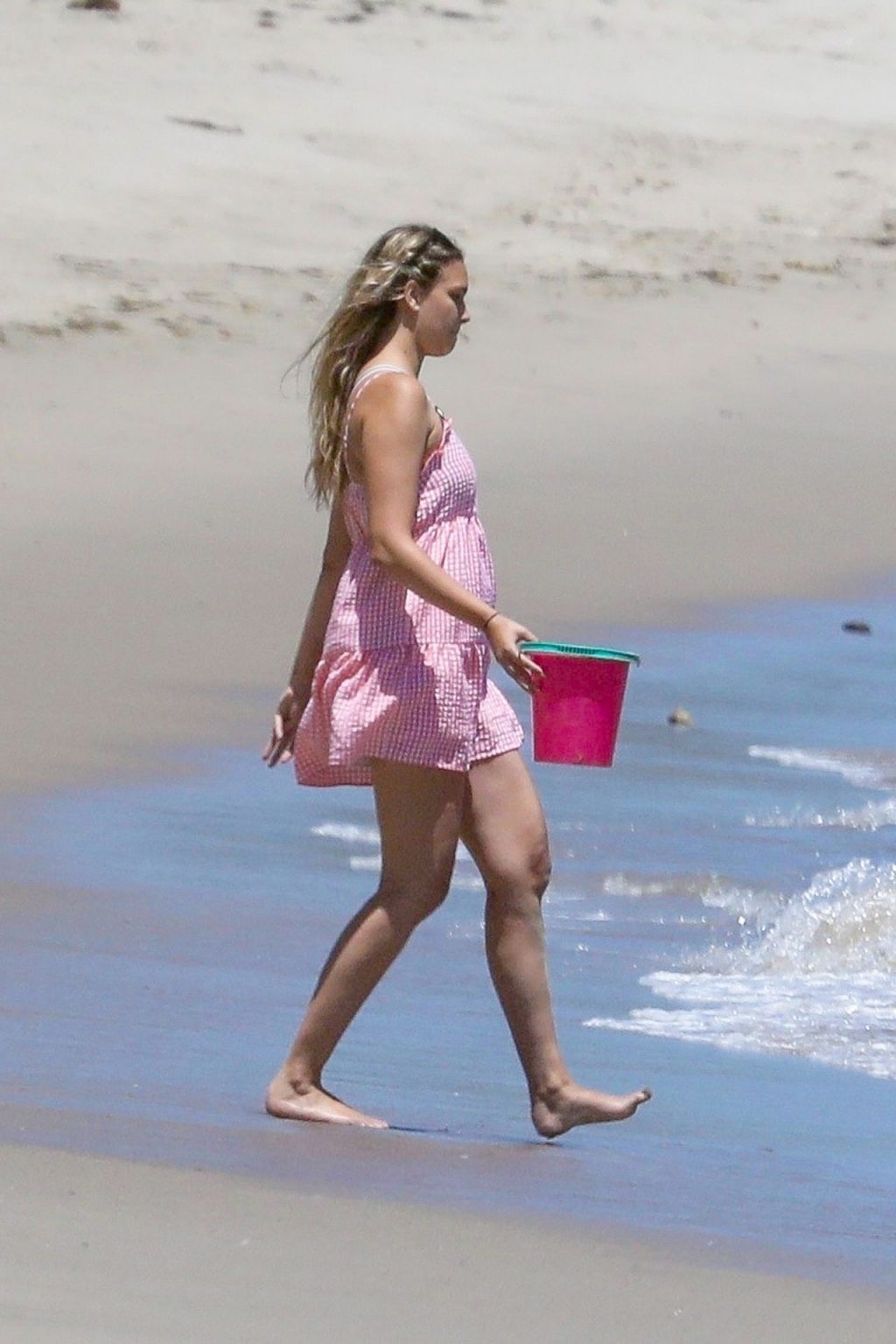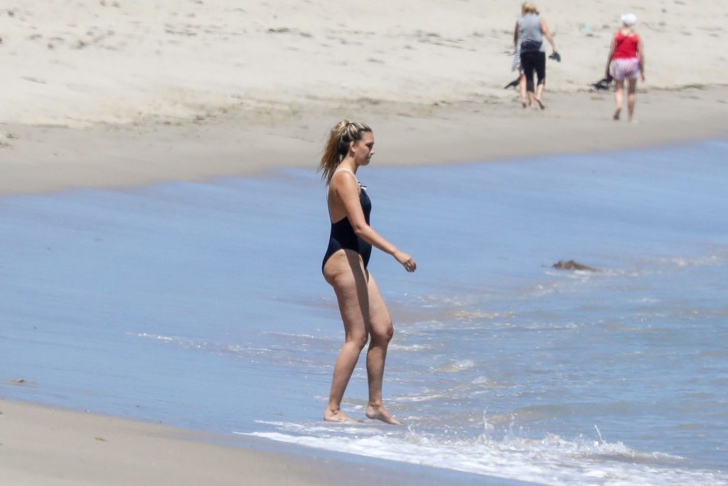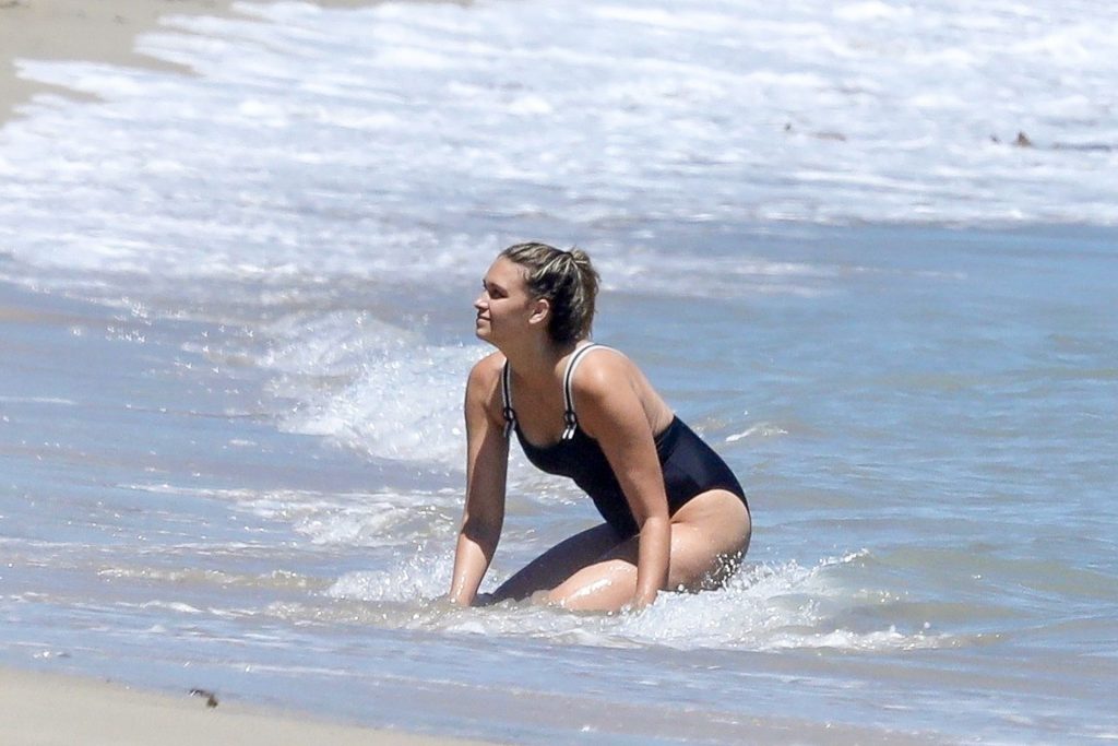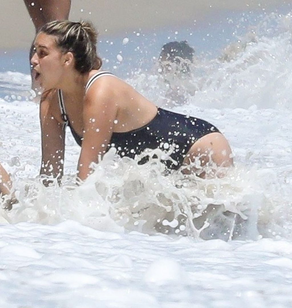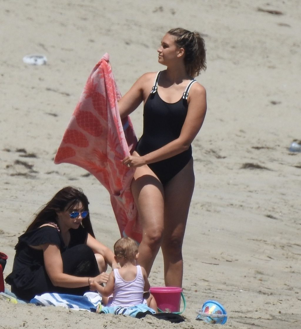 April cerca i granchi con sua figlia mentre i ragazzi giocano in acqua e su un kayak. April, che ha dato alla luce la figlia Lola Alain Thicke a febbraio 2019 e Mia Love a febbraio 2018, mette in mostra le sue curve con un semplice costume intero nero.