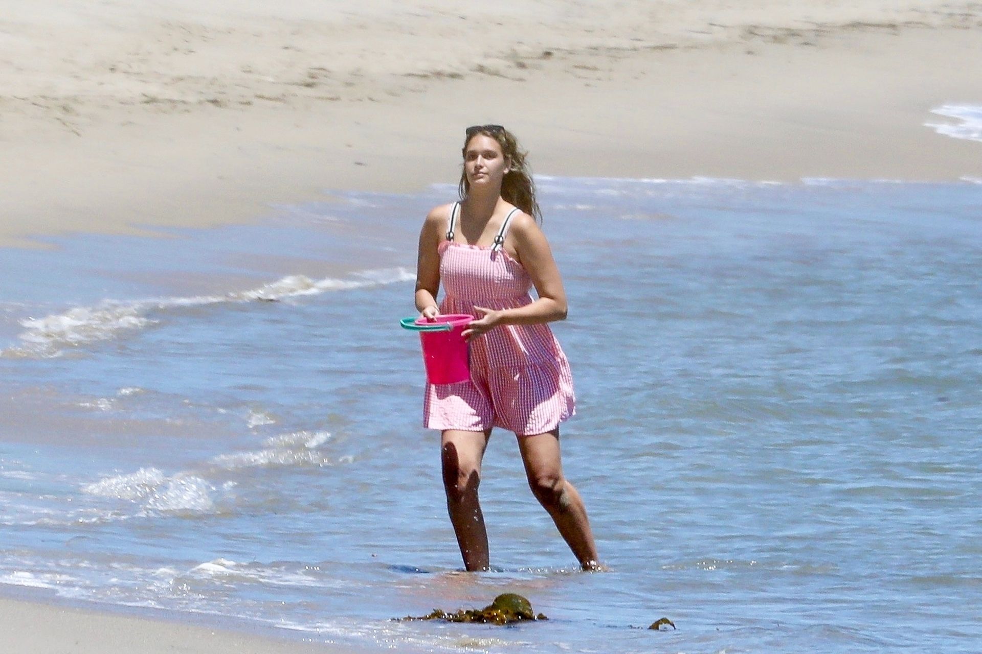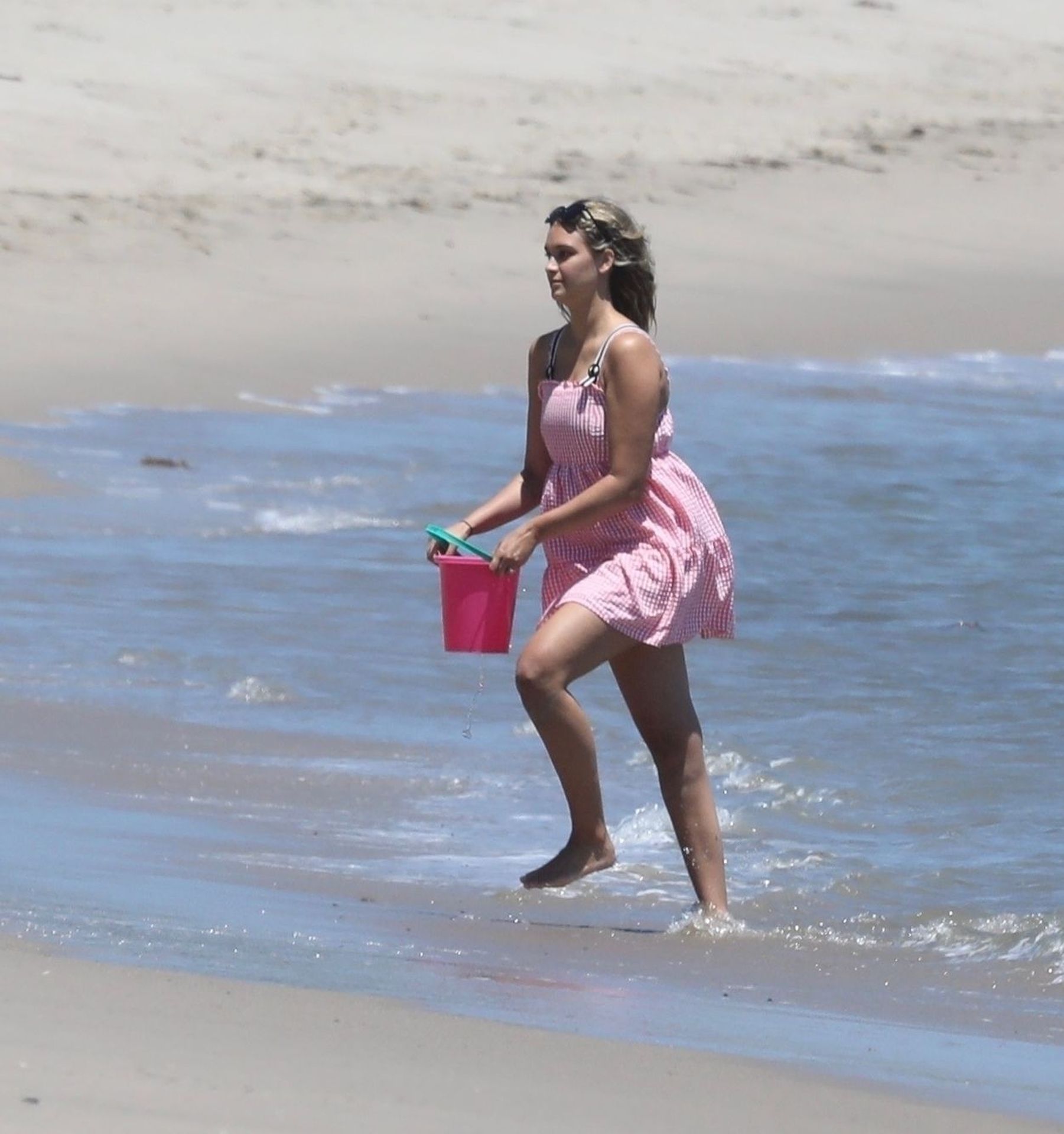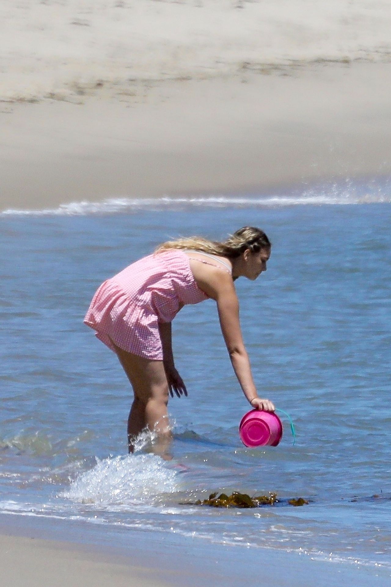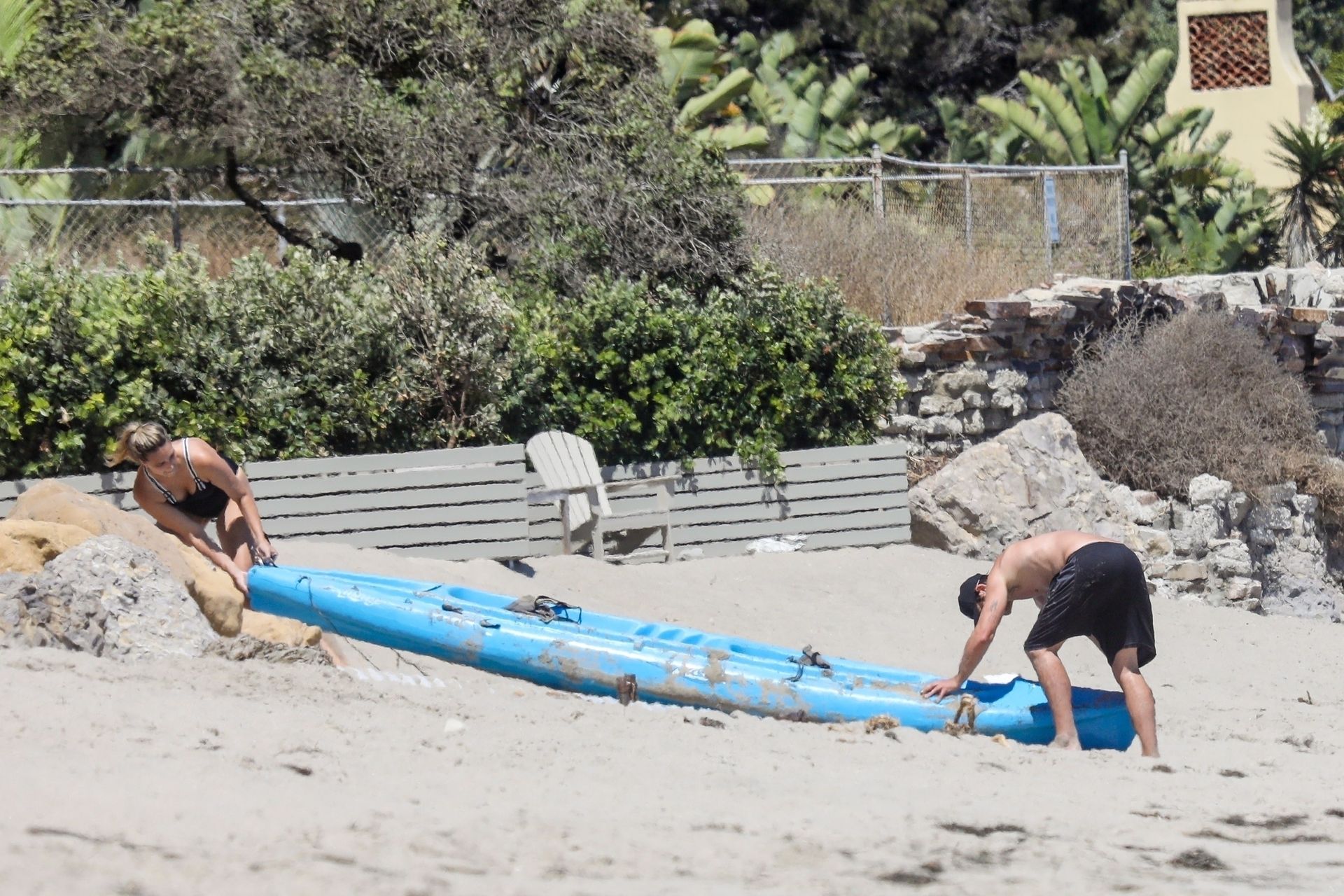 April cerca i granchi con sua figlia mentre i ragazzi giocano in acqua e su un kayak. April, che ha dato alla luce la figlia Lola Alain Thicke a febbraio 2019 e Mia Love a febbraio 2018, mette in mostra le sue curve con un semplice costume intero nero.