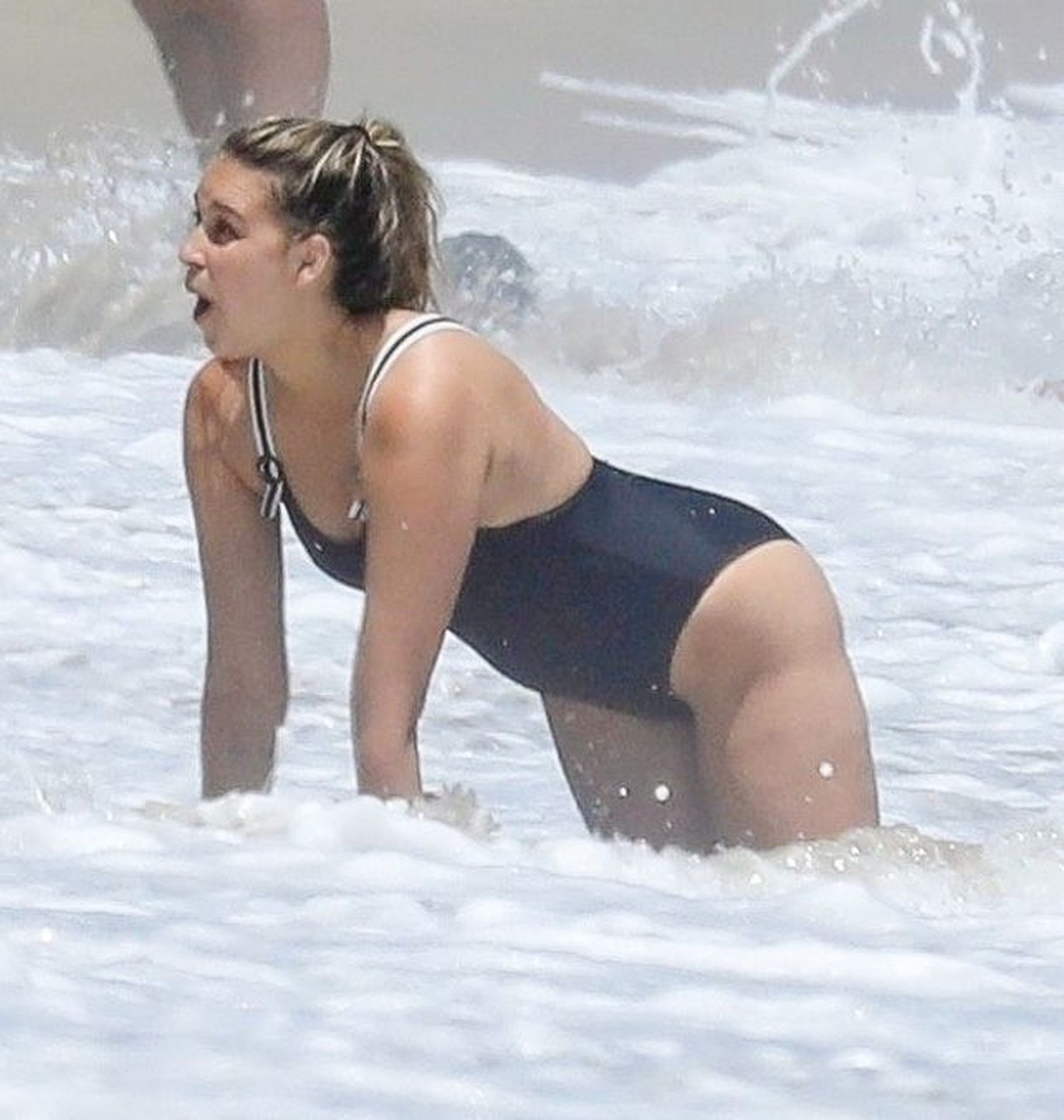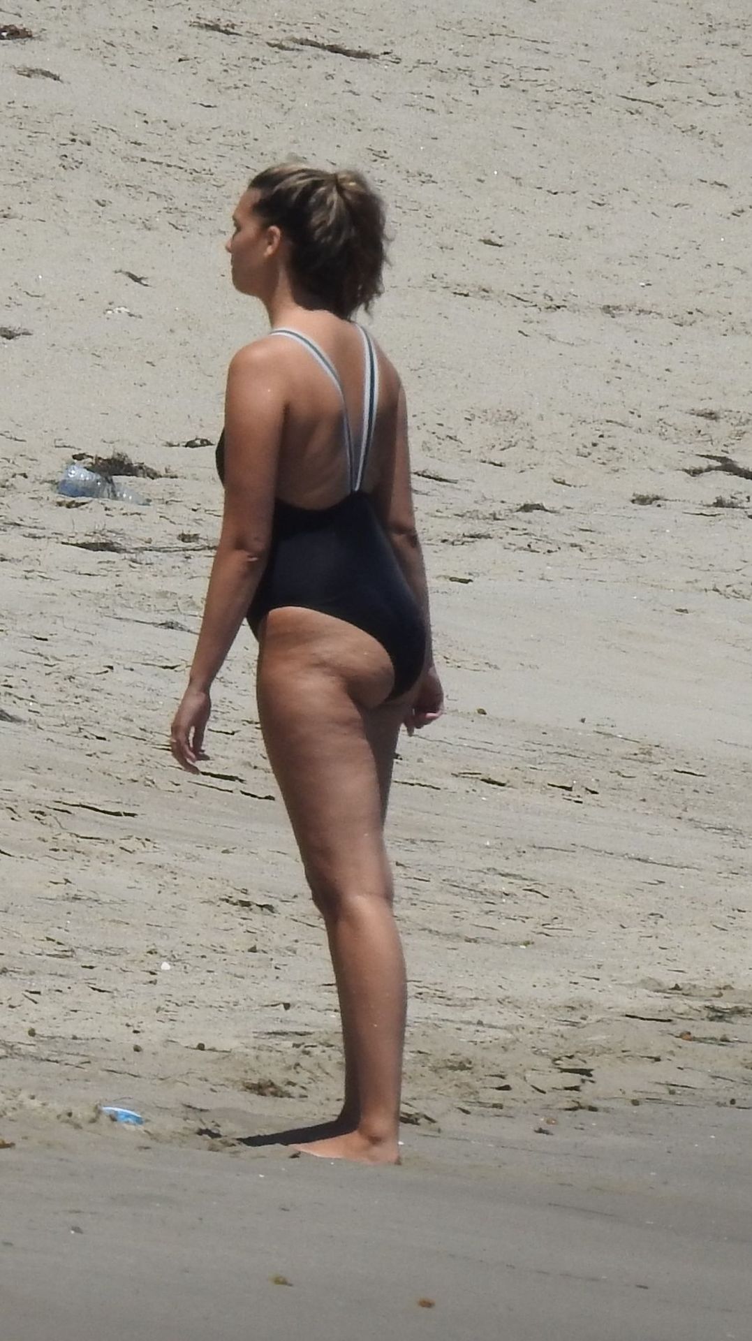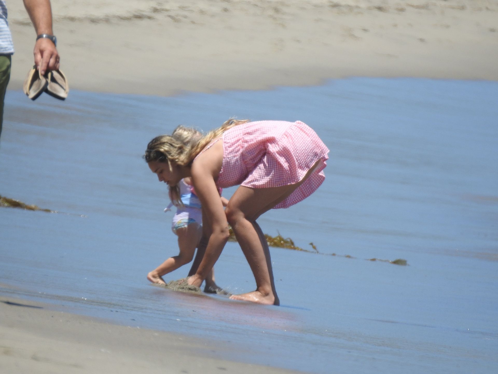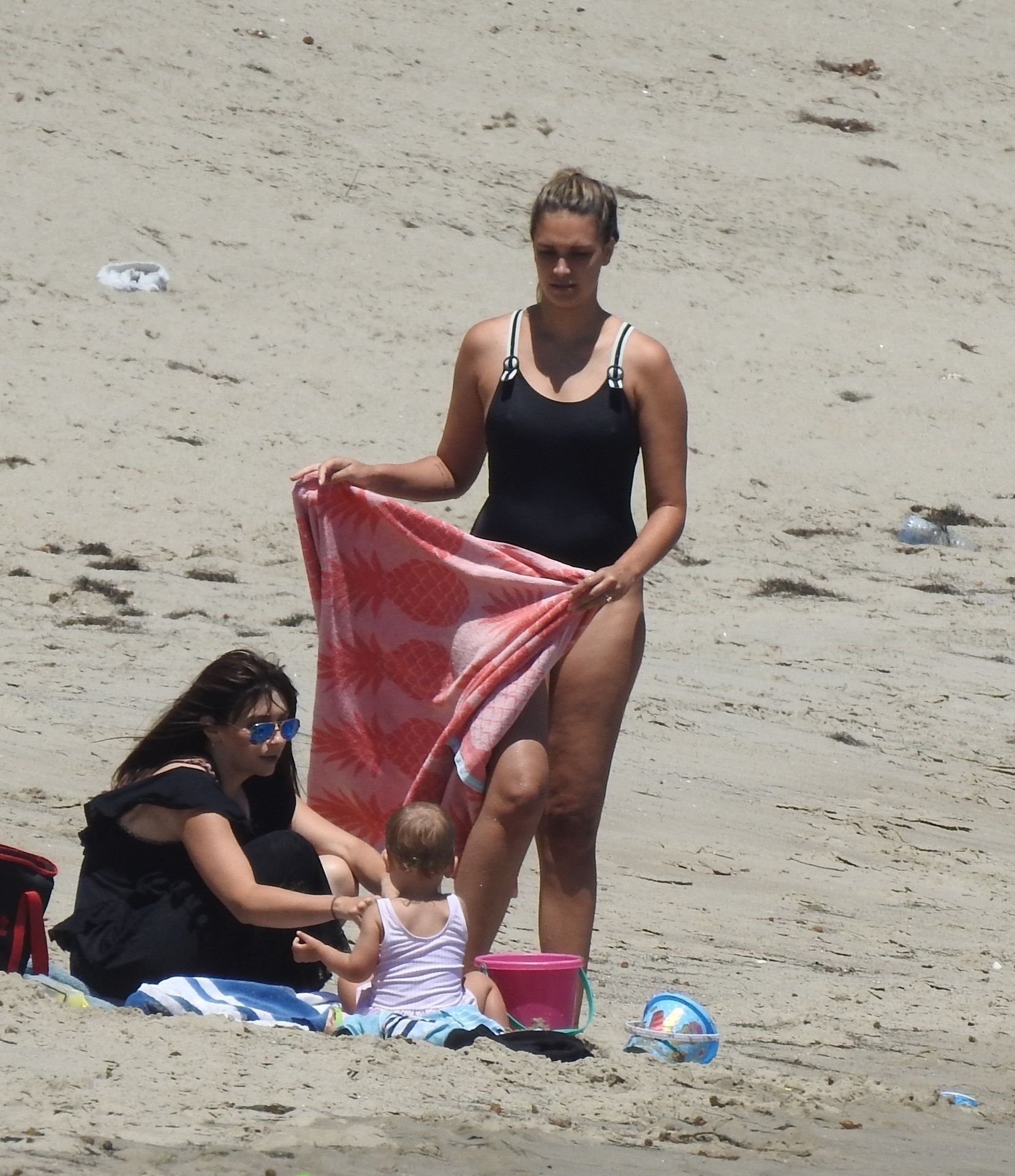 April cerca i granchi con sua figlia mentre i ragazzi giocano in acqua e su un kayak. April, che ha dato alla luce la figlia Lola Alain Thicke a febbraio 2019 e Mia Love a febbraio 2018, mette in mostra le sue curve con un semplice costume intero nero.